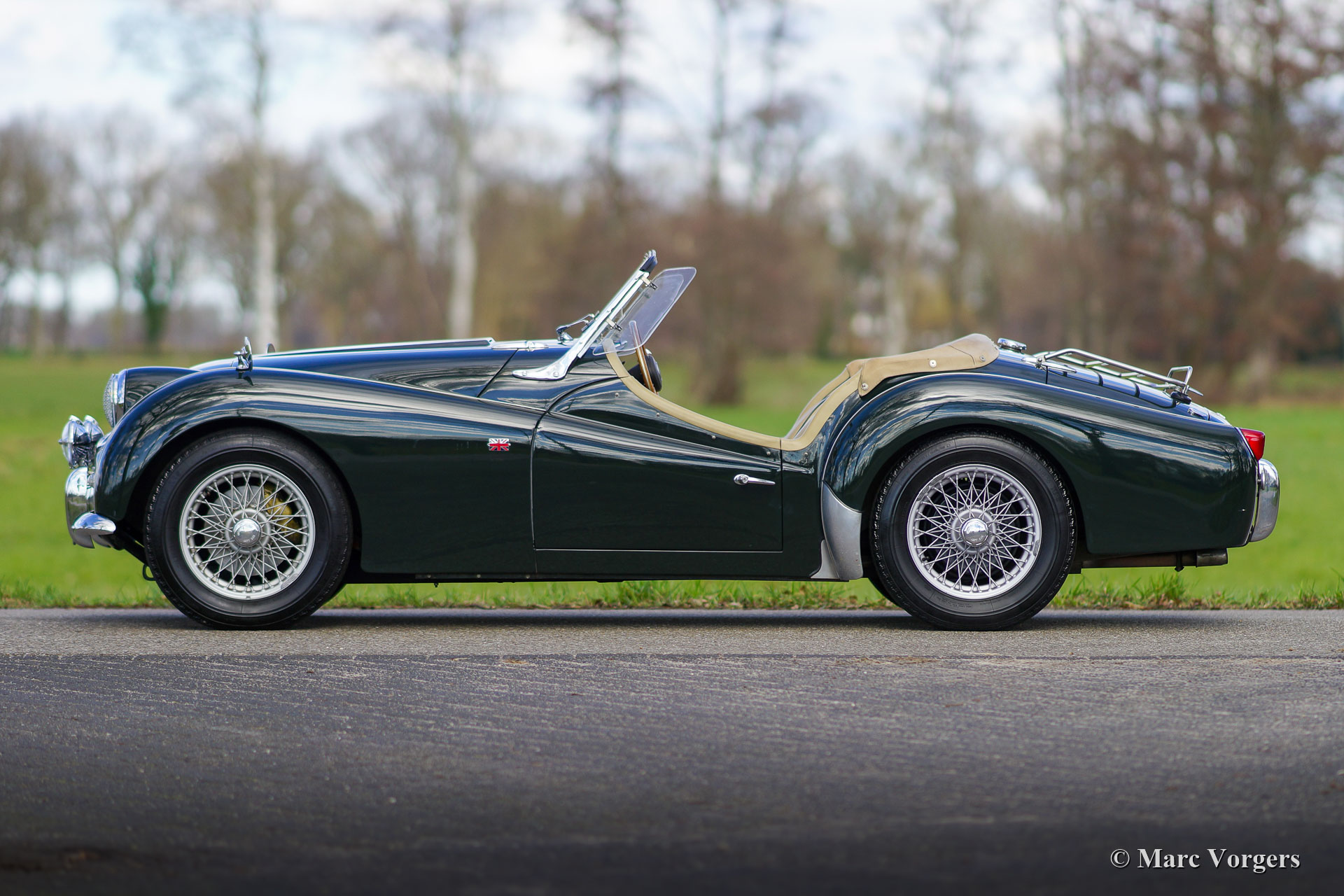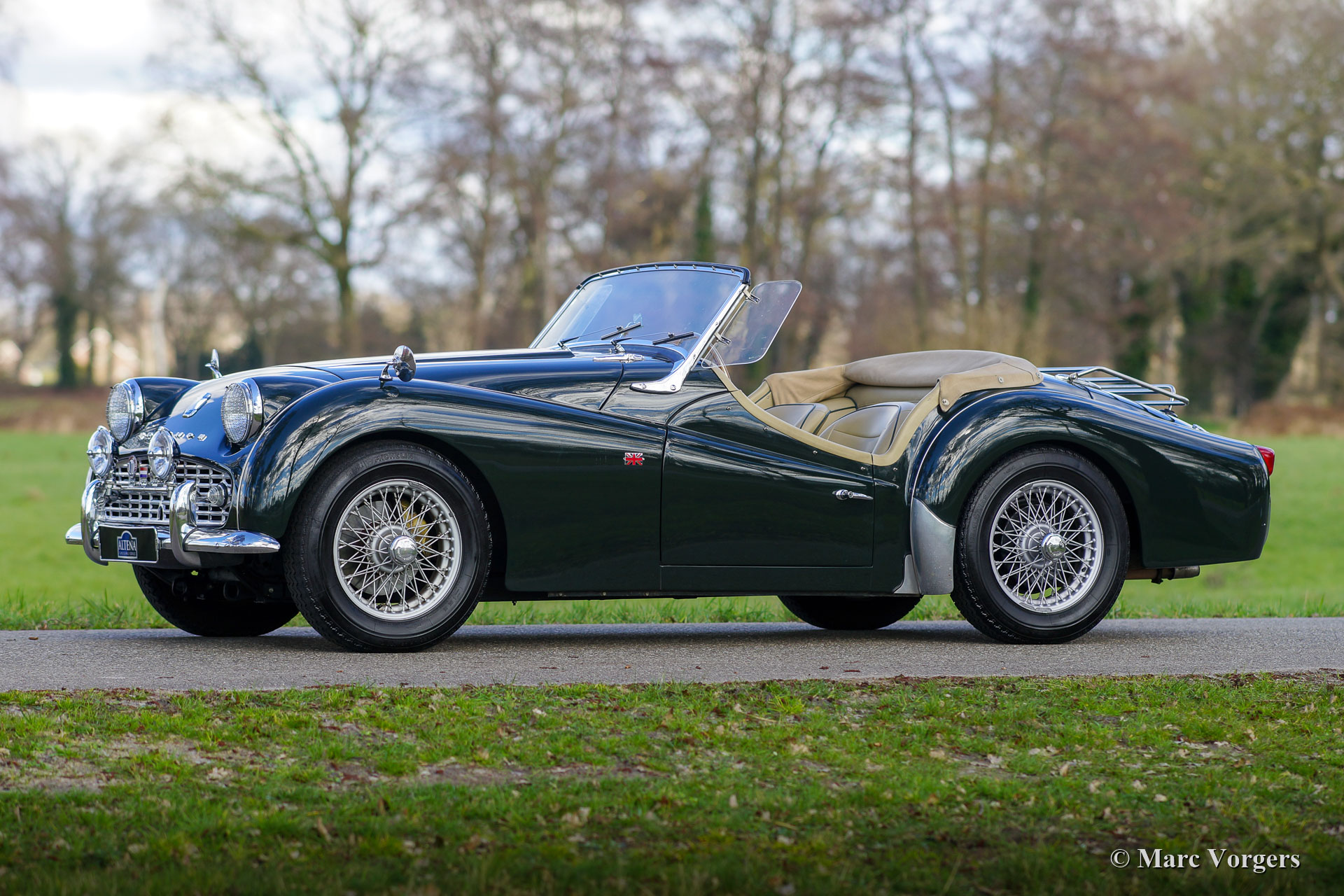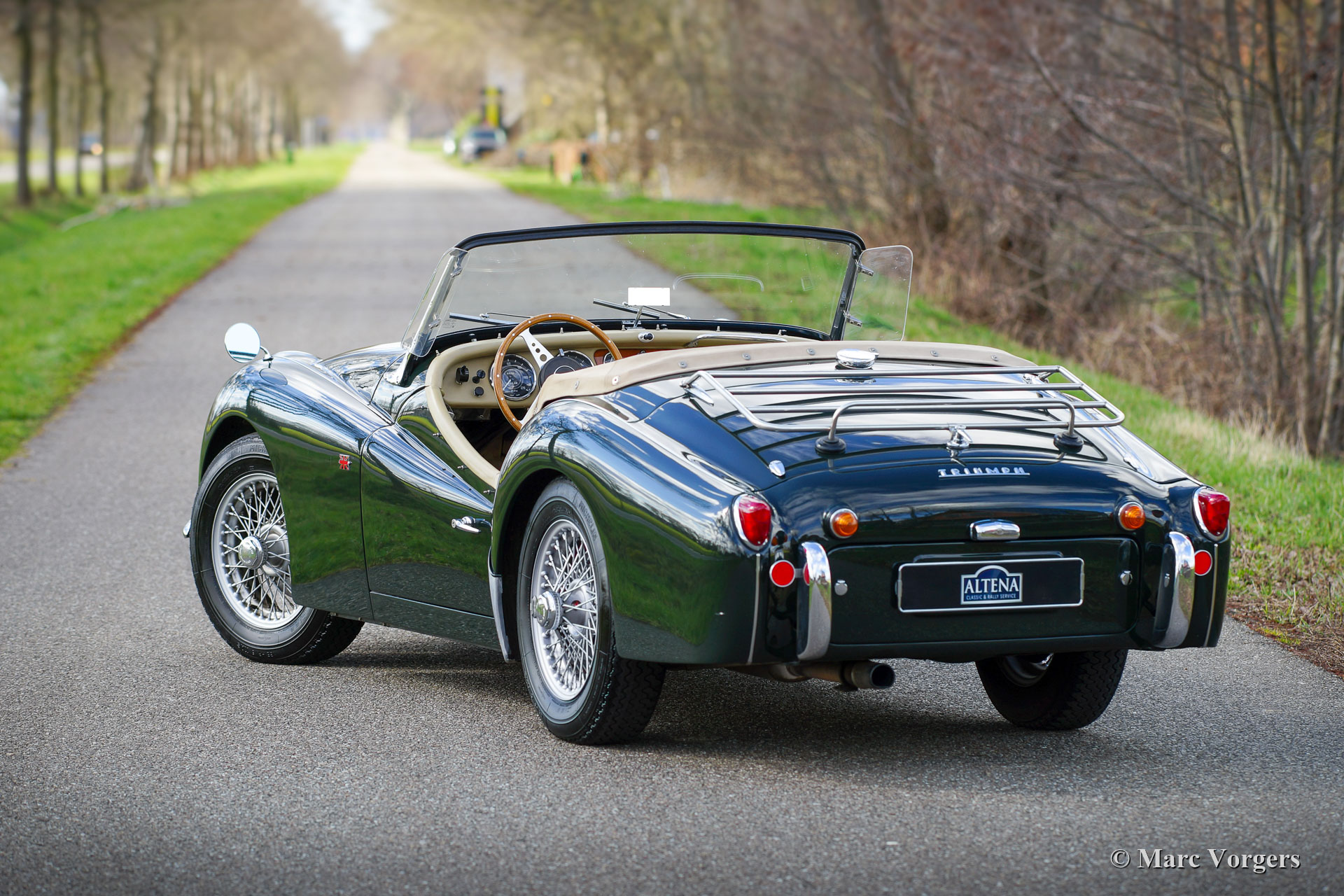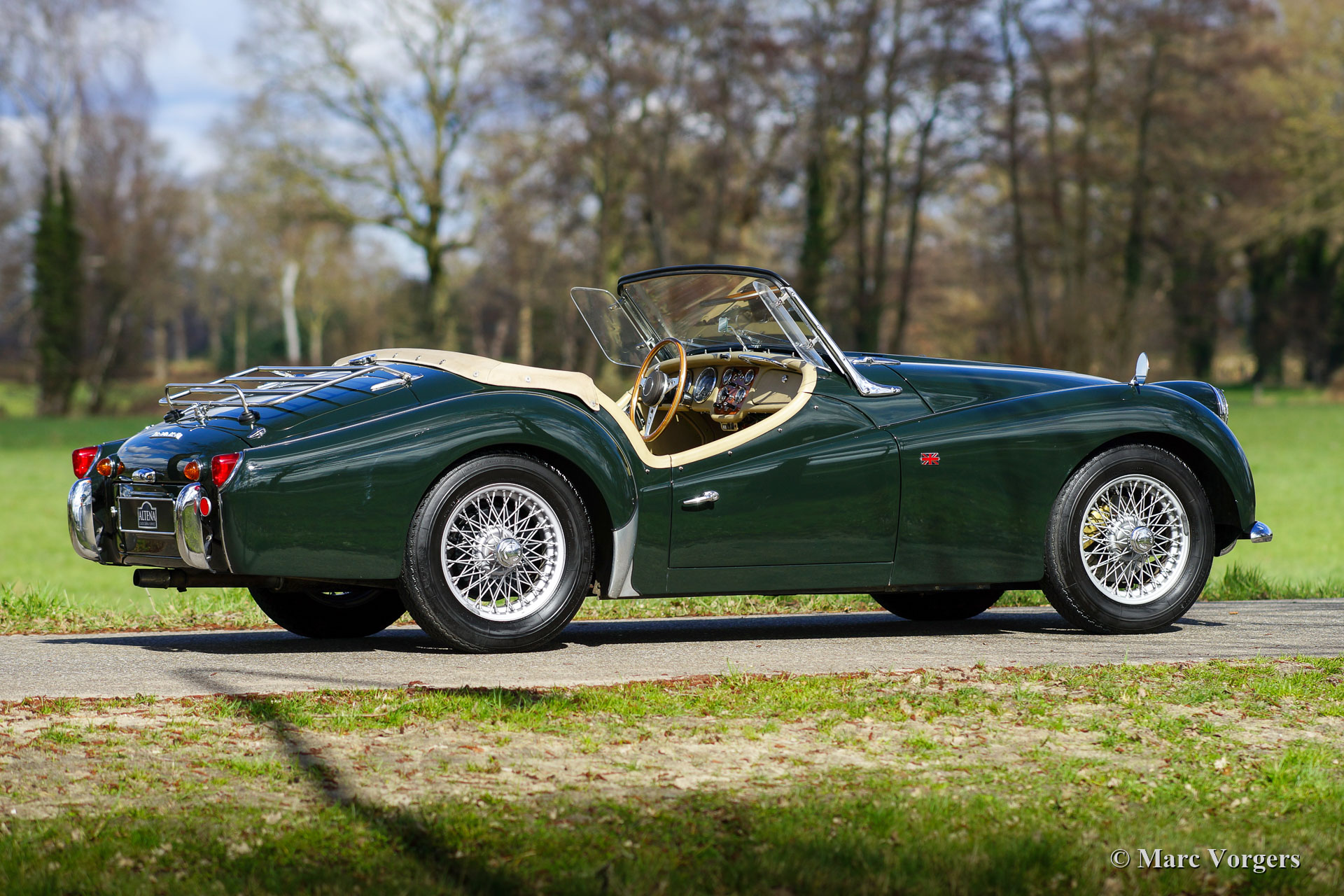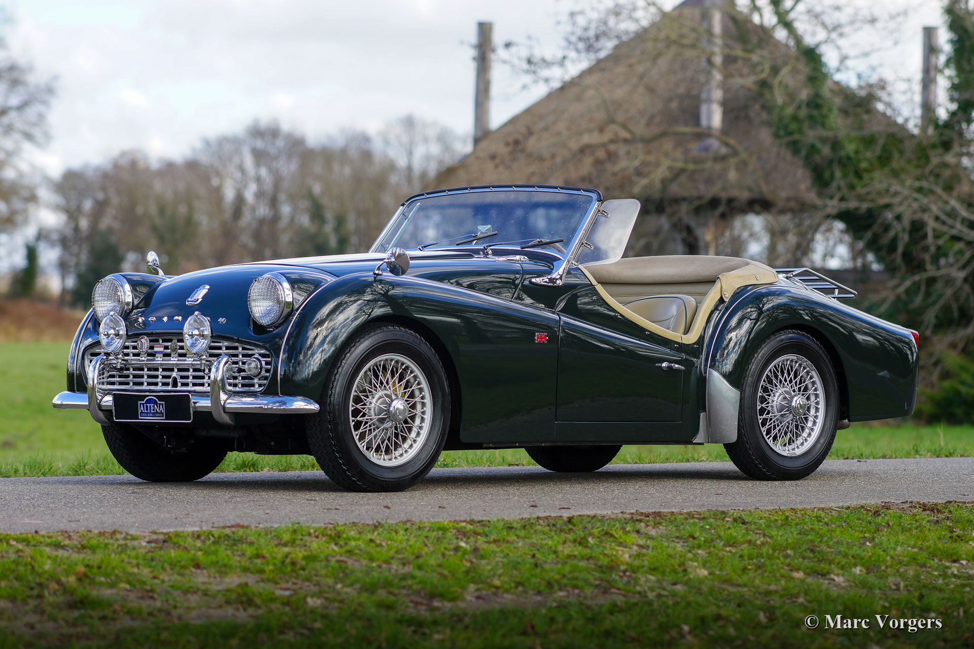 Triumph TR 3A, année 1958. Couleur British Racing Green combinée à un intérieur en cuir beige garni de passepoil vert foncé et de tapis beige. Capote en mohair beige, écrans latéraux beige, housse de tonneau et couvercle de capot beige, le tout en bel état de propreté. Cette fantastique Triumph TR 3A fut vendue neuve aux États-Unis. La voiture fut importée de Washington aux Pays-Bas en 1998. En 2000, la voiture fut restaurée détaillée à la perfection. Un reportage photo de la restauration est présent. La carrosserie montre un ajustement parfait du panneau et la voiture est solide. La restauration a été un travail minutieux et la voiture a été très bien entretenue et chérie depuis. Ce TR 3A est en excellent état avec seulement de légères traces d'utilisation antérieure à trouver. La voiture est équipée en usine d'un « overdrive » ! De plus, la voiture est équipée de roues à rayons peintes en argent chaussées de pneus Michelin 165/15, d'un volant sport MotoLita avec une jante en bois, d'un porte-bagages chromé et d'une barre de badges à l'avant avec plusieurs badges et des projecteurs Lucas SLR576 installés. Cette magnifique Triumph TR 3A offre une fantastique expérience de conduite classique à toit ouvert et est prête pour toute aventure entre les mains d'un nouveau propriétaire passionné.