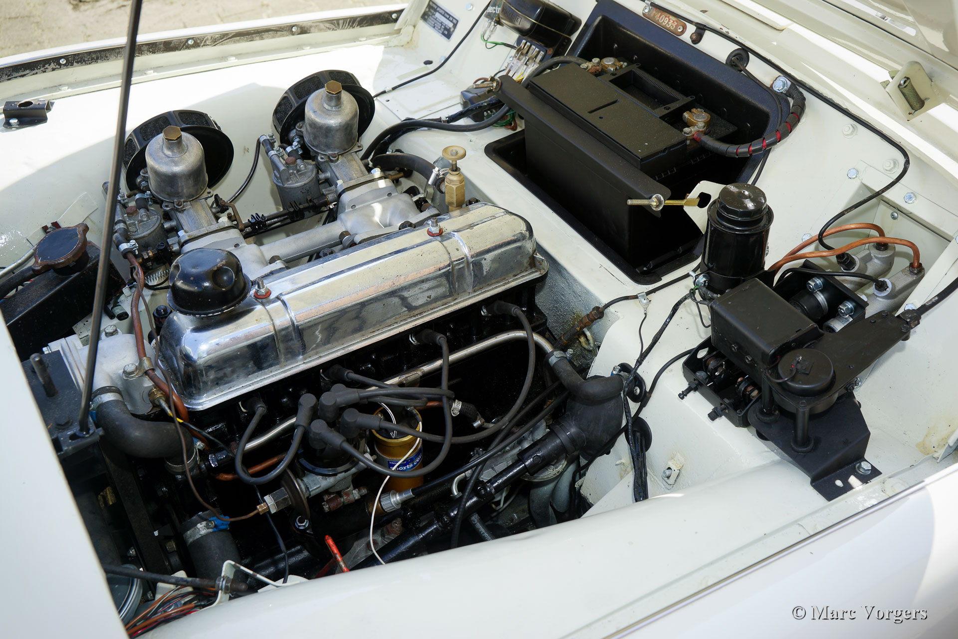 The Triumph TR 3 is a no nonsense sports car; very robust, simple and reliable, a true British sports car all over. The TR 3 was the first production car, off factory, equipped with disc brakes on the front-wheels. The engine was a Standard Vanguard based, cast-iron, long stroke, in-line four cylinder with a displacement of 1991cc. The TR 3 engine was equipped with two carburettors giving a power-output of almost 100 bhp.