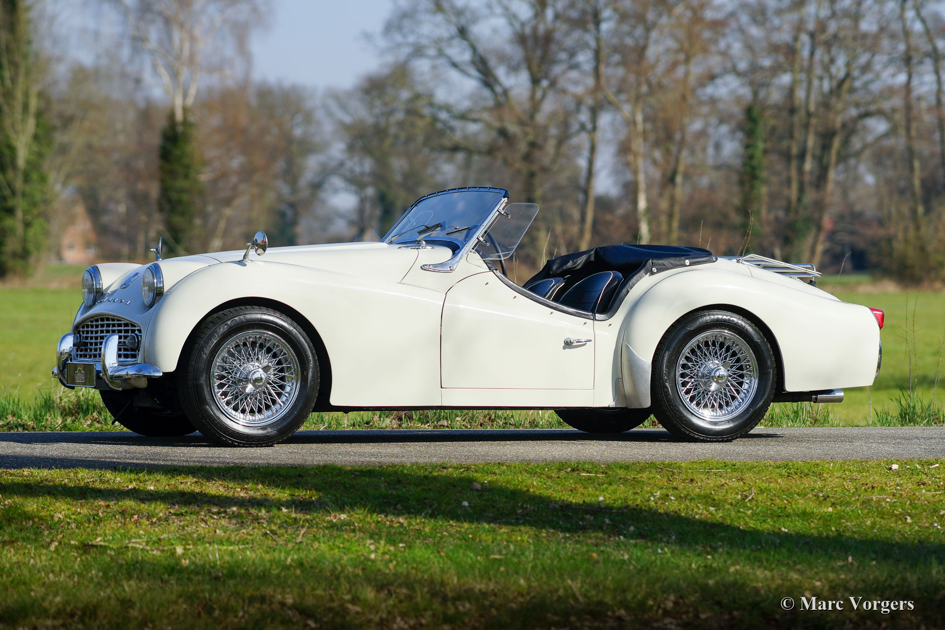 Triumph TR 3a, année 1958. Couleur blanc (Old English white) combinée à un intérieur en similicuir noir bordé de passepoil blanc et de moquette noire. Capote, housse de capote et couvre-tonneau en vinyle noir. Cette belle Triumph TR 3a fut vendue neuve aux USA. La voiture fut repeinte aux États-Unis il y a trois décennies, et elle fut exportée aux Pays-Bas en 1994. Depuis cette année, la voiture n'a connu qu'un seul propriétaire néerlandais passionné qui a apprécié la voiture jusqu'en 2022 (pendant 27 ans !). Le TR 3a a été bien entretenu au fil des ans. La voiture est dans un bon état et très original. L'intérieur est entièrement d'origine et très bon, le compartiment moteur est très propre et mécaniquement tout est à jour. Cette TR 3a est une vraie voiture de conducteur et elle montre des signes d'utilisation et d'âge, une belle patine vintage. La voiture montre tous les détails d'origine, et elle est équipée de roues à rayons chromées avec de beaux écrous de roue à oreilles. Il s'agit d'un TR 3a très désirable, abordable et fiable pour le conducteur passionné de TR !