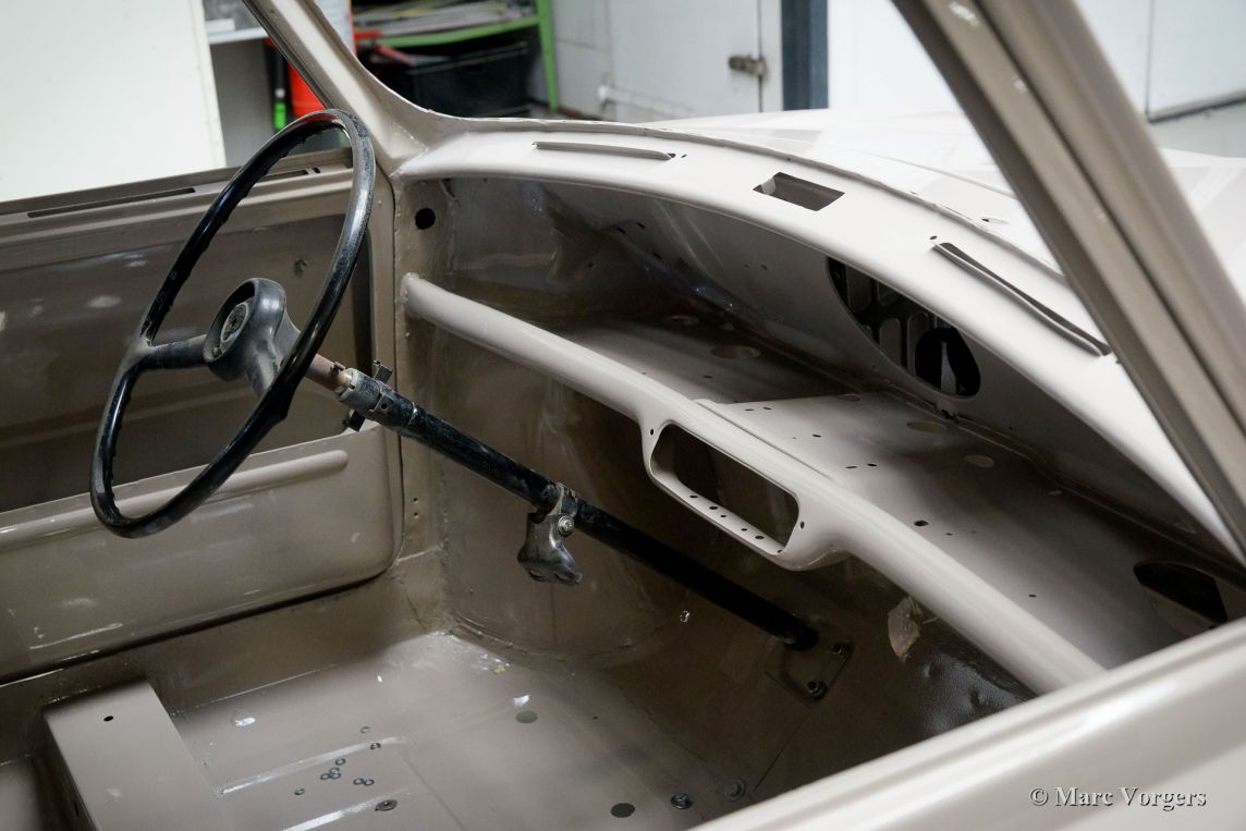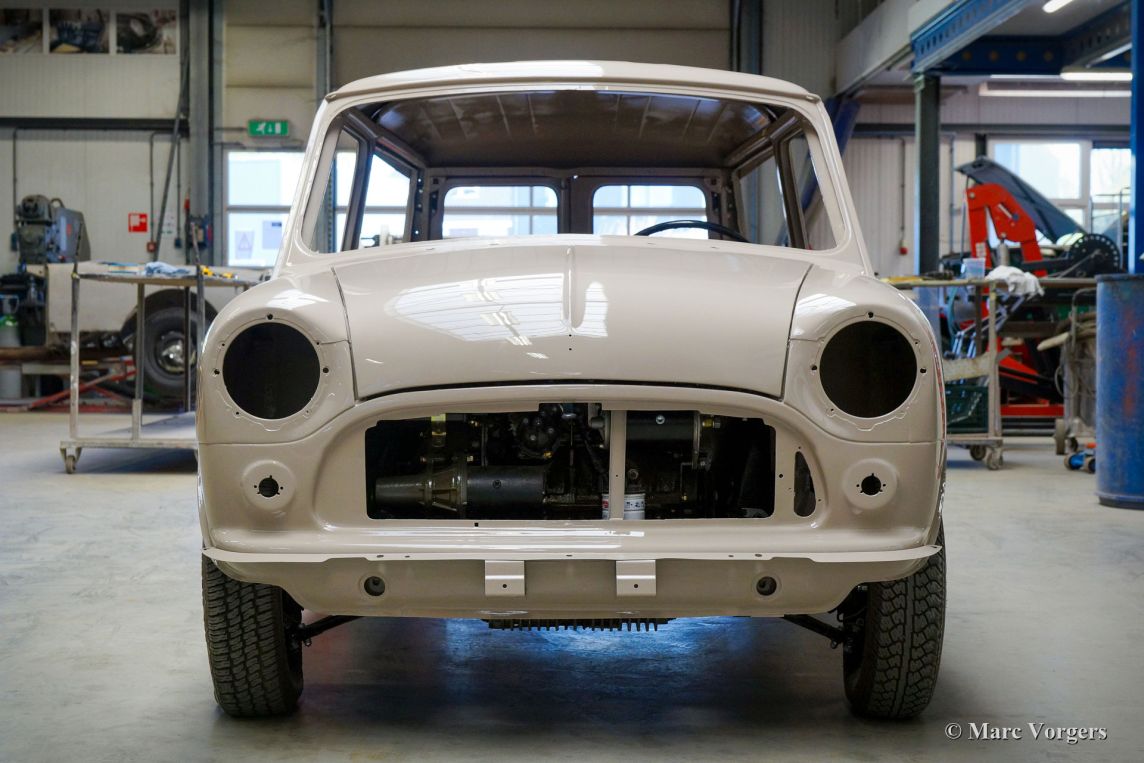 Ce fantastique Austin Mini Countryman est en cours de restauration en profondeur par Classic Job. La voiture était entièrement dépouillée et les travaux de tôlerie furent effectués. Dans le même temps, toutes les pièces mécaniques furent restaurées et révisées à l'état neuf. La carrosserie fut restaurée à partir du métal nu et peinte dans une magnifique nuance de gris clair d’origine à l'intérieur et à l'extérieur. La suspension et le moteur furent installés et la voiture est maintenant terminée. En ce moment, de nouvelles garnitures en bois sont fabriquées pour les côtés arrière de la carrosserie.