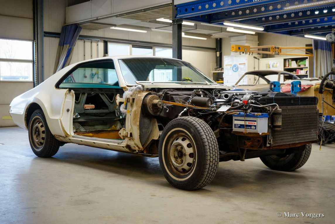 Cette impressionnante Oldsmobile Toronado de 1966 de la première série a subi des réparations de carrosserie et a ensuite été repeinte chez Classic Job. La voiture a été mise à nu par le propriétaire néerlandais. Après l'achèvement de la phase de tôlerie, la carrosserie a été lissée et peinte dans une couleur métallisée dorée originale Oldsmobile Toronado : « champagne mist ». Le travail est maintenant terminé. L'Oldsmobile sera bientôt restituée au propriétaire qui achèvera la restauration.