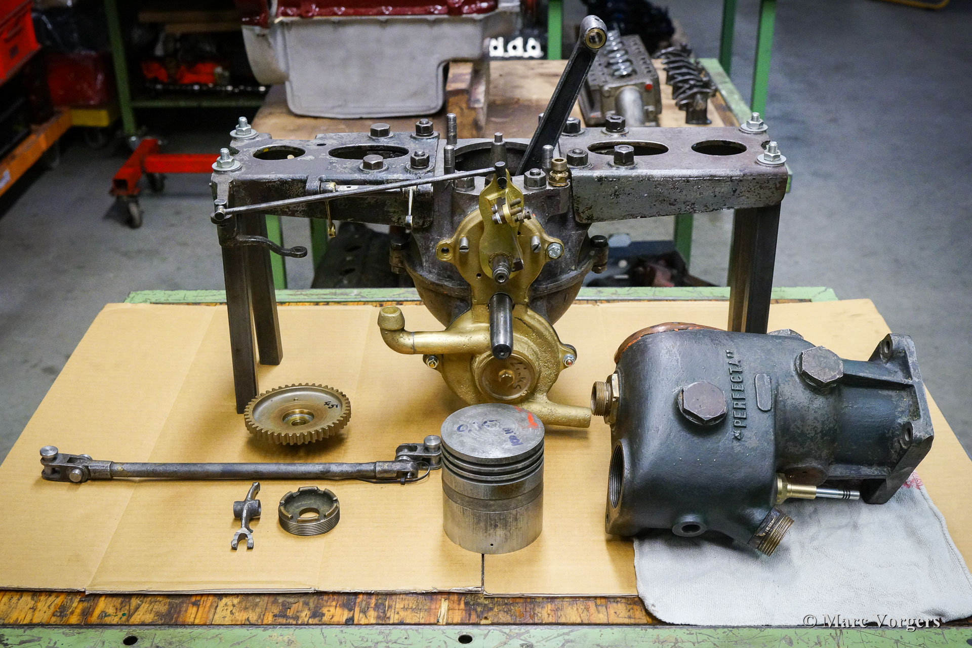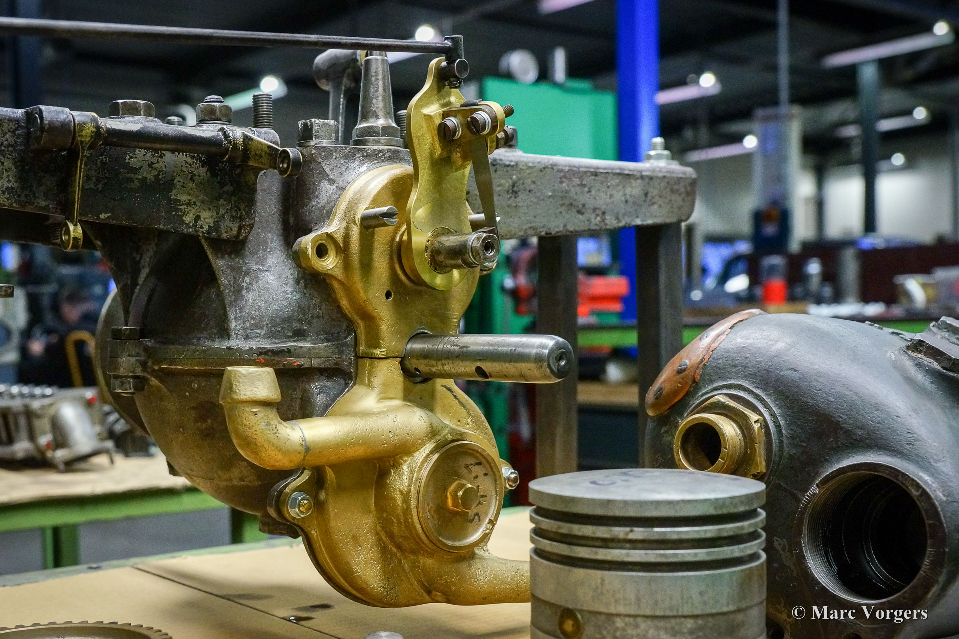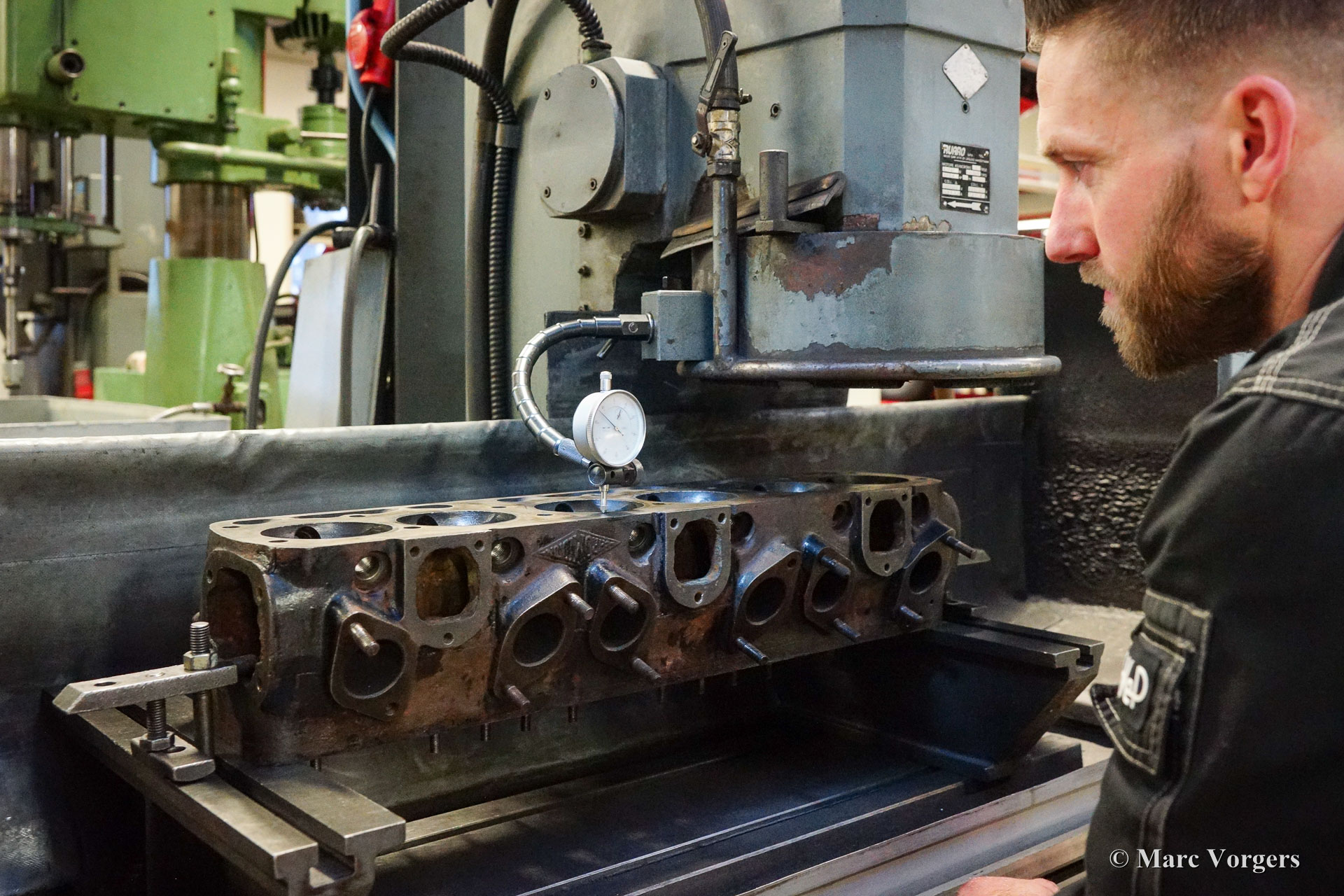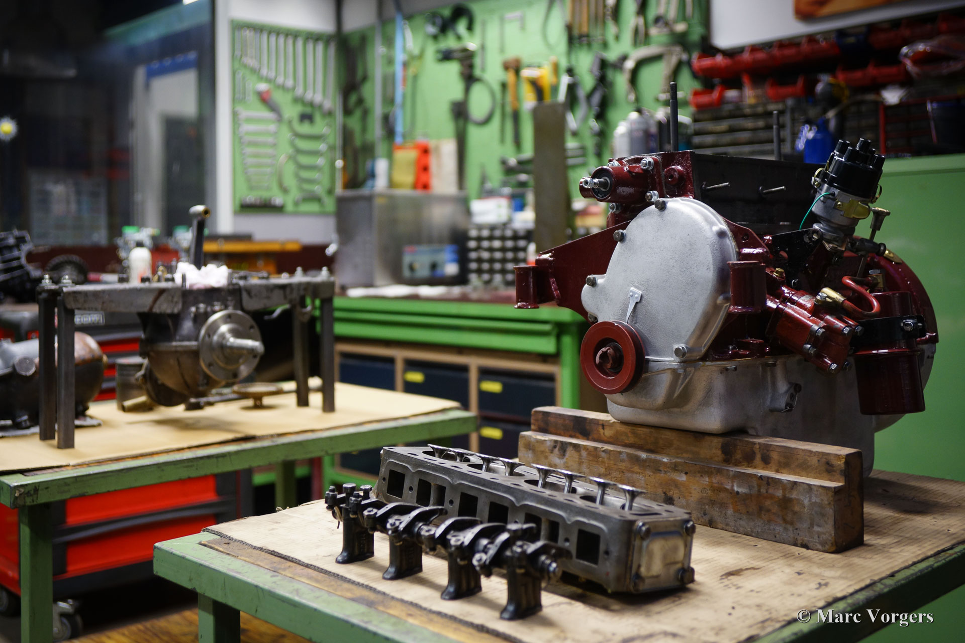 D'abord, vous voyez un moteur Darracq 1 cylindre de 1901 qui est entièrement révisé. Pour ce moteur, de nombreuses pièces devaient être fabriquées à la main dans l'atelier. Les nouvelles pièces devaient être tournées et coulées (sable). Deuxièmement, vous voyez un moteur Citroën DS 21 DX3 entièrement reconstruit. Ce moteur a l'air plus brillant que l'original, le propriétaire a préféré voir des pièces polies sur son moteur. Ensuite, vous voyez un moteur Meadows d'avant-guerre à six cylindres qui appartient à une Invicta de 4,5 litres. Le bloc moteur fut entièrement révisé et sur les photos, vous voyez l'un des mécaniciens travailler sur la culasse. Ensuite, vous voyez des photos de pièces appartenant à un Facel Vega FV4; la culasse et la boîte de vitesses. Le moteur est en cours de révision et le travail sur la boîte de vitesses est terminé. Les images suivantes présentent un moteur à quatre cylindres MG TB XPAG en cours de révision et le moteur complètement fini et prêt à être livré au propriétaire. Le moteur MG TB a également été réglé par Classic Job. Le moteur a reçu un taux de compression plus élevé, des soupapes plus grandes ont été montées et un arbre à cames ‘plus rapide’ fut installé. Tout cela a abouti à une puissance de sortie d'environ 85 ch. Le dernier moteur de cette présentation est également prêt à être livré à son fier propriétaire. C'est une unité Fiat Abarth très spéciale qui a également été entièrement révisée et mise au point.