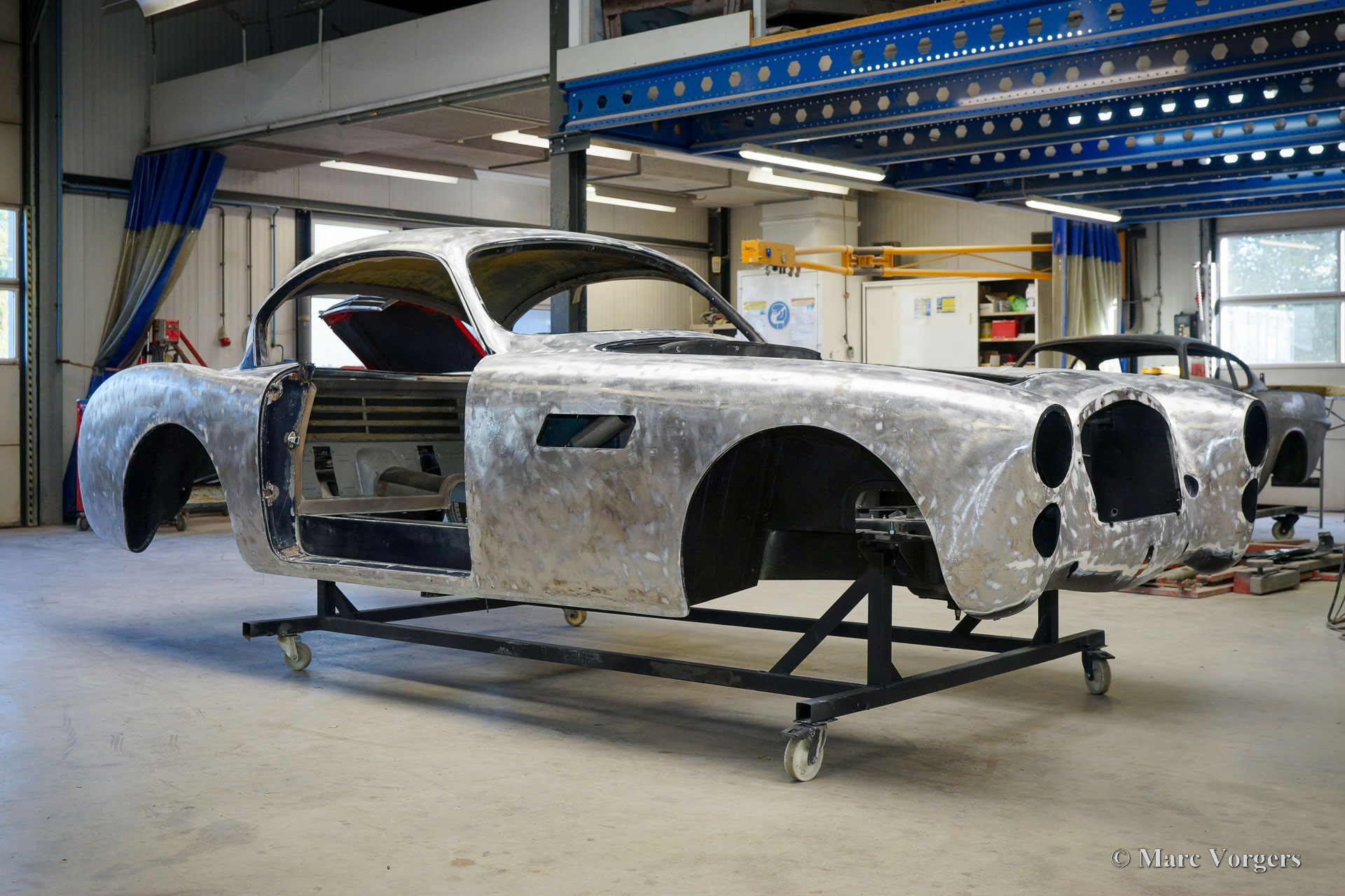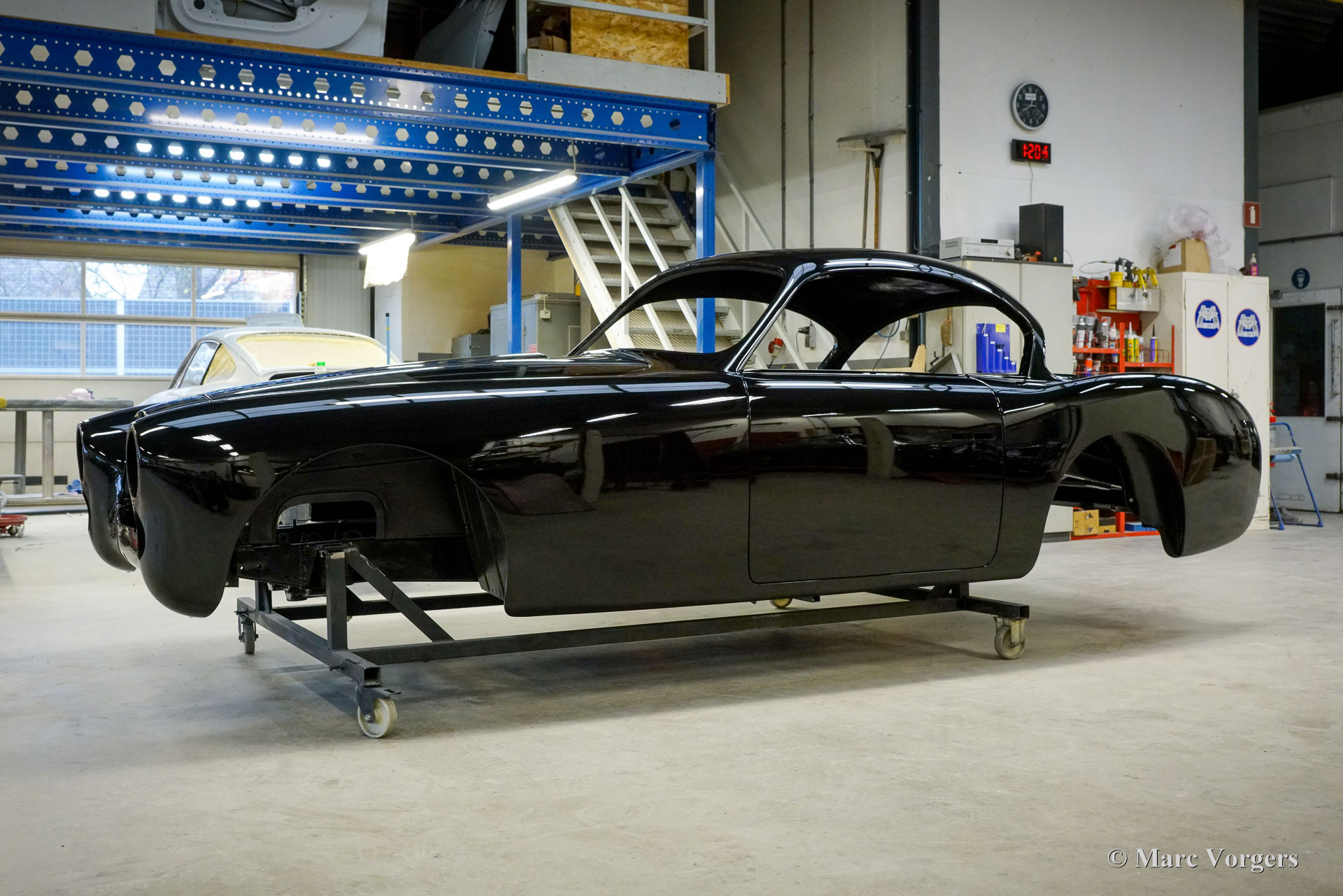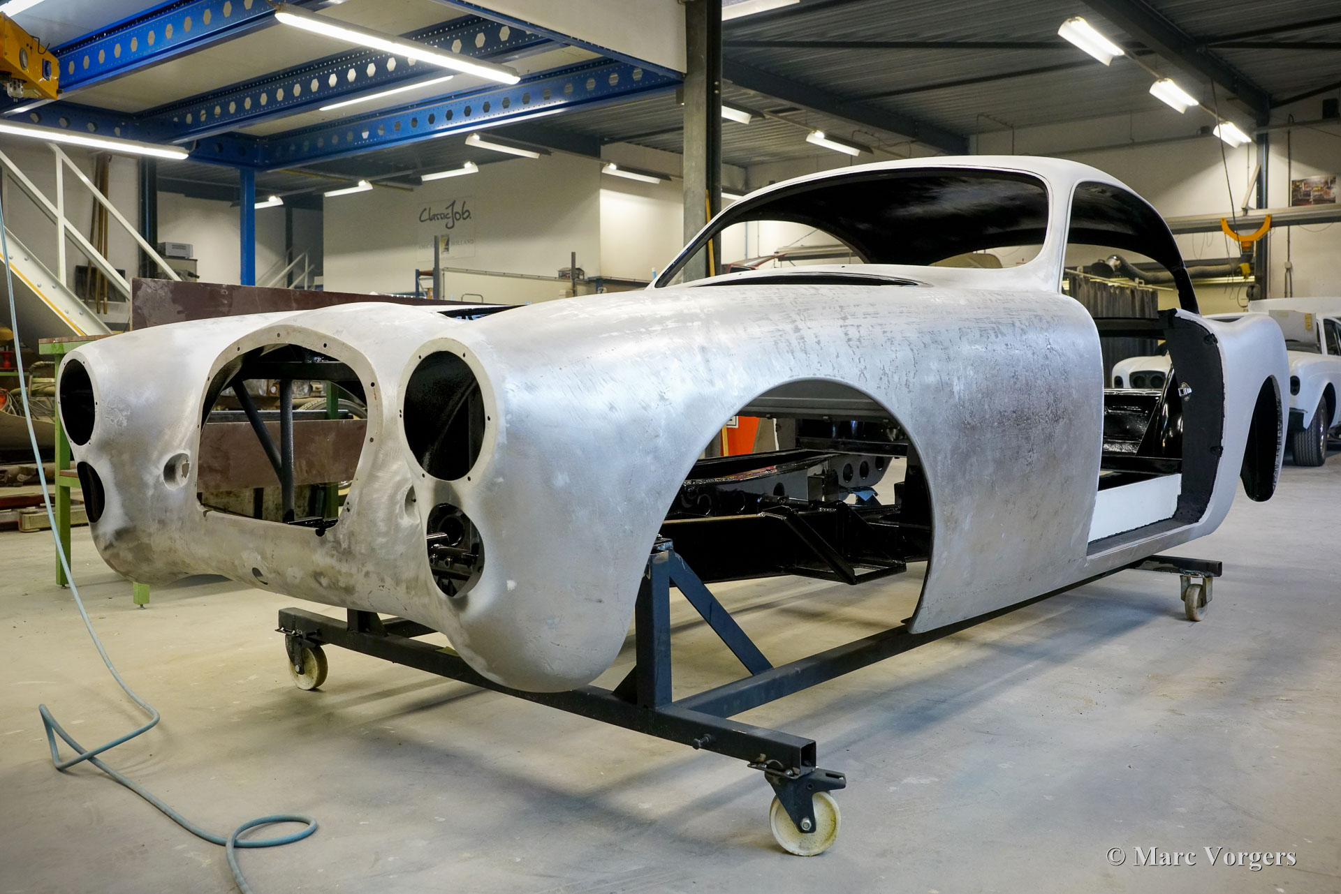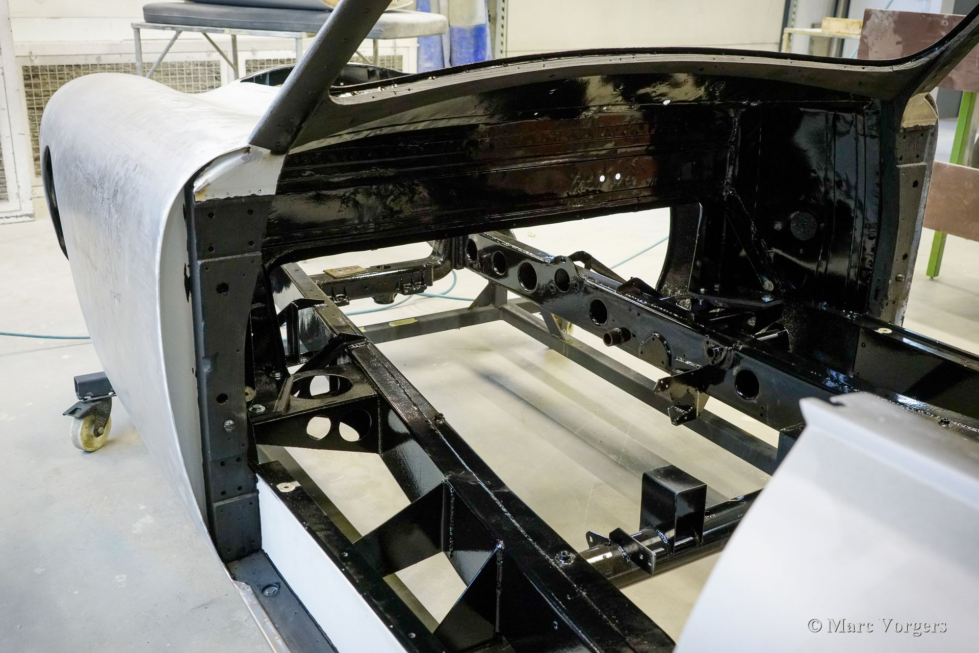 Au début des années 1950, la Talbot Lago Grand Sport était la meilleure et la plus rapide des voitures construites en France. L'automobile présentée quitte l'usine Talbot Lago le 30 décembre 1954 pour être livrée à un client français. La voiture était livrée en noir combiné avec un intérieur en cuir beige. Les extras étaient des roues chromées et des pneus Dunlop à flancs blancs. Classic Job a été mandaté par un client suisse pour restaurer la carrosserie et le châssis de cette magnifique automobile de première classe. La carrosserie est finie dans un magnifique noir profond. Ci-dessous vous voyez la carrosserie juste après la peinture. Les dernières étapes seront effectuées une fois la voiture terminée en Suisse (revêtement de peinture et revêtement en verre/céramique qui est incontournable sur la peinture noire).