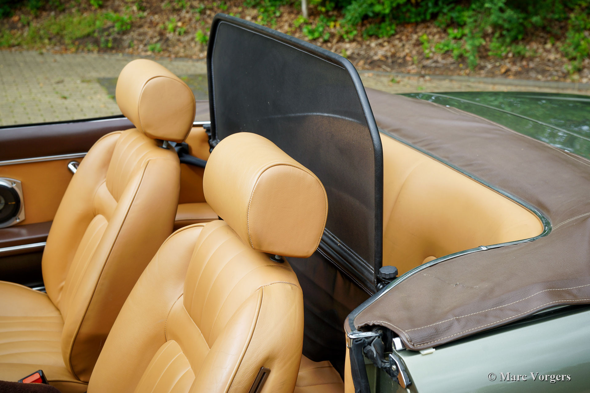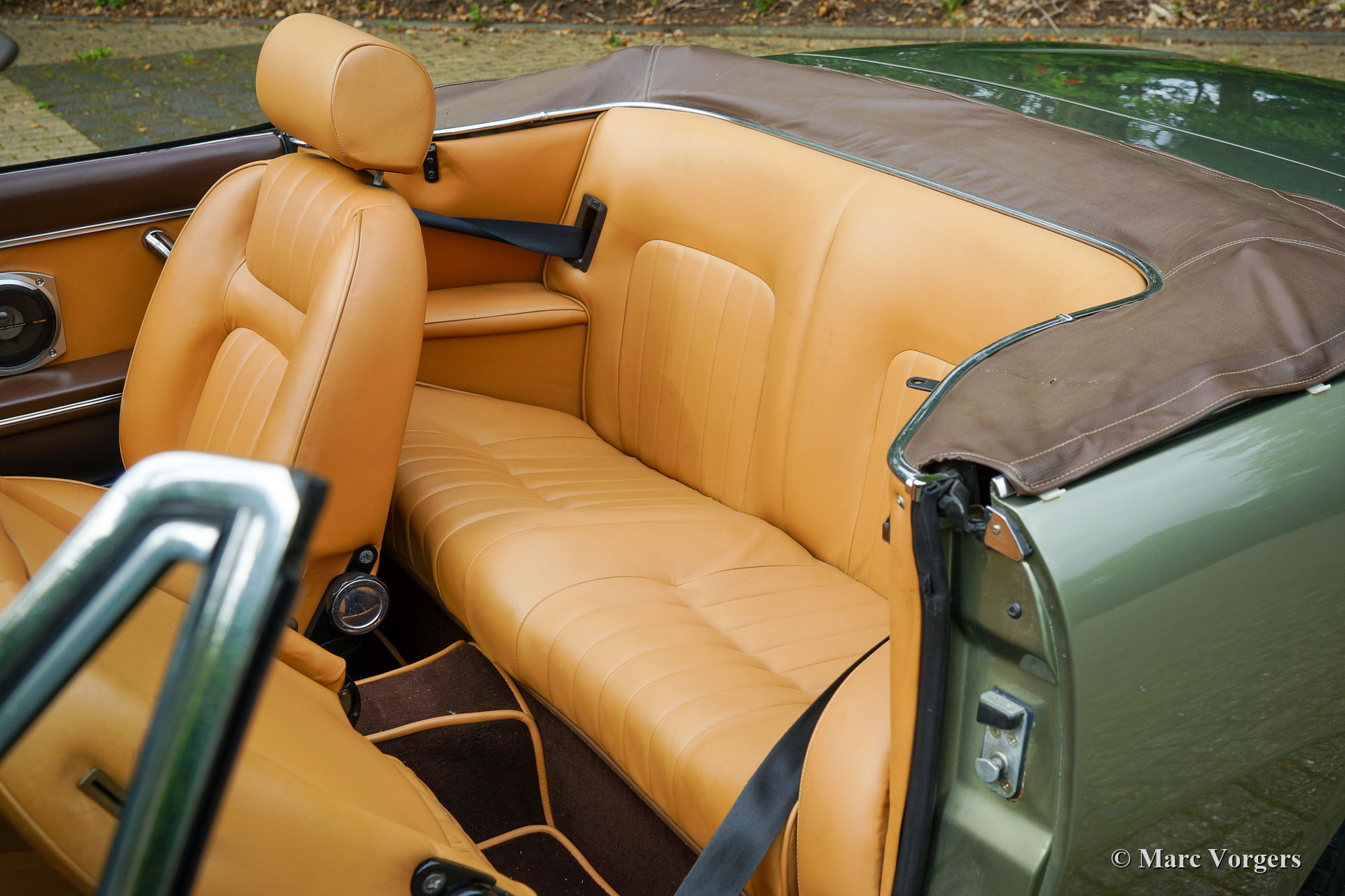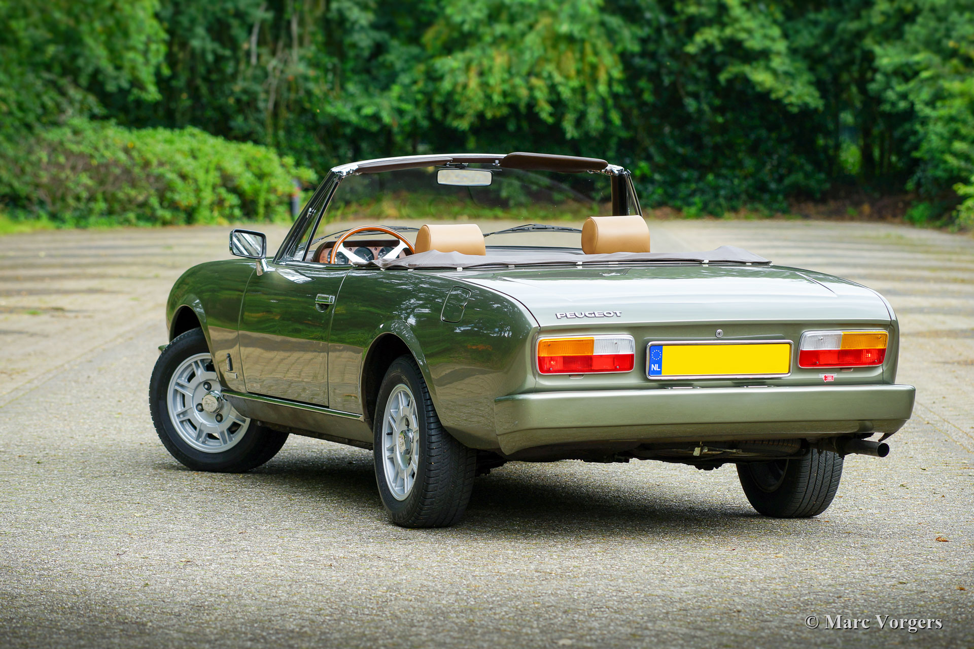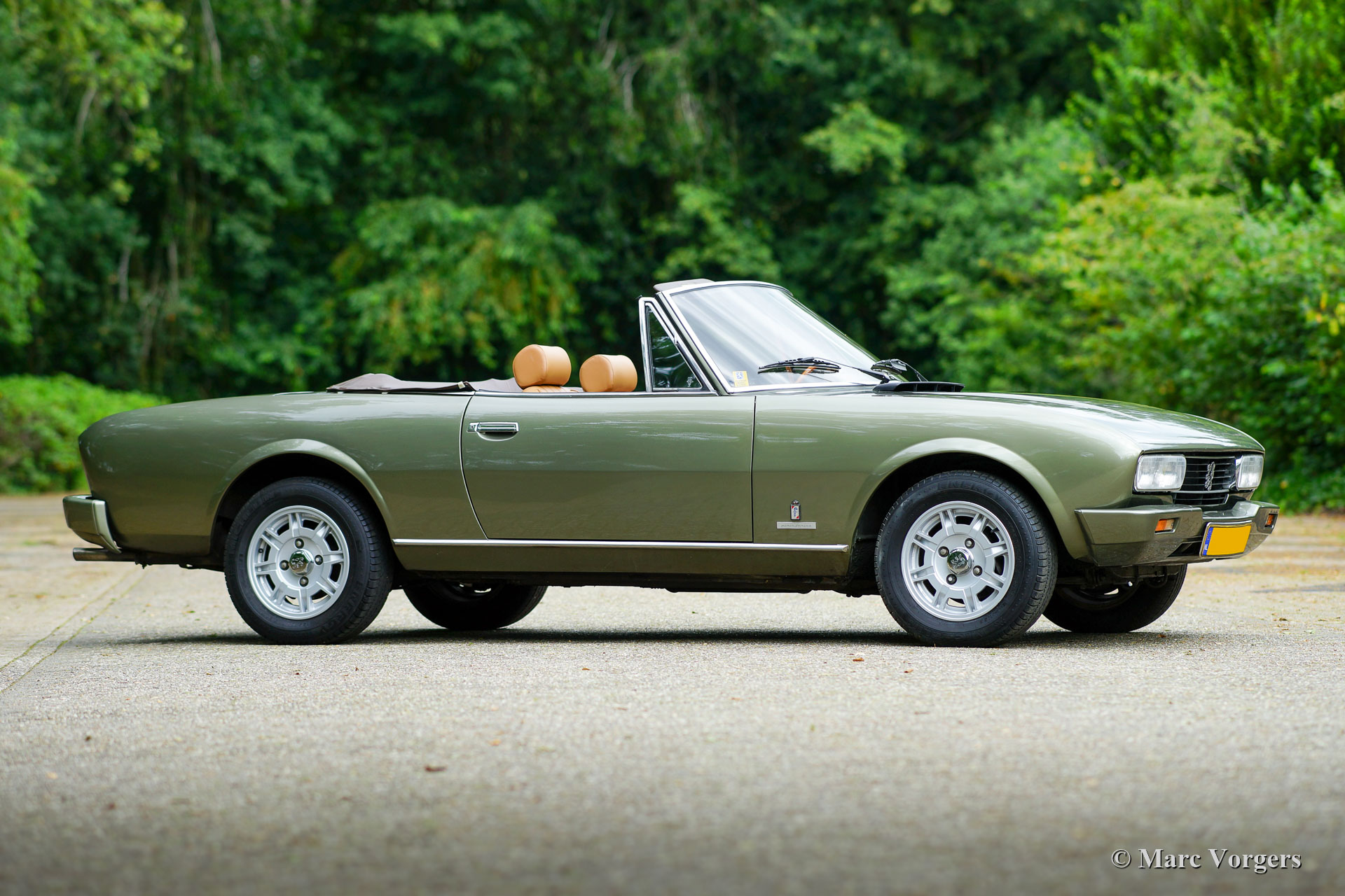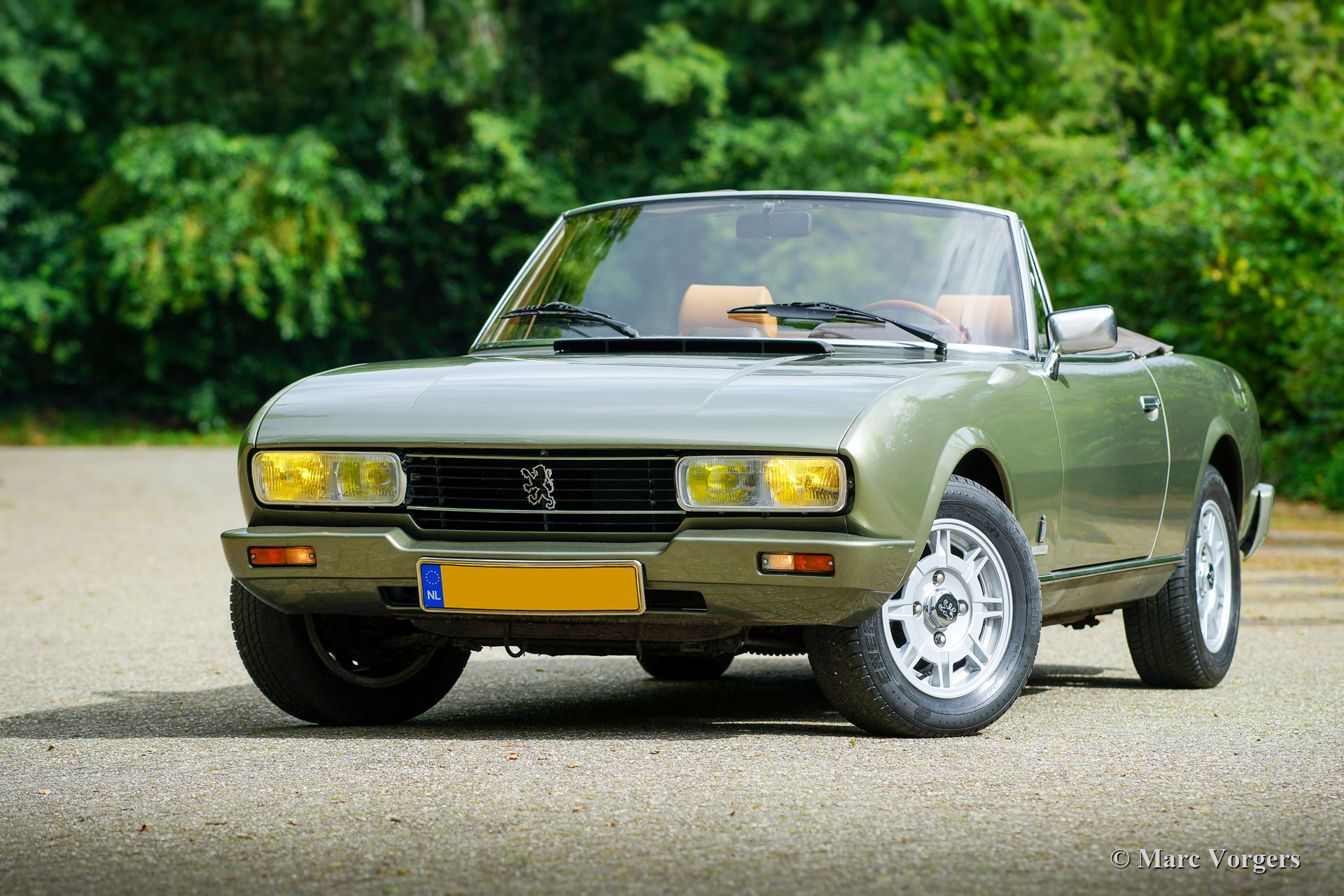 Peugeot 504 cabriolet, année 1980. Couleur vert pâle métallisé associée à un intérieur en cuir marron clair et à une moquette marronne. Capot noir et couvercle capot en vinyle marron clair. Cette magnifique Peugeot 504 cabriolet a été vendue neuve aux Pays-Bas. Il y a quelques années, la carrosserie fut restaurée et l'intérieur fut restauré. La carrosserie montre une peinture parfaite et l'intérieur fut recouvert de cuir et de tapis de haute qualité. La carrosserie a également reçu un traitement anti-corrosion Dinitrol. Récemment, le système d'injection et la dynamo furent révisés. La suspension fut améliorée avec de nouveaux amortisseurs, de nouvelles rotules, de nouveaux pneus Michelin et les roues furent alignées. La voiture était également entièrement mise à jour. Le capot est toujours d'origine. Cette magnifique Peugeot 504 cabriolet est en très bon à excellent et la voiture roule parfaitement ! La voiture est équipée de jantes en alliage d'origine de 15 pouces, d'un volant Nardi avec une jante en bois, d'un système d'alarme et d'un « coupe-vent ».