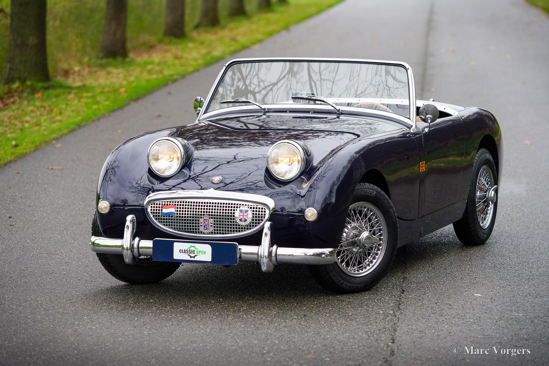 Austin Healey Sprite Mk 1, année 1960. Couleur bleu foncé combinée à un intérieur en cuir beige garni d'un passepoil bleu foncé et d'un tapis bleu foncé. Capote en vinyle beige et toit rigide supplémentaire de la couleur de la carrosserie. Cette magnifique Austin Healey Sprite fut chéri par un seul propriétaire pendant un quart de siècle ! La voiture a été conduite et appréciée régulièrement et entretenue ponctuellement. Le Healey Sprite est également connu sous les surnoms de « frogeye » (Royaume-Uni) et « bugeye » (États-Unis). Ce délicieux Sprite Mk I roule et se comporte parfaitement, et la voiture est un véritable tour de cou ! La voiture est dans un très bon et très beau état, ne montrant que de légères traces d’utilisation antérieure. Le moteur quatre cylindres est caché sous un très grand capot. L'avant complet s'ouvre pour révéler le moteur, les appendices et la suspension de la roue avant. Une autre particularité est l'absence de couvercle de coffre ; les bagages peuvent être rangés dans le coffre derrière les sièges. Ce Healey Sprite est livré avec une capote « pliable » et un toit rigide « Ashley » supplémentaire de la couleur de la carrosserie. La carrosserie n'est pas encore adaptée pour être accouplée au toit rigide supplémentaire. Pour ce faire, des points de fixation éventuels doivent être ajoutés sur le pont arrière. De plus, la voiture est équipée d'un joli volant sport Moto-Lita avec une jante en bois, des roues à rayons chromés et des filtres à air sport K&N. Il s'agit d’un Austin Healey Sprite Mk 1 très spéciale et désirable en très bon état ! Ce « frogeye » /« bugeye » apportera beaucoup de joie au fier nouveau propriétaire !