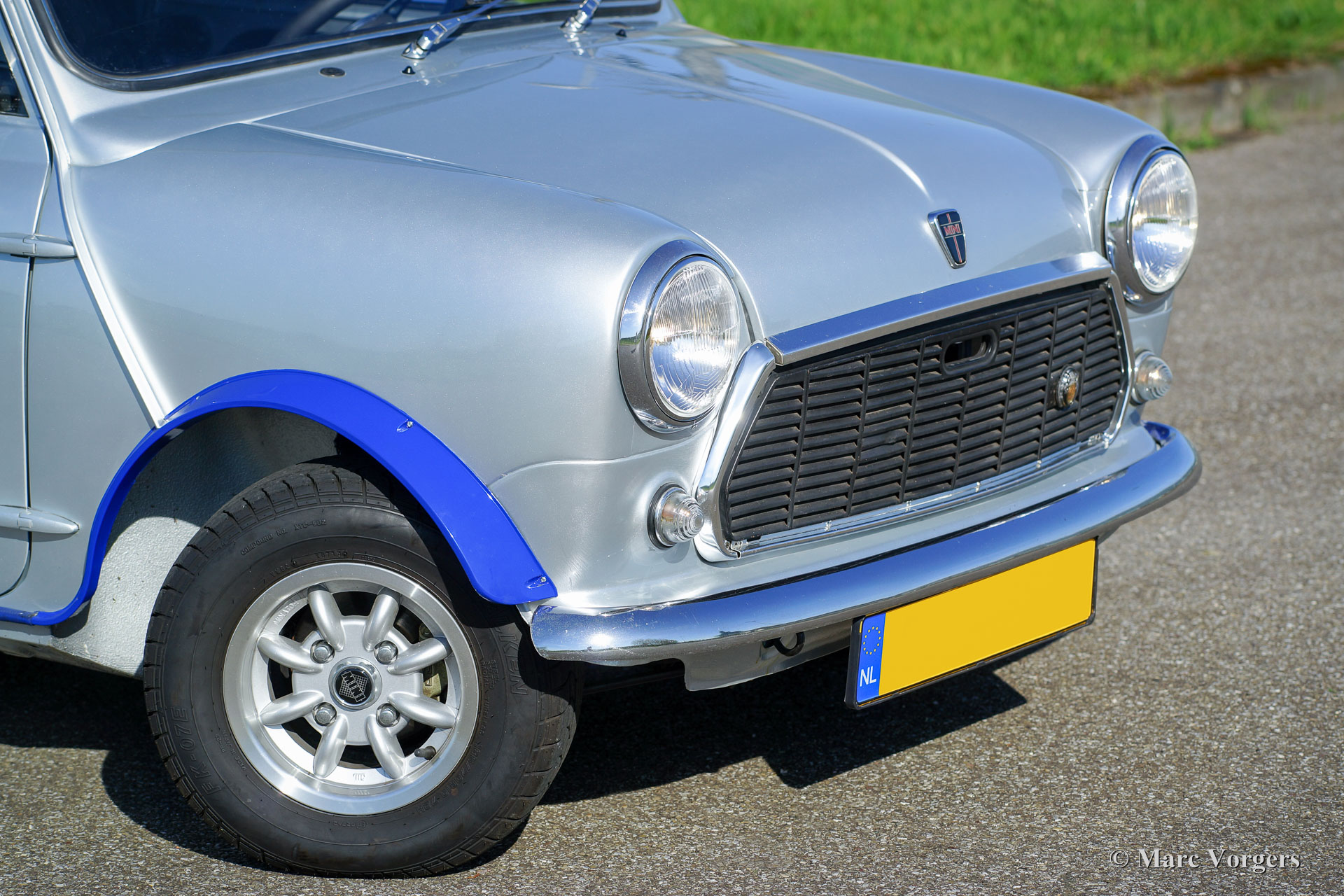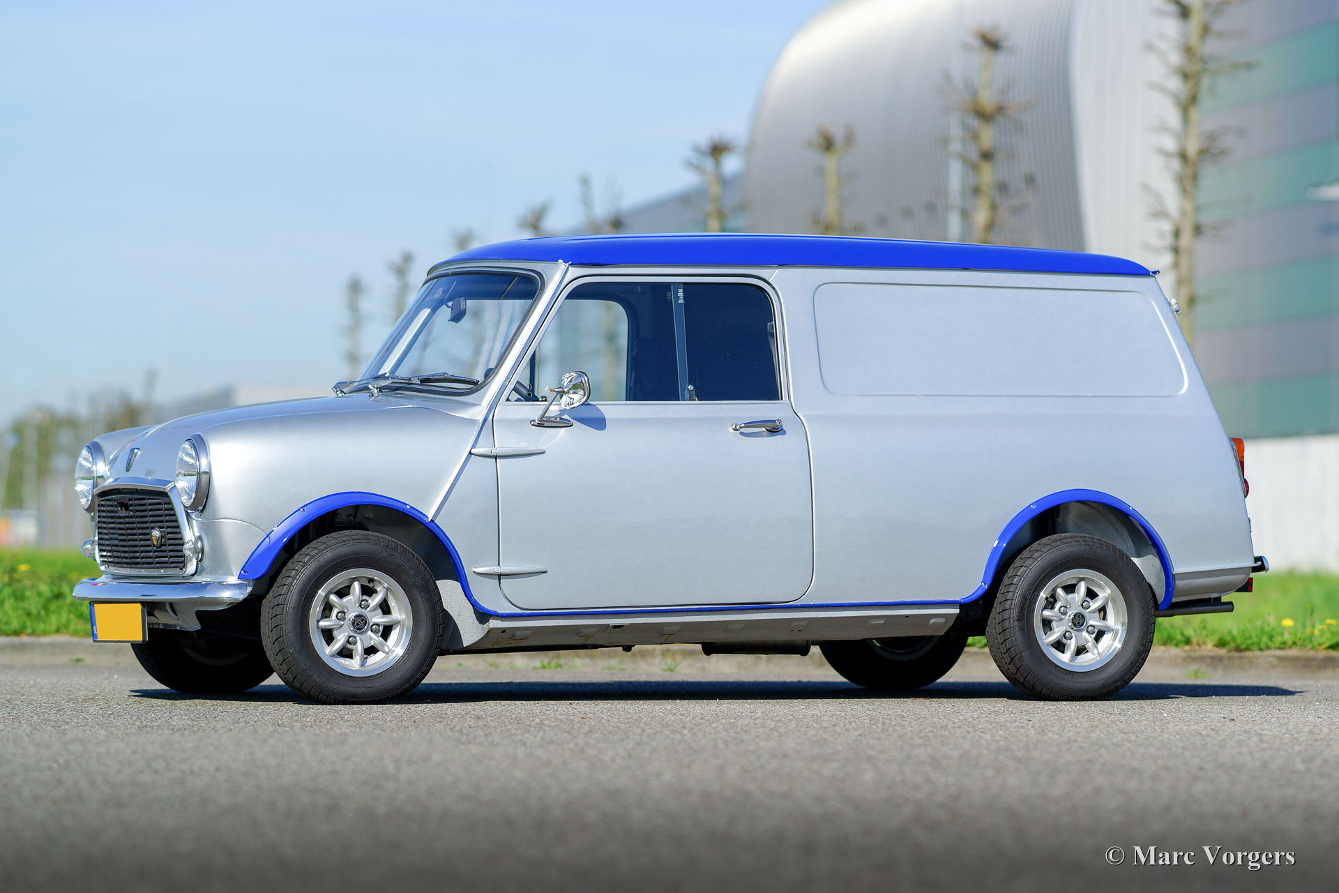 Austin Mini Van, année 1981. Couleur argent métallisé avec un toit bleu et des bords d'aile bleu. Intérieur en tissu noir et tapis noir. Tous les panneaux de carrosserie intérieurs sont magnifiquement décorés avec un matériau d'insonorisation gris foncé qui ressemble à un tapis tissé fin. Cette charmante Austin Mini Van est en excellent état et la voiture est très agréable à conduire. Le moteur de 1300 cc sonne et fonctionne très sportif et le moteur fut modifiée pour fonctionner à l'essence sans plomb. Cette Mini Van dispose encore des portes anciennes avec les fenêtres coulissantes et les charnières de porte à l'extérieur. La voiture est équipée d'un luxueux tableau de bord en bois avec les jauges au centre, d'un volant sport avec jante en cuir noir et de jantes en alliage de style Minilite. Un Austin Mini Van en excellent état et avec un caractère extraverti !