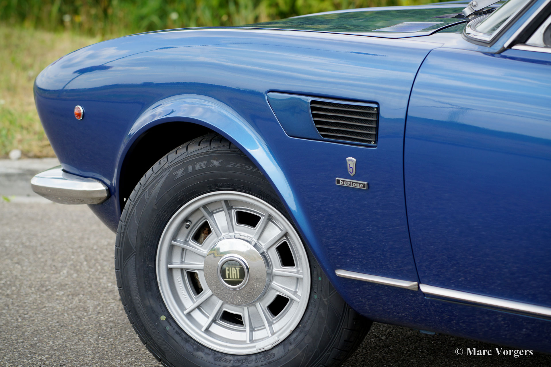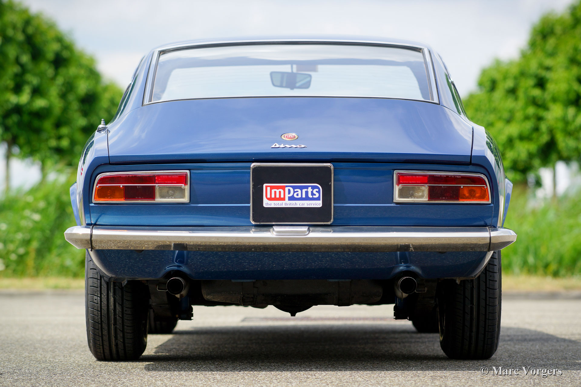 Fiat Dino 2000 coupé, année 1967. Couleur Azurro Mexico Bleu métallisé avec un intérieur en cuir noir et moquette noire. Ce magnifique Fiat Dino 2000 coupé est le numéro 128 de 3600 exemplaires construits de 1967 à 1969. L'automobile a subi une importante restauration du corps (reportage photo présent) et l'intérieur en cuir et le tapis furent renouvelés. Mécaniquement, la voiture est en grande partie originale. Un tableau de test de compression du moteur avec des résultats sains est présent ! Cette Fiat Dino est en très bon à excellent état et la voiture conduit parfaitement. Le moteur V6 de 2 litres Ferrari (Dino) développe 165 ch et l'unité sonne à merveille ! La boîte de vitesses manuelle à 5 rapports se déplace parfaitement. Le Dino coupé fut conçu par Bertone ; un chef-d'œuvre magnifiquement formé avec des détails magnifiques !