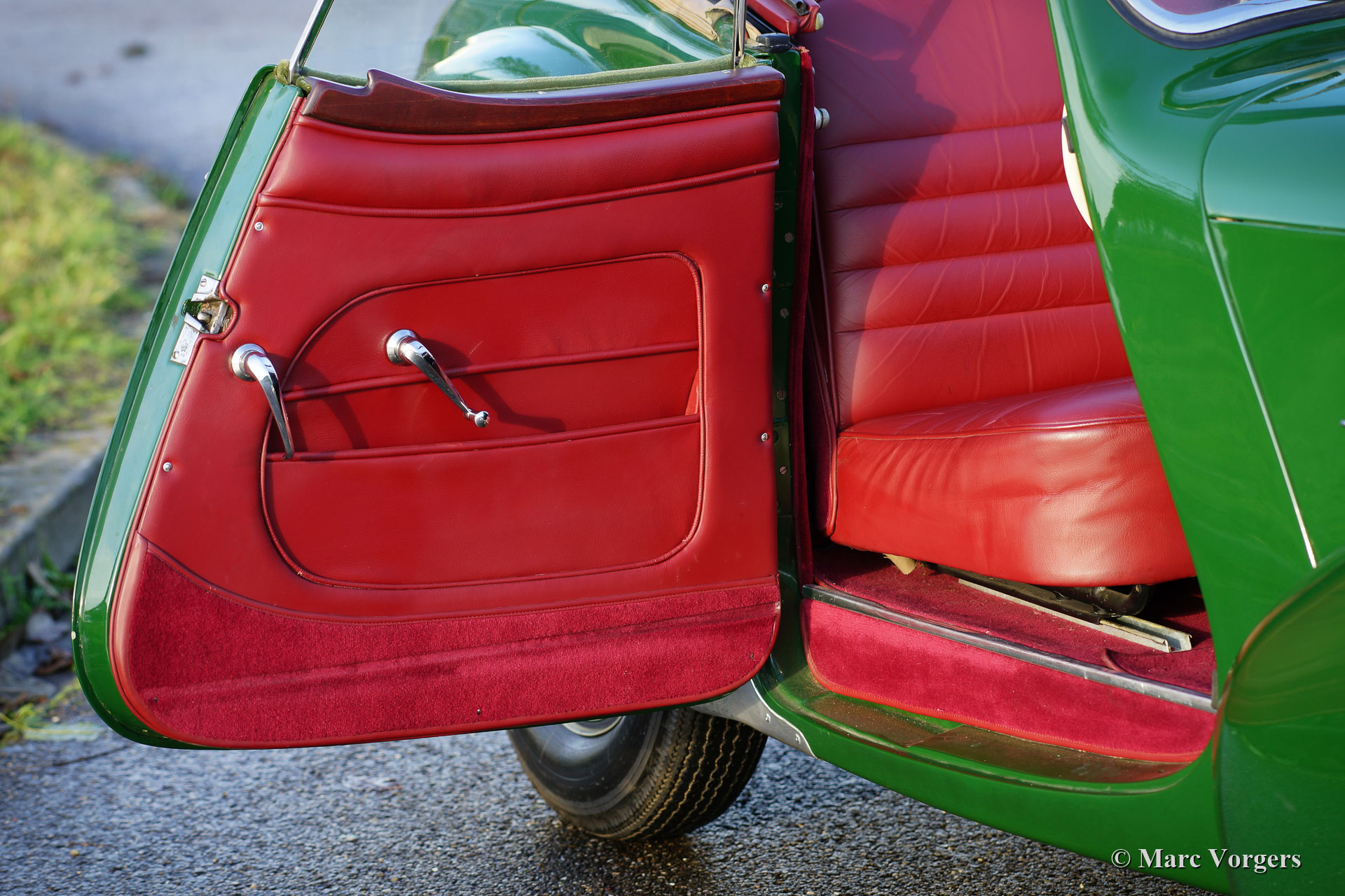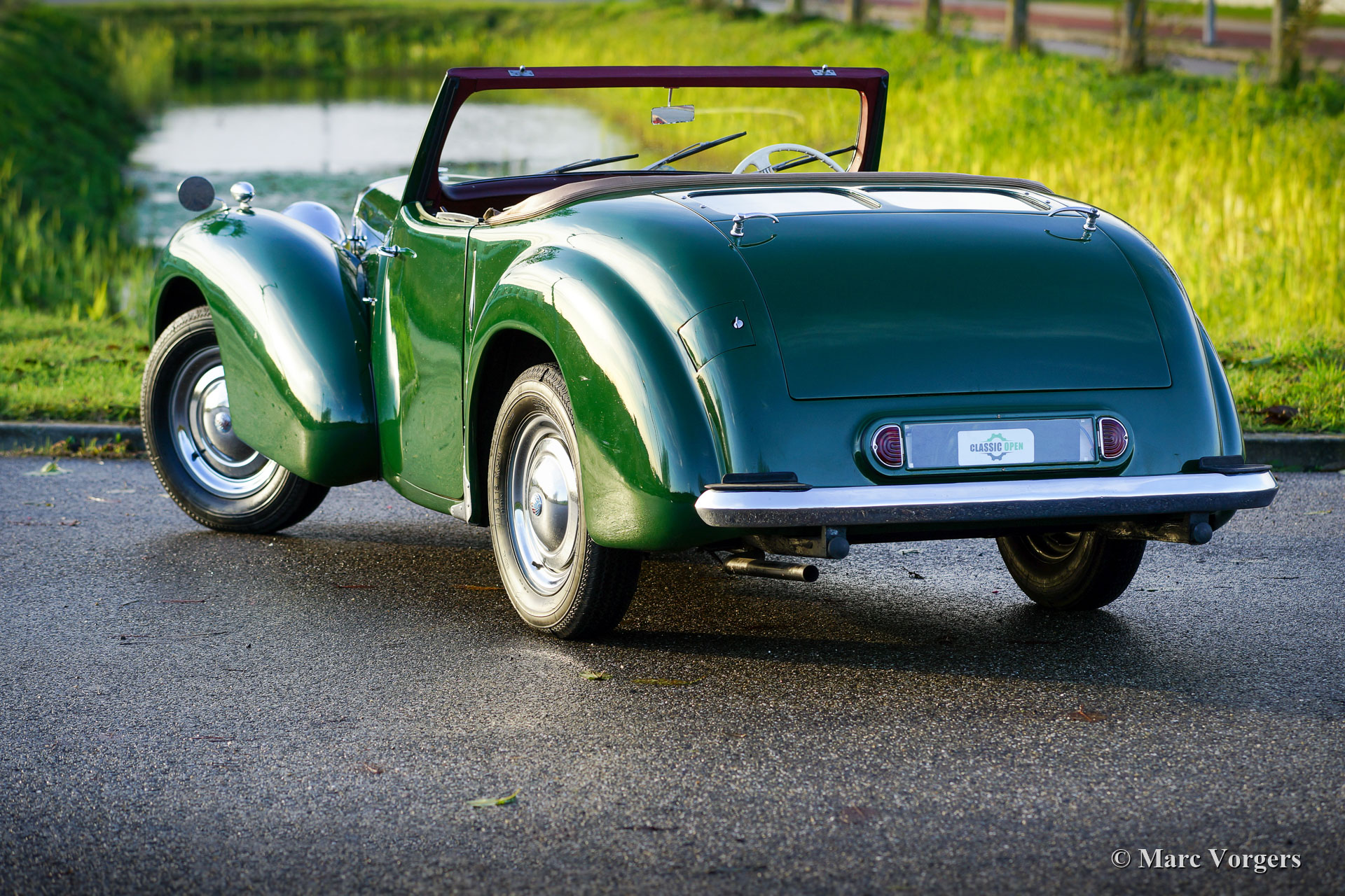 Triumph 1800 Roadster, année 1947. Couleur verte combinée à un intérieur en cuir rouge foncé garni de tapis rouge. Capuche beige. Le roadster Triumph 1800 (et le 2000 qui a été présenté en 1948) étaient les ancêtres de la dernière série Triumph TR. Triumph a fait faillite en 1944, après quoi l'entreprise a été rachetée par le constructeur automobile Standard. Pendant plusieurs années, le réalisateur Sir John Black avait envié SS-Cars, qui commercialisait avec succès les voitures de sport Jaguar SS90 et SS100 à moteurs Standard depuis 1936. Avec l'achat de Triumph, Standard voulait concurrencer Jaguar et d'autres marques de voitures de sport anglaises. Le roadster Triumph 1800 (18TR) fut le premier Triumph d'après-guerre en 1946. Seuls 2501 exemplaires furent construits. Ce magnifique exemple montre une carrosserie magnifiquement restaurée et un intérieur en cuir comme neuf. La voiture est en très bon à excellent état et la voiture montre tous les détails d'origine. La caractéristique la plus accrocheuse est le « siège dickey » à l'arrière dans lequel deux « petites personnes » peuvent trouver leur siège. Le moteur quatre cylindres standard de 65 ch propulse la voiture à une vitesse maximale de 120 km/h (75 mph). La boîte de vitesses à 3 rapports est dotée d'un levier de vitesse sur la colonne de direction qui fonctionne parfaitement et offre l'avantage d'offrir de la place pour trois personnes sur le banc !