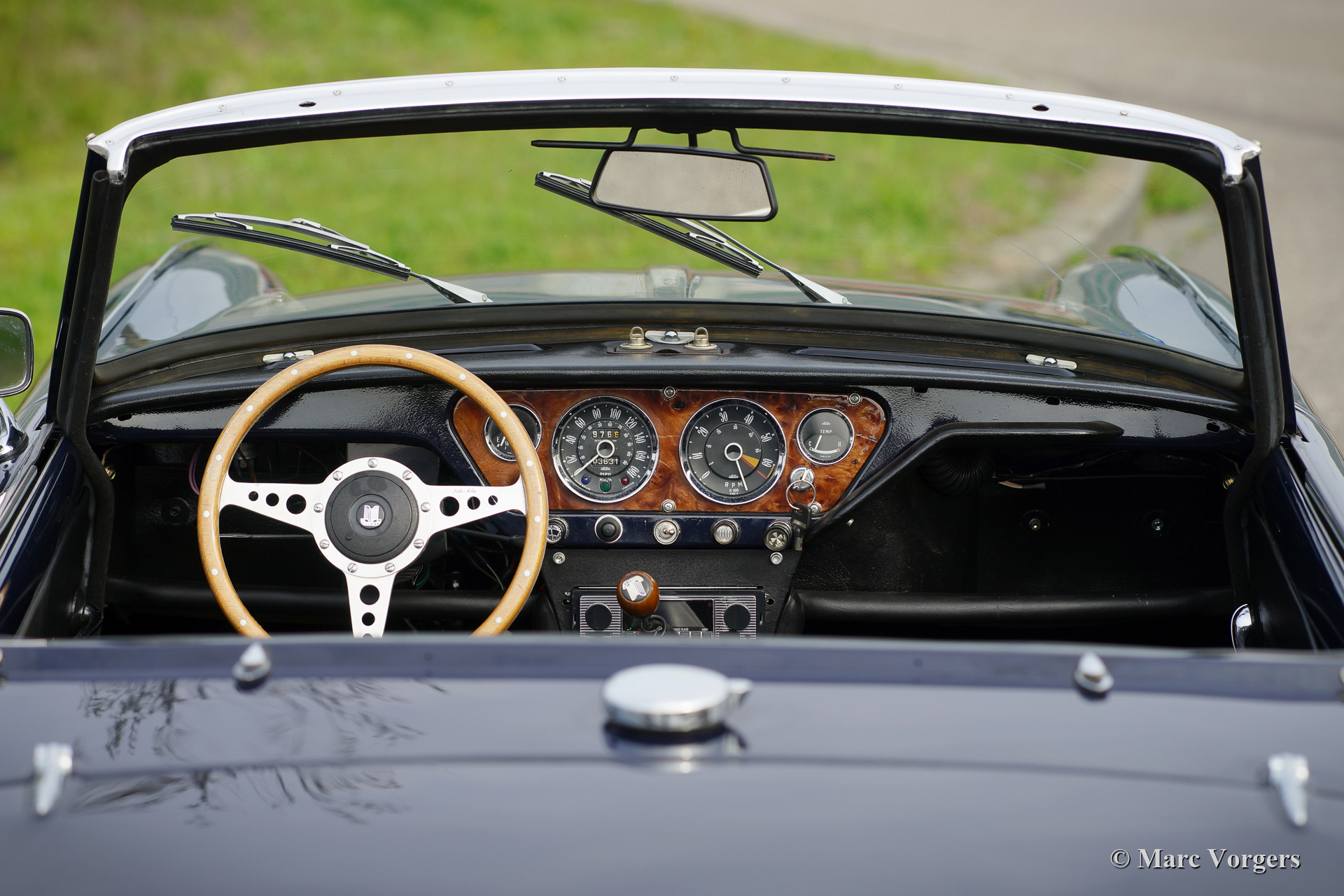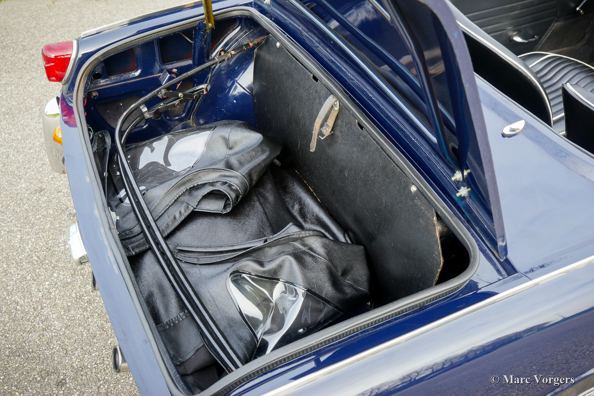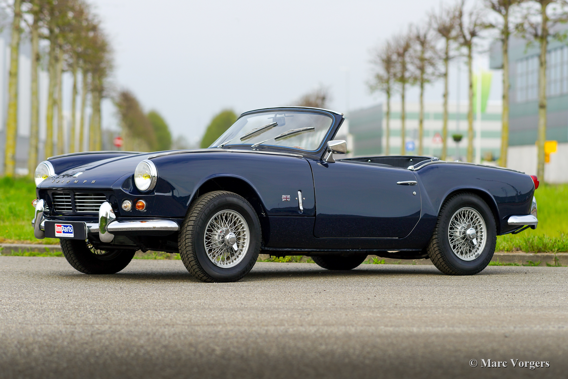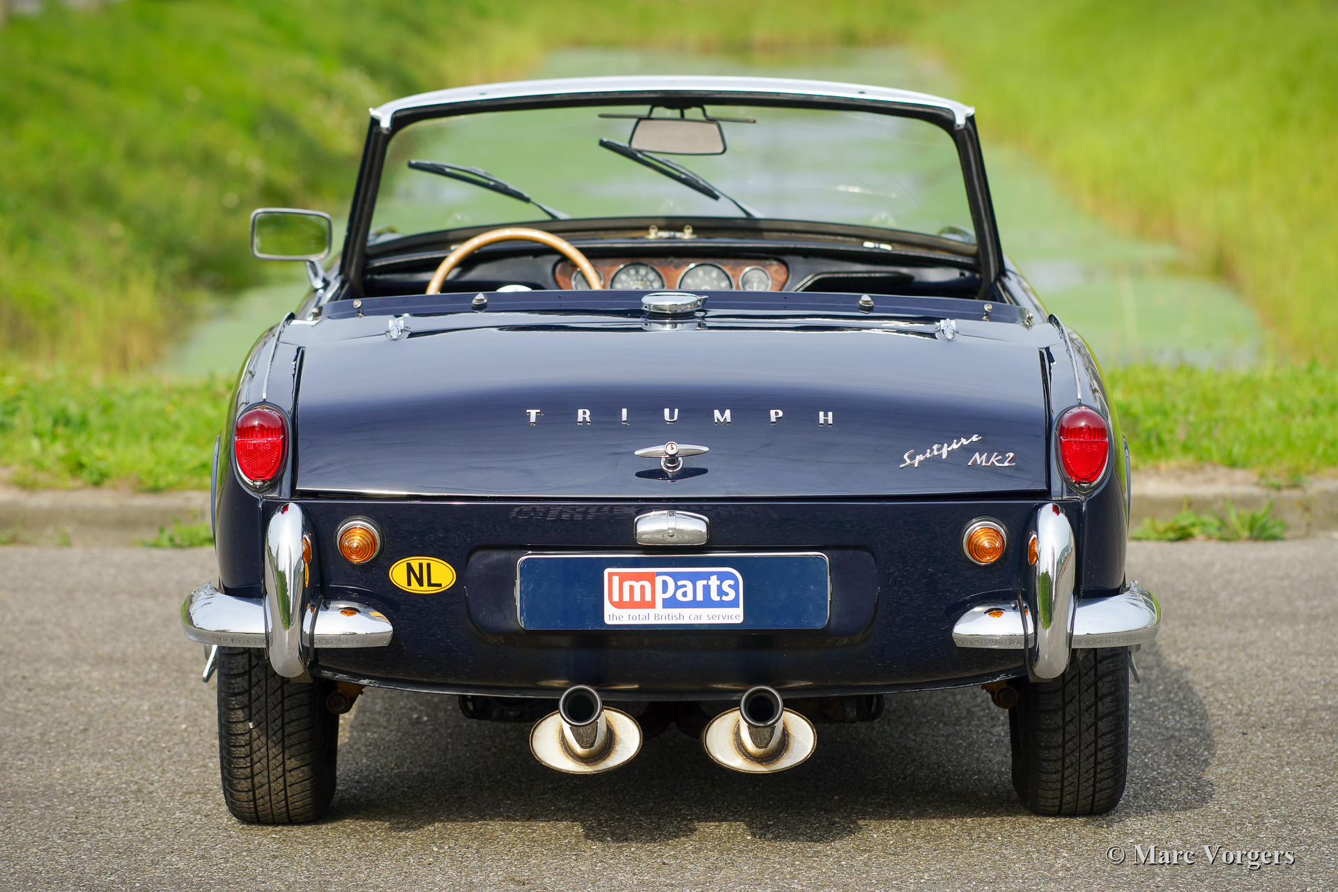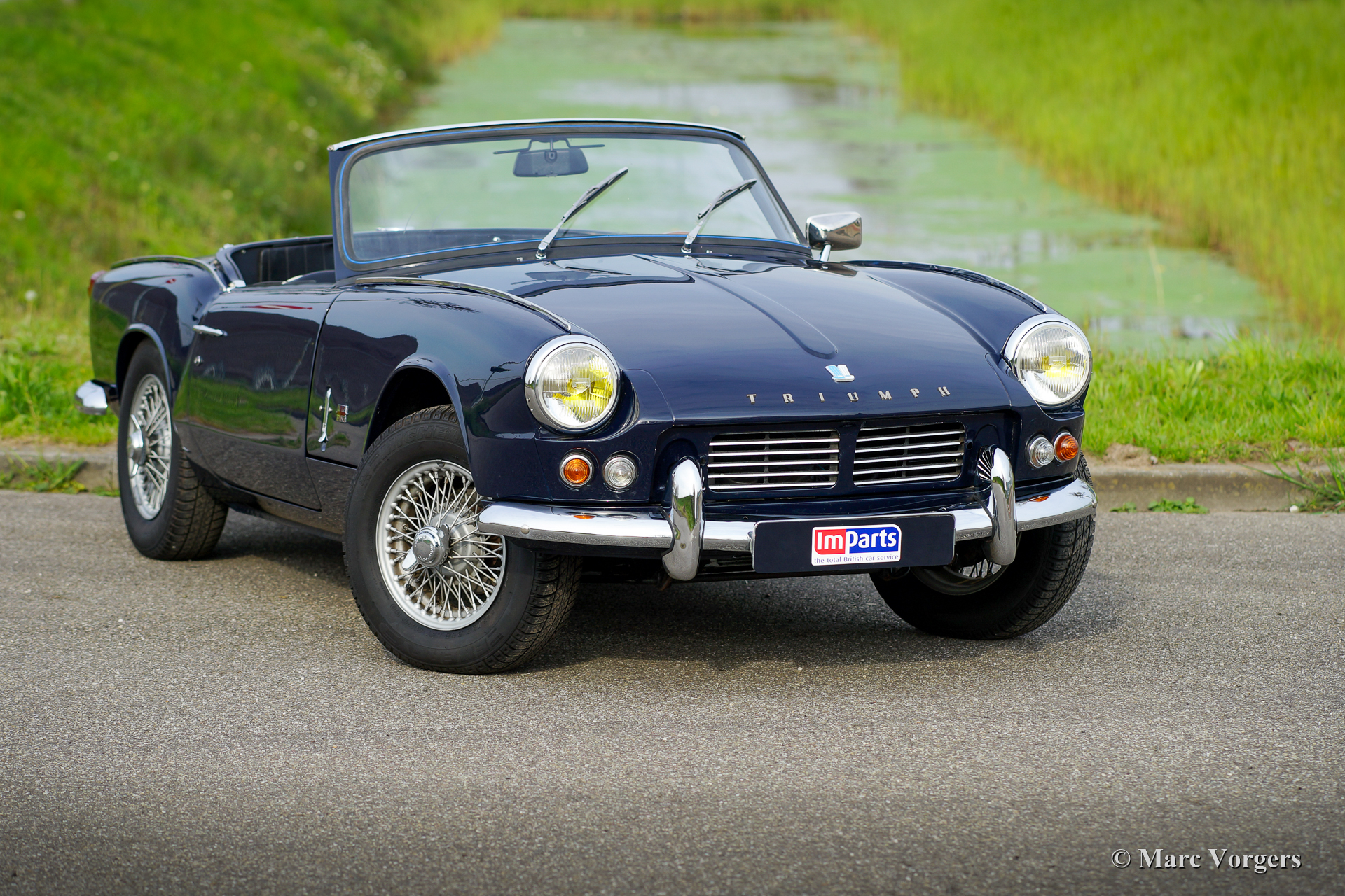 Triumph Spitfire Mk II, année 1966. Couleur bleu foncé associée à un intérieur en similicuir noir garni de passepoil blanc et de tapis noir. Capote en vinyle noir. Cette belle Triumph Spitfire fut vendue neuve aux Pays-Bas. La voiture fut restaurée « body-off » dans le passé, la voiture est en très bon état. La Triumph Spitfire offre beaucoup d'expérience de conduite classique à toit ouvert pour un petit budget mais avec un look splendide ! La voiture est équipée d'un moteur quatre cylindres de 1147 cm3 équipé de deux S.U. carburateurs. Le moteur délivre une puissance de 67 ch, ce qui est suffisant pour susciter les ambitions sportives de cette voiture légère d'environ 725 kilogrammes. Ce Spitfire Mk II est équipé de roues à rayons peintes en argent et d'un échappement sport en acier inoxydable qui produit une bande-son fantastique !