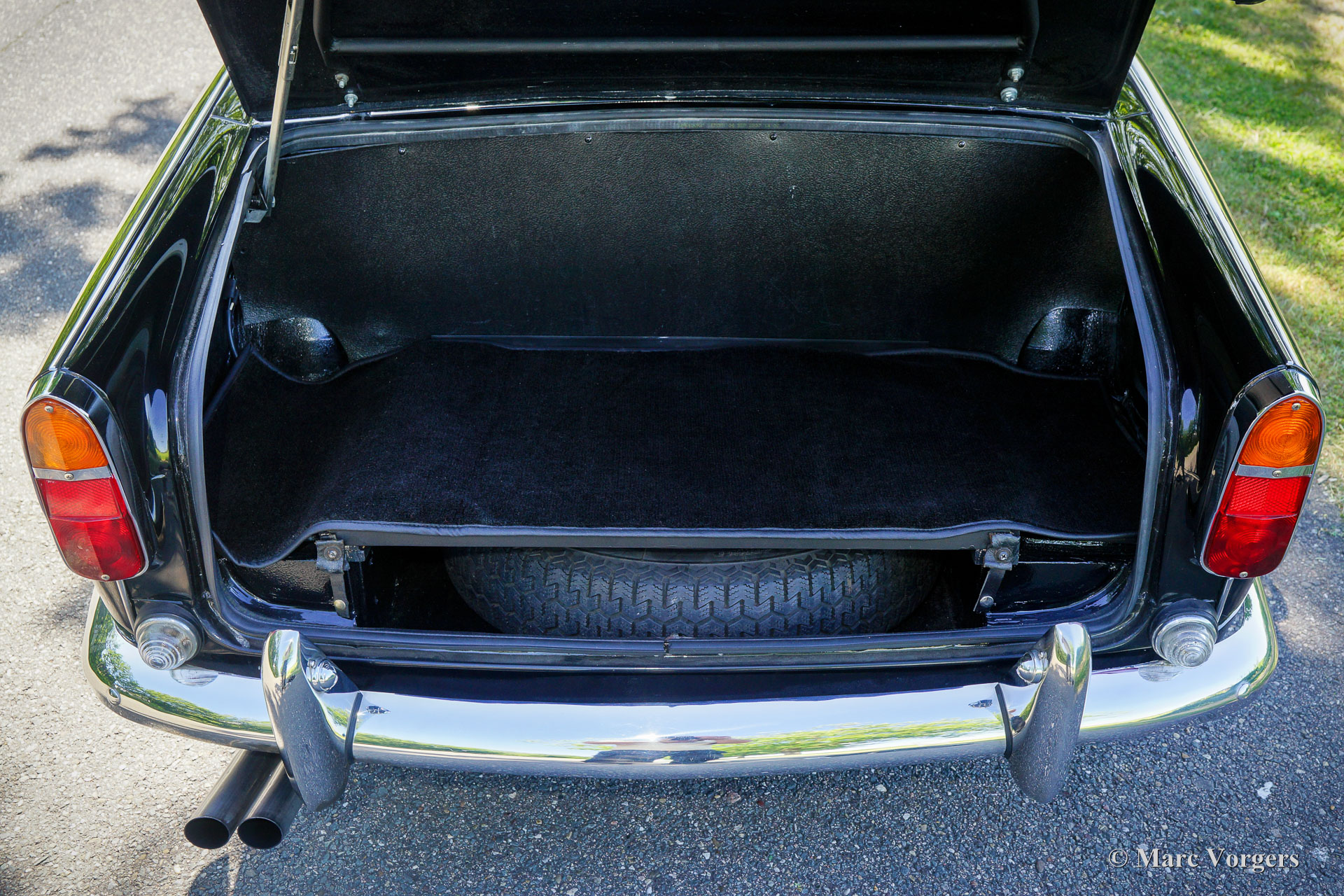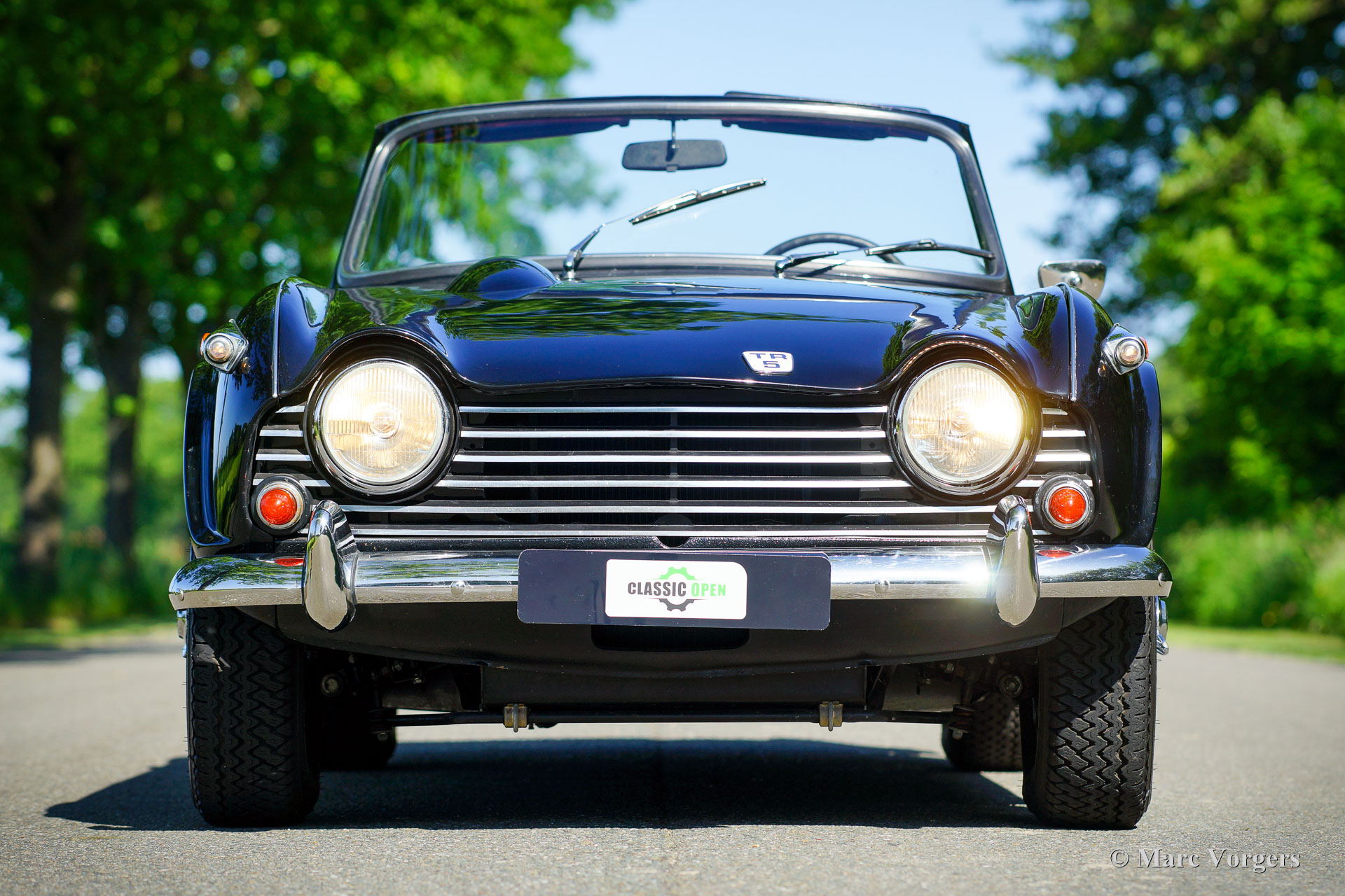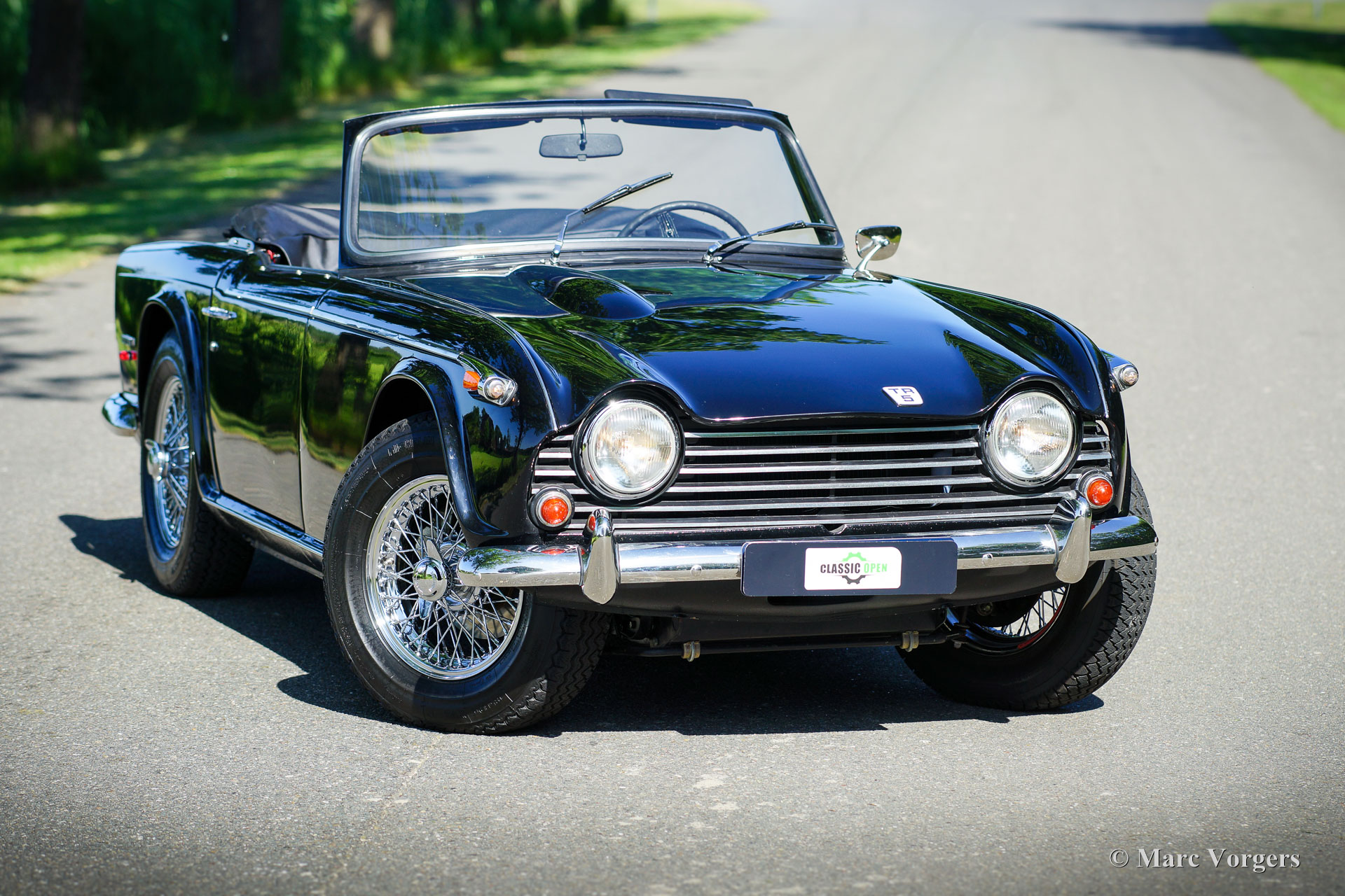 Triumph TR 5, année 1968 (première immatriculation 1969). Couleur noire combinée à un intérieur en cuir rouge garni de passepoil blanc et de moquette noire. Capote en mohair noir et couvercle capote en vinyle noir. La Triumph TR 5 est une voiture importante dans l'histoire de l'automobile ; la TR 5 a été la première voiture de série équipée d'un système d'injection d'essence ! Ce système mécanique fut fabriqué par Lucas en Angleterre. Le système d'injection n'était pas disponible sur le marché américain, le moteur six cylindres de la voiture était équipé de deux carburateurs Stromberg et commercialisé sous le nom de TR 250. La TR 5 est un modèle Triumph rare, seulement 2947 exemplaires furent construits à partir d'août De 1967 à septembre 1968. Ce magnifique exemplaire fut largement restauré dans les années 2015-2020, la voiture est en excellent état et présente tous les détails d'origine. Le rare volant d'origine est toujours monté ! Le système d'injection Lucas est toujours installé et fonctionne comme il se doit ; le moteur tourne très bien, et la puissance de 150 chevaux est à votre disposition ! La voiture est équipée d'un overdrive, de roues à rayons chromées et d'une pompe à essence Bosch. Ce TR 5 est disponible dans la combinaison de couleurs la plus désirable que l'on puisse souhaiter. Une Triumph TR 5 très désirable et rare pour le collectionneur, et une voiture de pilote fantastique pour les passionnés !