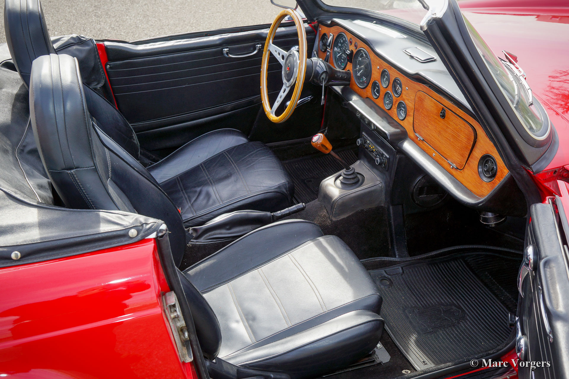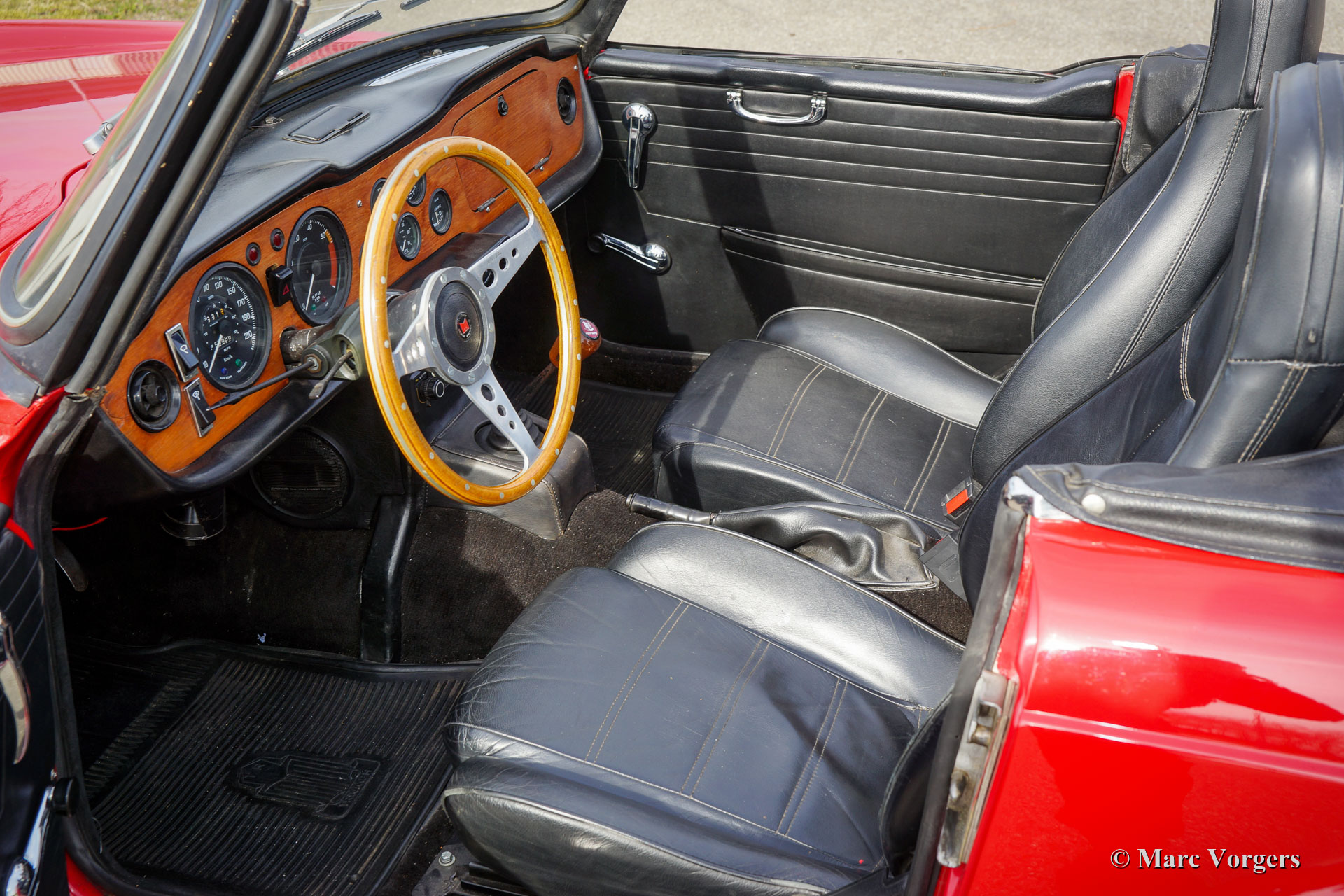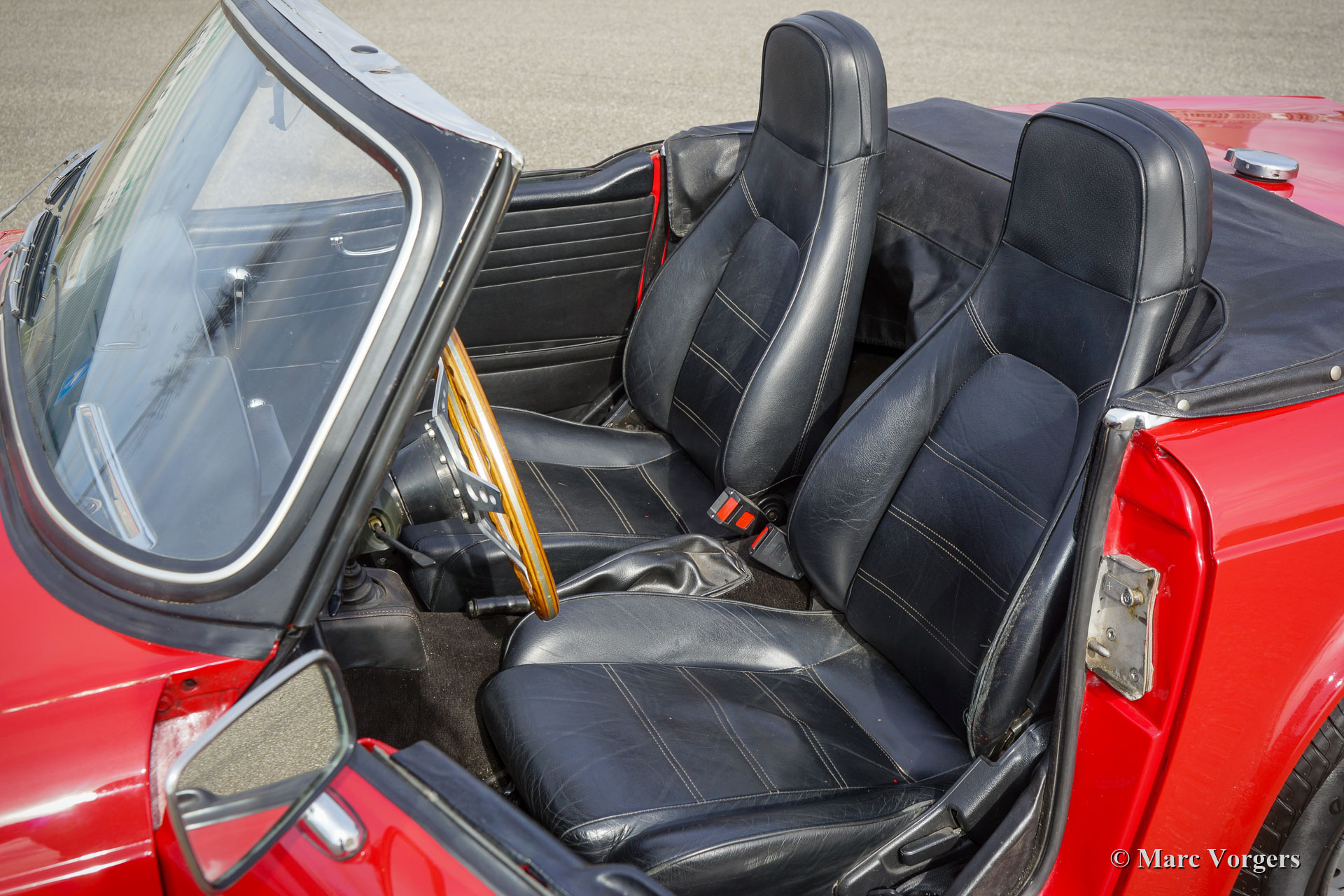 Triumph TR 6 PI, année 1969. Couleur rouge combinée à un intérieur noir, une capote en mohair noir et un couvre-capot noir. Cette Triumph TR 6 PI sportive est un ancien modèle CP, construit en Belgique et vendu neuf aux Pays-Bas. La TR 6 PI équipée de l'Injection mécanique Lucas Essence n'était vendue qu'en Europe, c'est un modèle rare de 150 ch avec conduite à gauche. La Triumph TR 6 était très populaire aux États-Unis, de nombreuses voitures proposées à la vente sont des modèles américains moins puissants équipés de deux carburateurs. Cette TR 6 PI européenne est équipée de la transmission finale PI à rapport supérieur et d'une boîte de vitesses à 4 rapports avec « overdrive ». Ce package offrait une vitesse de pointe d'environ 200 km/h, ce qui était une affaire sérieuse à la fin des années 1960 ! Cette TR 6 PI a été bien entretenue, et cette fantastique voiture de conducteur montre des signes normaux d'utilisation et d'âge. Ces dernières années, le moteur, la boîte de vitesses et le différentiel furent révisés, et récemment le système d'injection Lucas fut reconstruit et une nouvelle pompe à carburant Bosch fut installée. La voiture est équipée d'un allumage électronique et d'une radio Philips. Sont également équipés des sièges Mazda MX5 avec dossier haut, les sièges TR 6 d'origine sont également présents. Cette TR 6 PI est une voiture de pilote fantastique qui apportera beaucoup de plaisir aux passionnés !