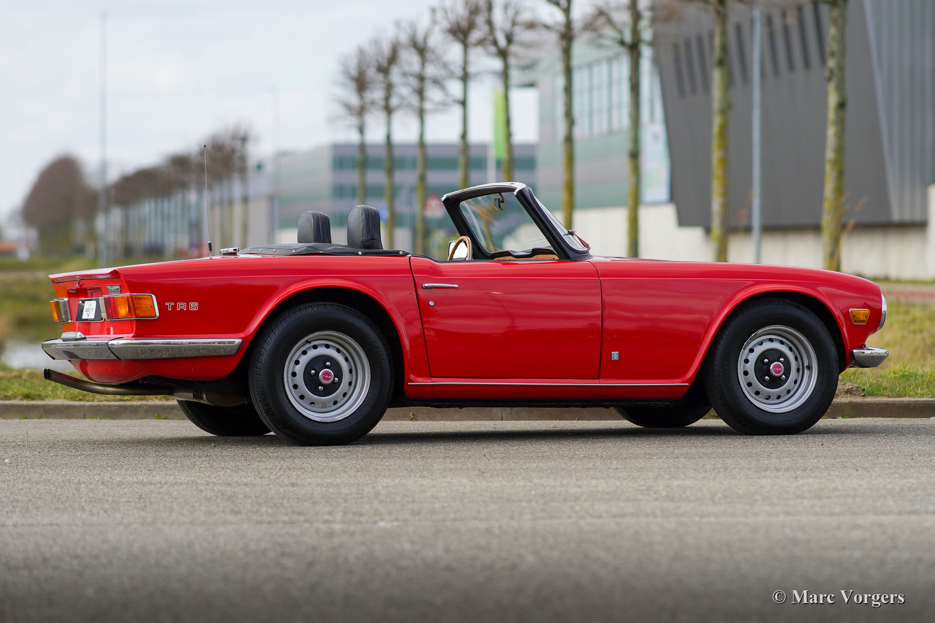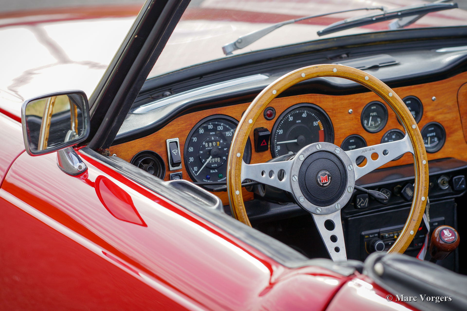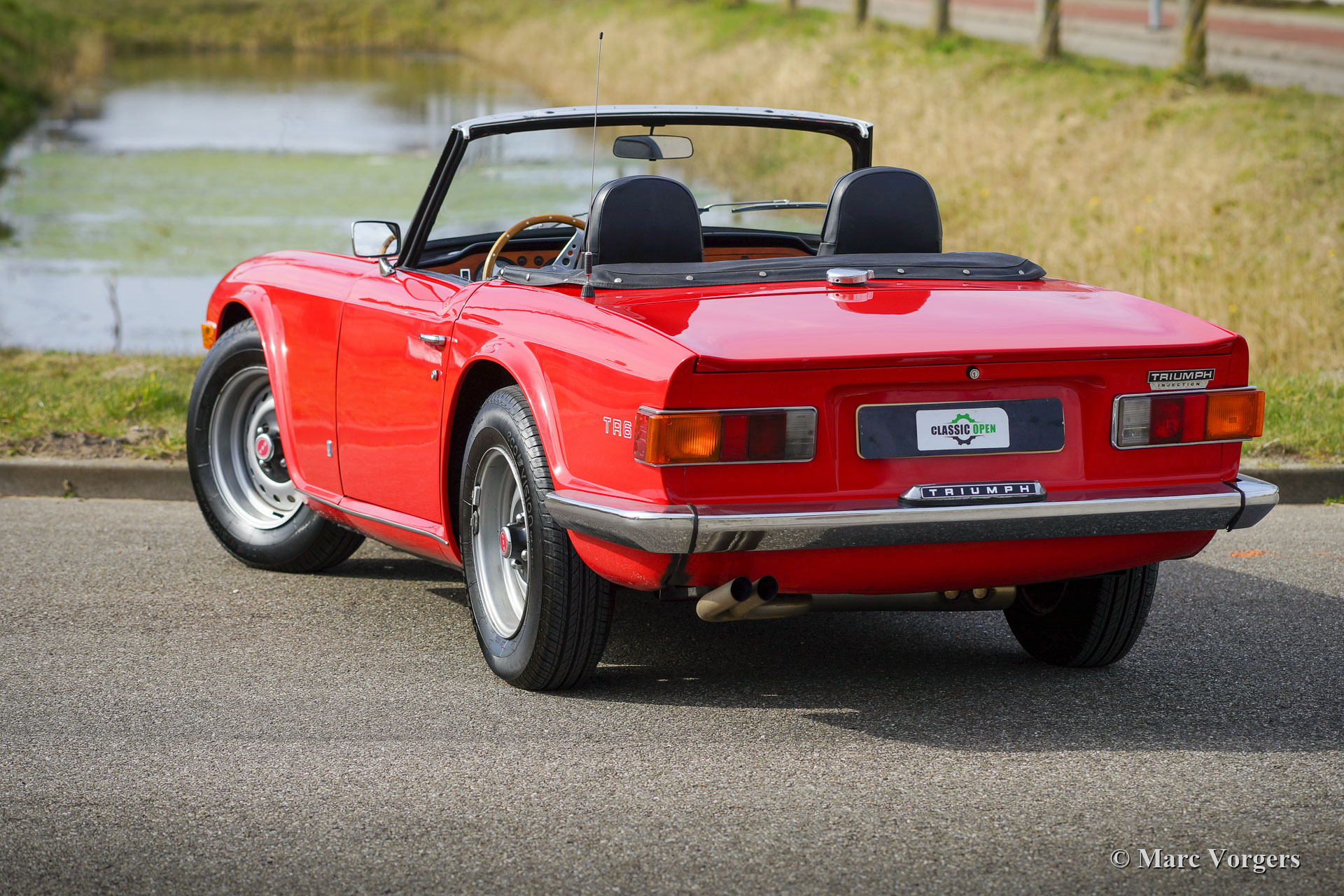 Triumph TR 6 PI, année 1969. Couleur rouge combinée à un intérieur noir, une capote en mohair noir et un couvre-capot noir. Cette Triumph TR 6 PI sportive est un ancien modèle CP, construit en Belgique et vendu neuf aux Pays-Bas. La TR 6 PI équipée de l'Injection mécanique Lucas Essence n'était vendue qu'en Europe, c'est un modèle rare de 150 ch avec conduite à gauche. La Triumph TR 6 était très populaire aux États-Unis, de nombreuses voitures proposées à la vente sont des modèles américains moins puissants équipés de deux carburateurs. Cette TR 6 PI européenne est équipée de la transmission finale PI à rapport supérieur et d'une boîte de vitesses à 4 rapports avec « overdrive ». Ce package offrait une vitesse de pointe d'environ 200 km/h, ce qui était une affaire sérieuse à la fin des années 1960 ! Cette TR 6 PI a été bien entretenue, et cette fantastique voiture de conducteur montre des signes normaux d'utilisation et d'âge. Ces dernières années, le moteur, la boîte de vitesses et le différentiel furent révisés, et récemment le système d'injection Lucas fut reconstruit et une nouvelle pompe à carburant Bosch fut installée. La voiture est équipée d'un allumage électronique et d'une radio Philips. Sont également équipés des sièges Mazda MX5 avec dossier haut, les sièges TR 6 d'origine sont également présents. Cette TR 6 PI est une voiture de pilote fantastique qui apportera beaucoup de plaisir aux passionnés !