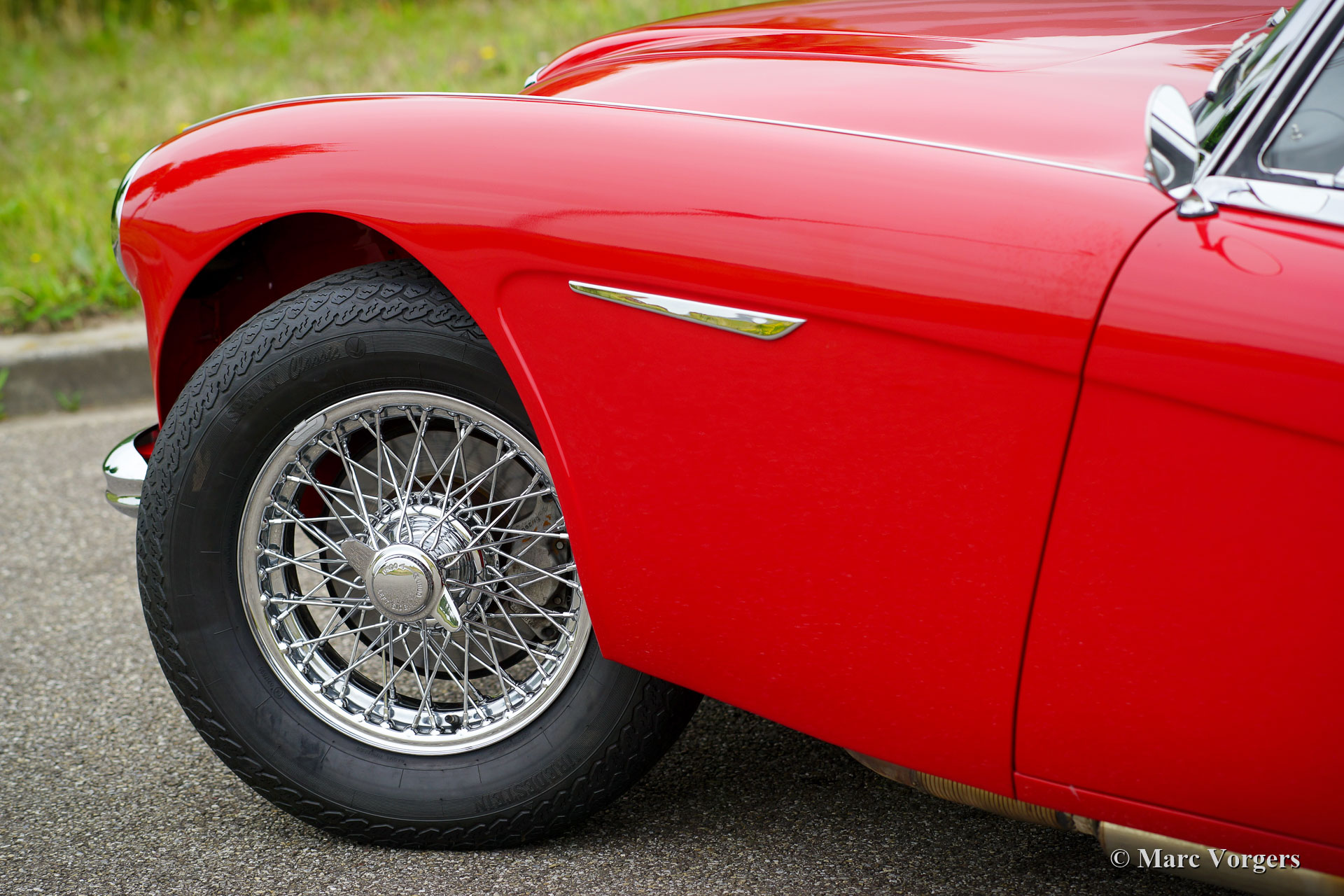 Austin Healey 3000 Mk III phase 2, année 1966. Couleur rouge avec intérieur en cuir noir et une moquette noire. Capote et capuchon en mohair noir, tonneau en vinyle noir. Ce magnifique « Big Healey » fut restauré détaillée par Imparts en 2006. Les travaux furent réalisés à la demande du propriétaire actuel. Tout a été restauré, révisé et / ou renouvelé. Depuis l'achèvement de la restauration, la voiture a parcouru moins de 10 000 kilomètres. Cette fantastique Austin Healey est en excellent état ; concours ! Au cours de la restauration, la voiture a bénéficié d'importantes améliorations telles qu'un allumage électronique, un générateur de courant alternatif et un démarreur à couple élevé. Cette très belle Austin Healey de la dernière série Phase 2 ressemble à une photo et la voiture roule et pilote parfaitement !