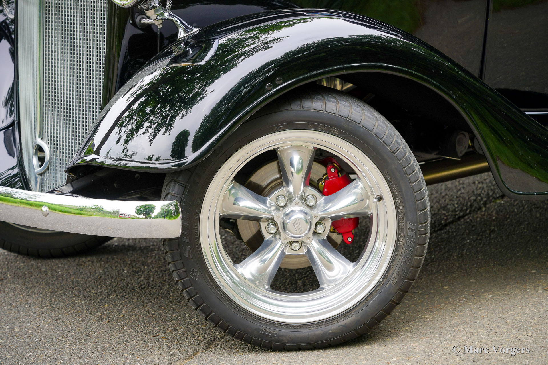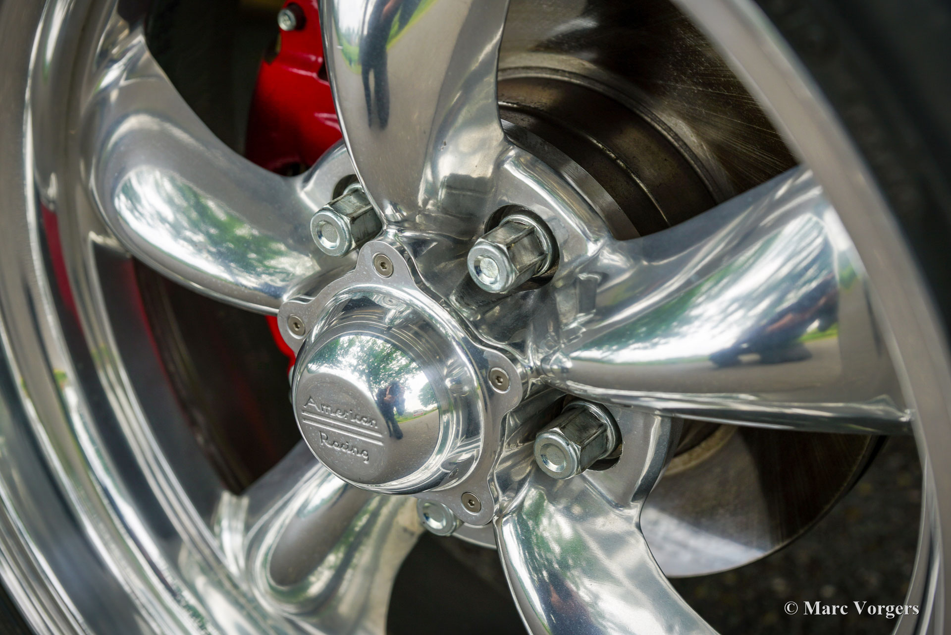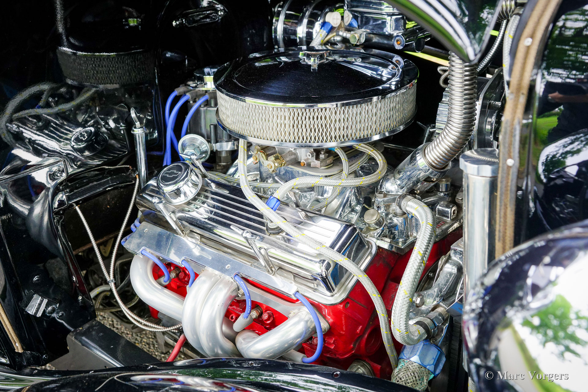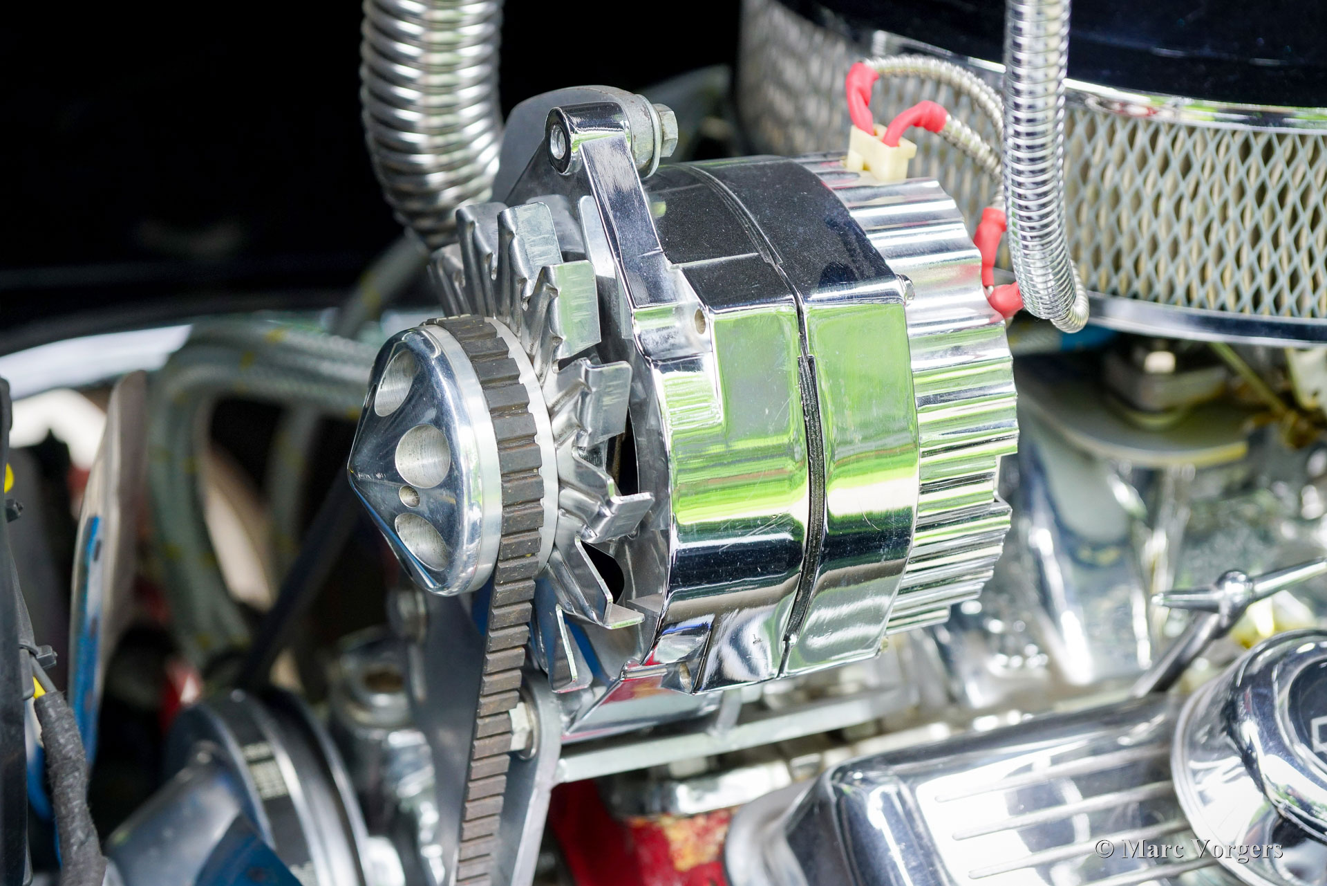 Freinage et direction : Freins à disque à l’avant, complétés par un système Air4Link triangulaire en acier inoxydable poli à l’arrière, servofrein chromé, nouvelles conduites de frein et direction assistée. - Groupe motopropulseur : Moteur V8 Chevrolet 350 C.I.D. long block (290 ch) de Summit Racing, associé à une transmission automatique TH350.