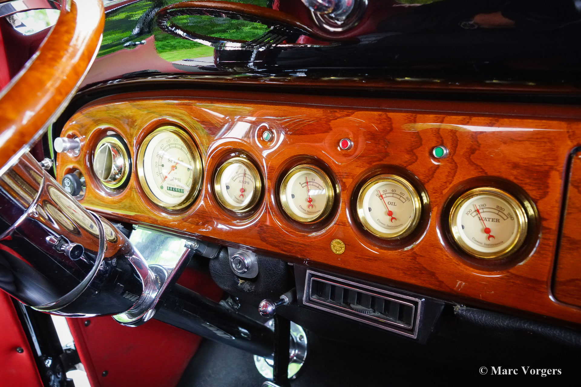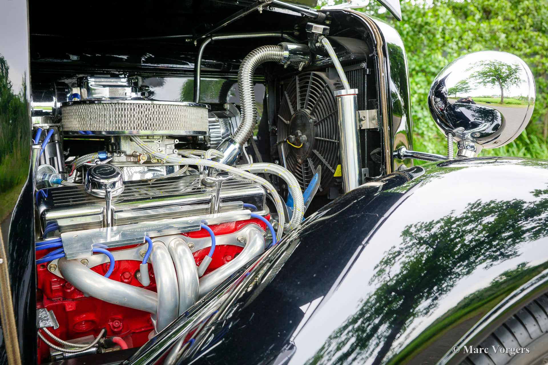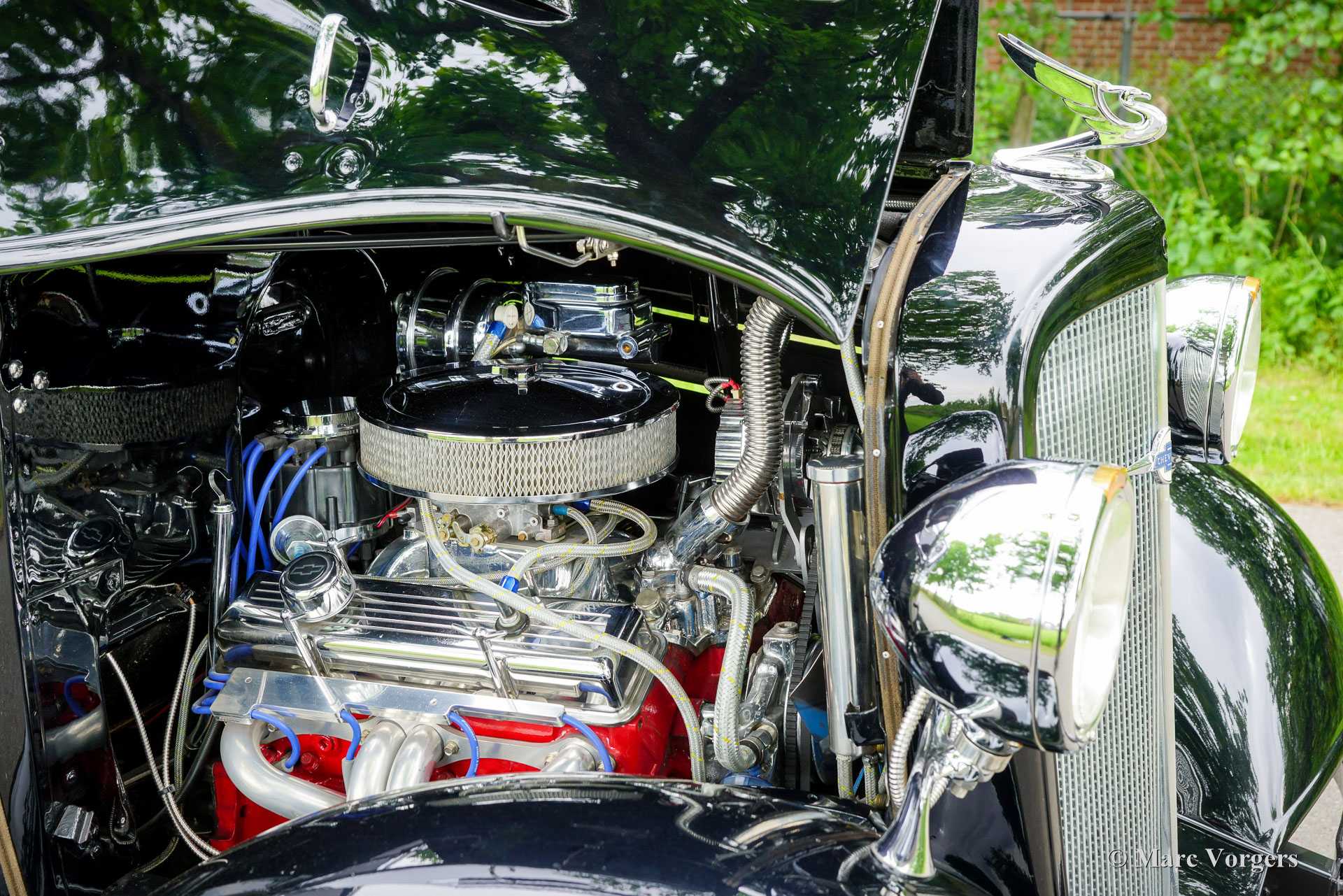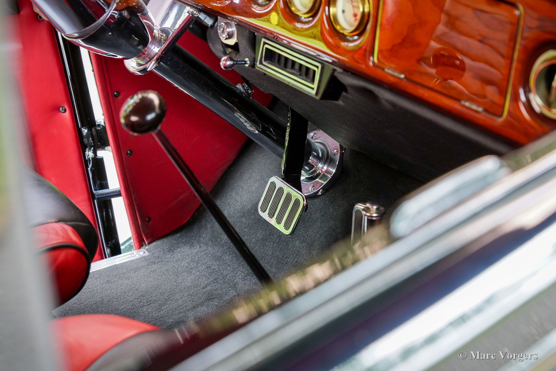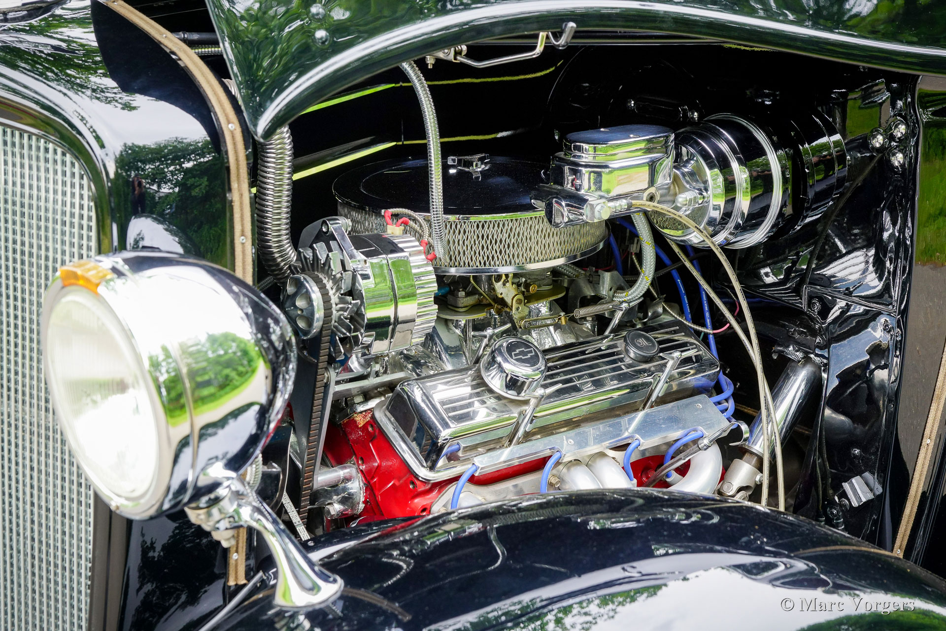 Freinage et direction : Freins à disque à l’avant, complétés par un système Air4Link triangulaire en acier inoxydable poli à l’arrière, servofrein chromé, nouvelles conduites de frein et direction assistée. - Groupe motopropulseur : Moteur V8 Chevrolet 350 C.I.D. long block (290 ch) de Summit Racing, associé à une transmission automatique TH350.