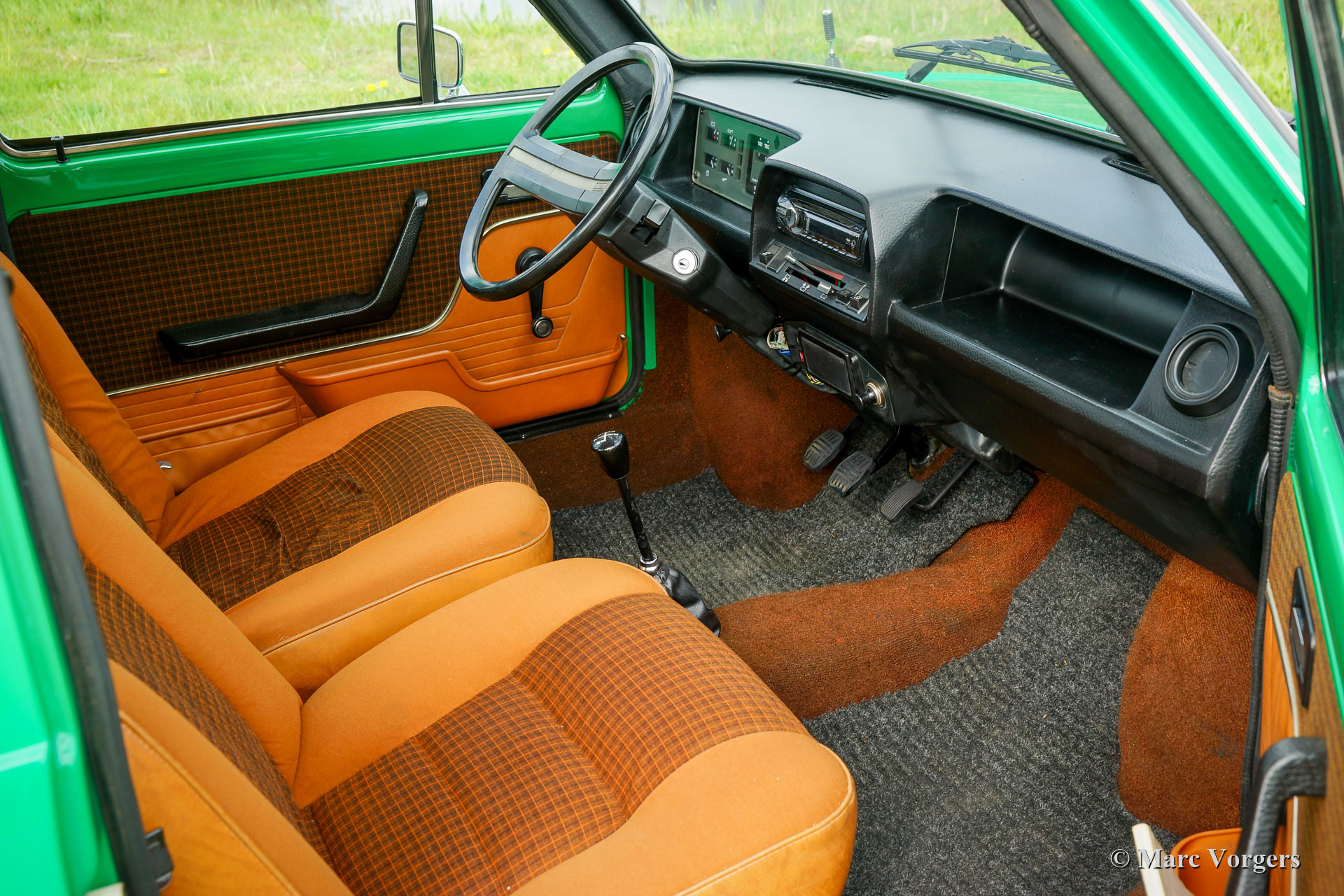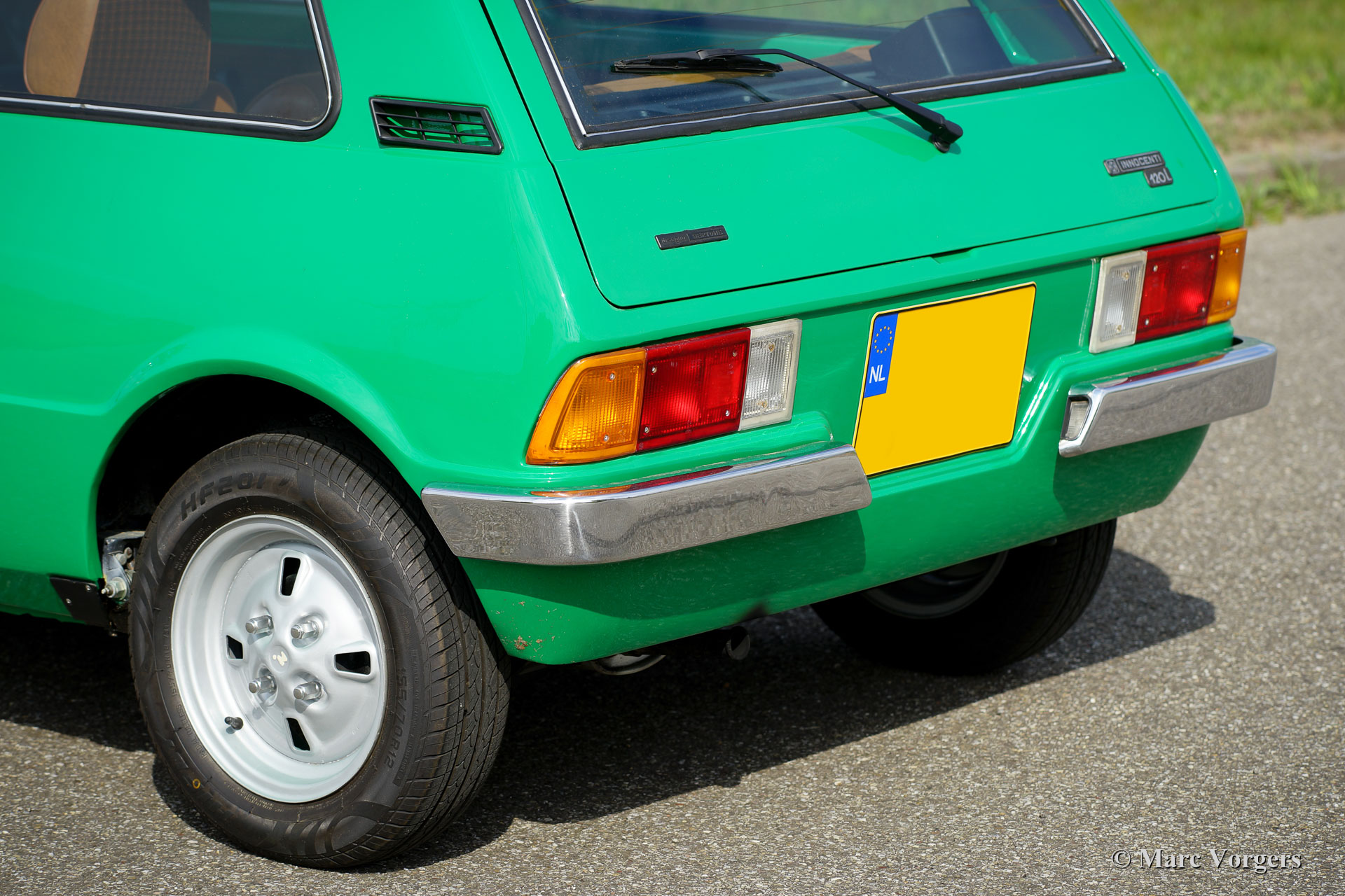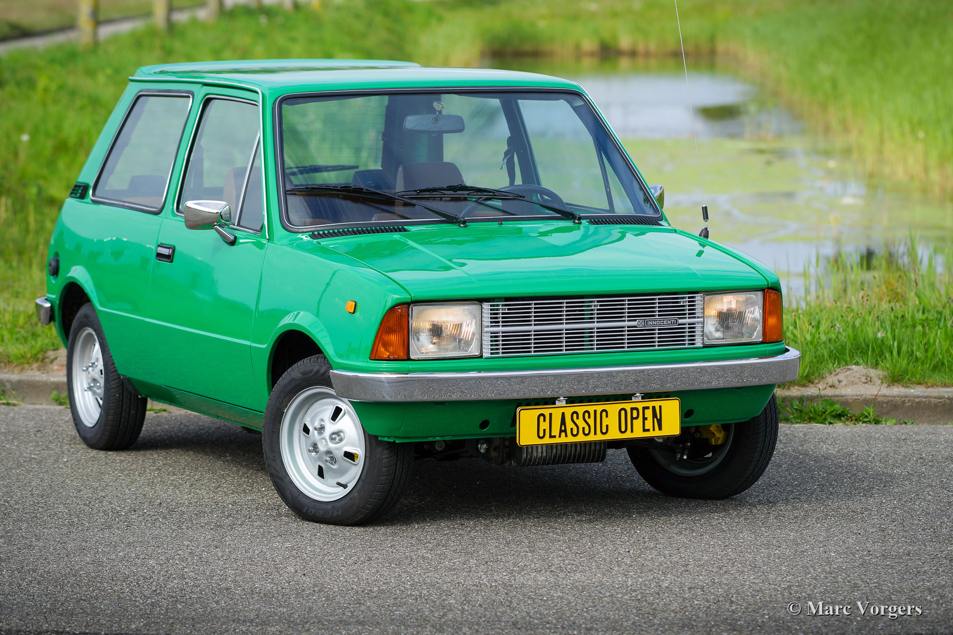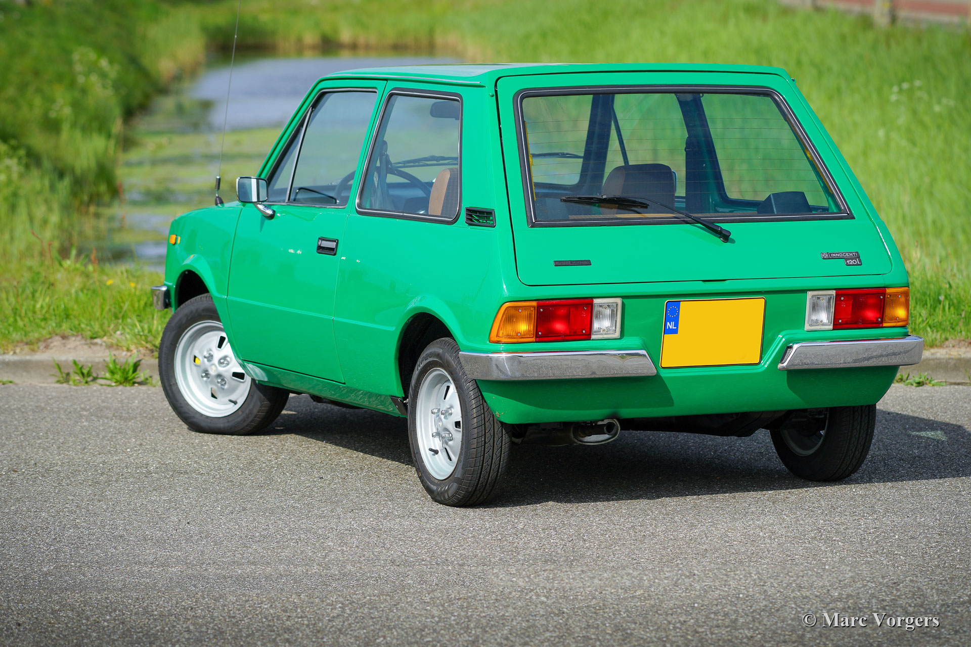 Innocenti 120 L, année 1979. Couleur vert vif associée à un intérieur en tissu marron / cognac avec des tapis de sol de protection gris. Cette fabuleuse Innocenti 120 L a été vendue neuve aux Pays-Bas. Ces dernières années, la voiture fut largement restaurée pour retrouver son ancienne gloire pour un passionné d'Innocenti. Le travail fut fait dans le souci de l'originalité de l'usine. L'excellent intérieur d'origine fut conservé, seul le siège conducteur présente quelques rides à partir de 43 ans. Où que vous regardiez, cette Innocenti est dans un excellent état ! La carrosserie montre un ajustement parfait des panneaux, une superbe peinture et tous les détails d'origine ! Sous le capot tout a l'air neuf, on peut imaginer que la restauration a dû coûter une petite fortune… Ces voitures sont rares, surtout en excellent état sans rouille, restaurées et révisées. L'Innocenti 120 a été conçue par le légendaire styliste automobile Bertone sur le plancher de la légendaire Mini britannique "BMC". On peut dire que cette voiture combine le meilleur des deux mondes et peut être considérée comme la Mini ultime. Malheureusement, les voitures étaient (comme la Mini britannique) sujettes à la rouille sévère. Environ 220 000 voitures de ce type furent construites et seules quelques-unes survivent. Ce merveilleux exemple a survécu et a été ramené à son ancienne gloire grâce à un énorme investissement en temps et en argent par un véritable passionné. Le prix demandé peut sembler élevé mais ne couvre pas les frais de restauration et de reconstruction. Cette Innocenti 120 L se conduit comme une Mini britannique classique avec un moteur de 1275 cm3 combiné à un intérieur et un extérieur italien très élégants. Une magnifique capsule temporelle qui rend hommage au génie du design de la Mini classique et du maître designer Bertone.