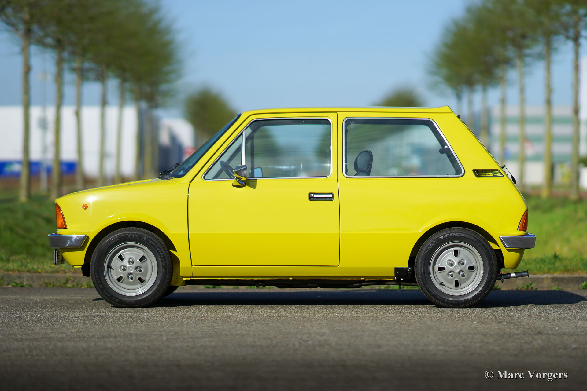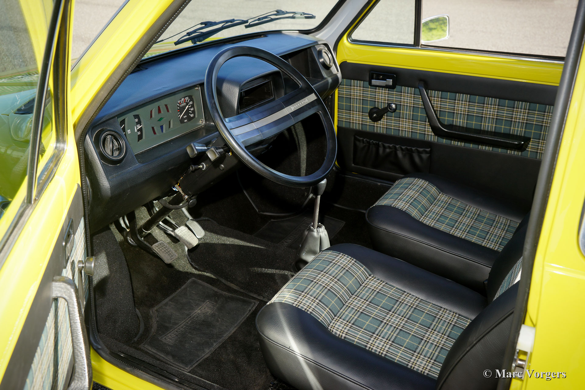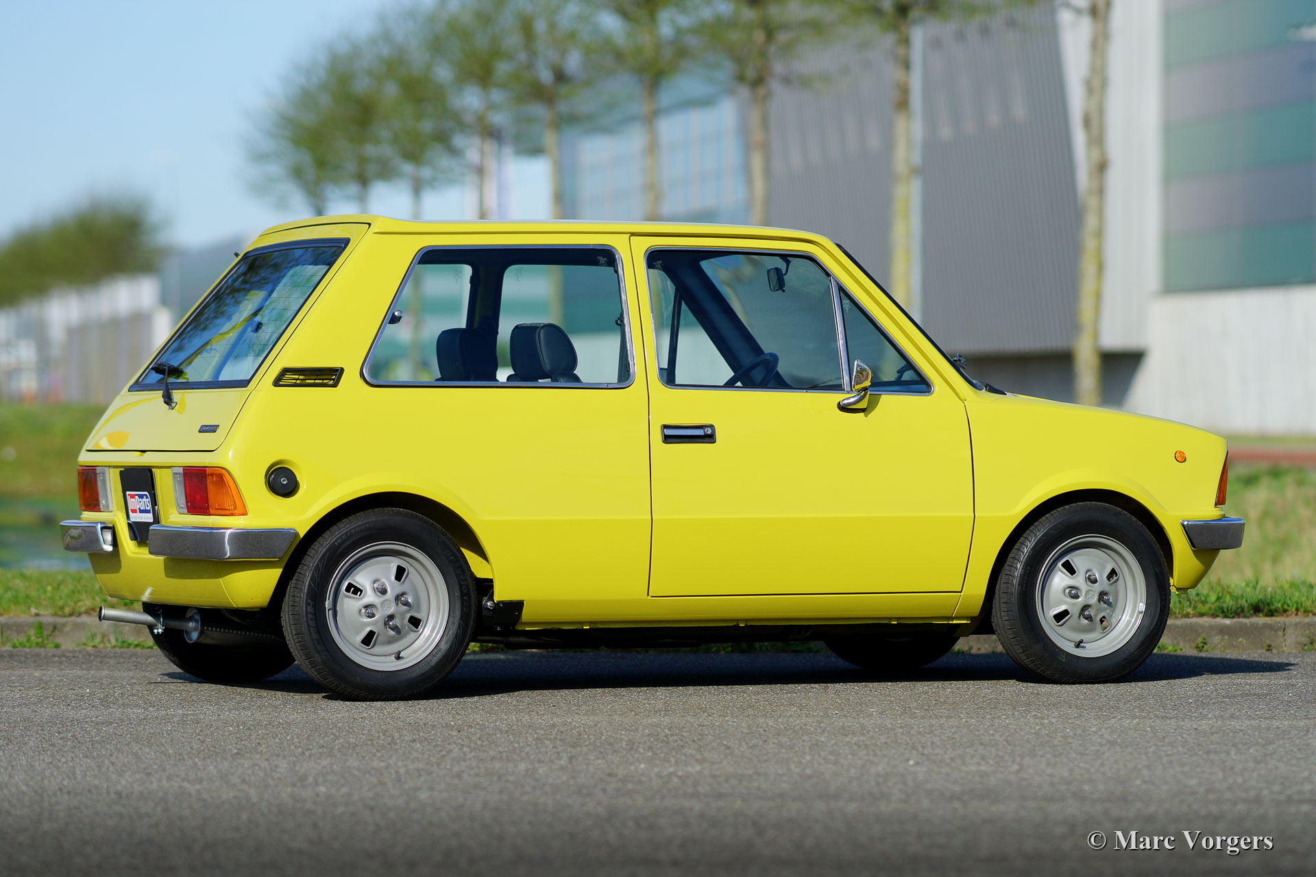 Innocenti 90L, année 1981. Couleur jaune (peinture spéciale avec une nuance de vert olive) combinée avec un intérieur noir. Les centres des sièges sont garnis de tissu « tartan » gris / vert / jaune qui se combine à merveille avec la peinture extérieure. L’Innocenti Mini a été conçue par Bertone et la voiture a été introduite en 1974. Plus tôt, Innocenti a construit une version italienne de la Mini britannique « classique ». Le nouveau design Bertone utilisait toutes les pièces mécaniques de la British Mini mais l'extérieur et l'intérieur étaient 100% modernes et italiens ! Les premiers modèles ont montré des lignes très pures et de magnifiques pare-chocs minces en chrome. Cet exemple magnifiquement restauré a été importé d'Espagne en 2017. Aux Pays-Bas, la voiture a été restaurée détaillée à la perfection ! Le corps fut restauré à partir du métal nu et a reçu un travail de peinture de première classe. L'intérieur a reçu une nouvelle sellerie… Fabriqué à la main par des professionnels. Les couleurs extérieures et intérieures furent choisies par le propriétaire, une merveilleuse palette de couleurs ! La mécanique fut entièrement révisée et le moteur quatre cylindres de 998 cm3 fut remplacé par un moteur Cooper 1275 ! Beaucoup des très rares pièces intérieures en plastique furent renouvelées.