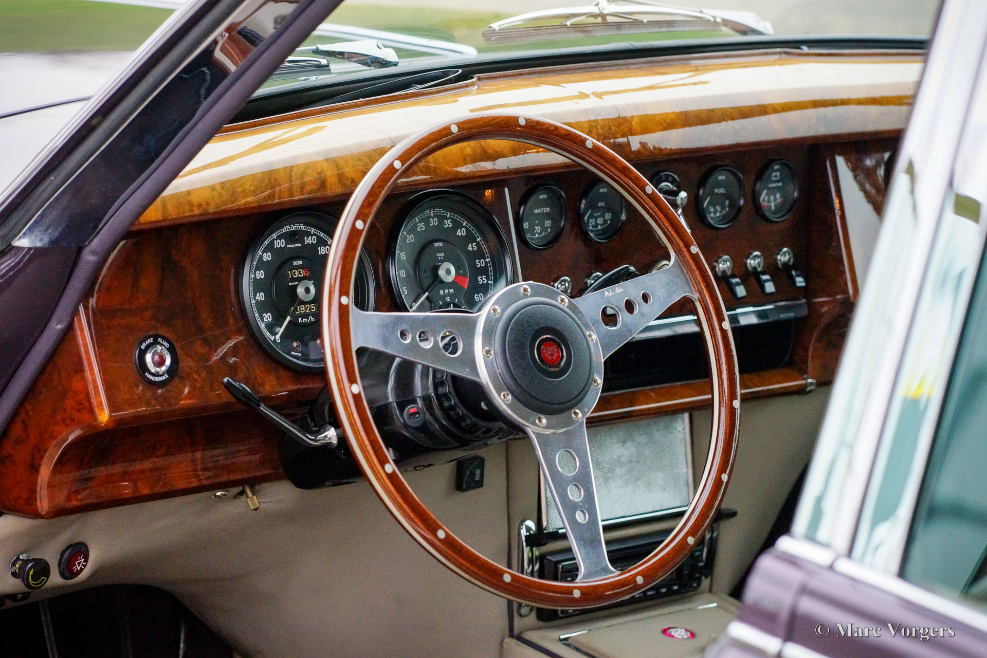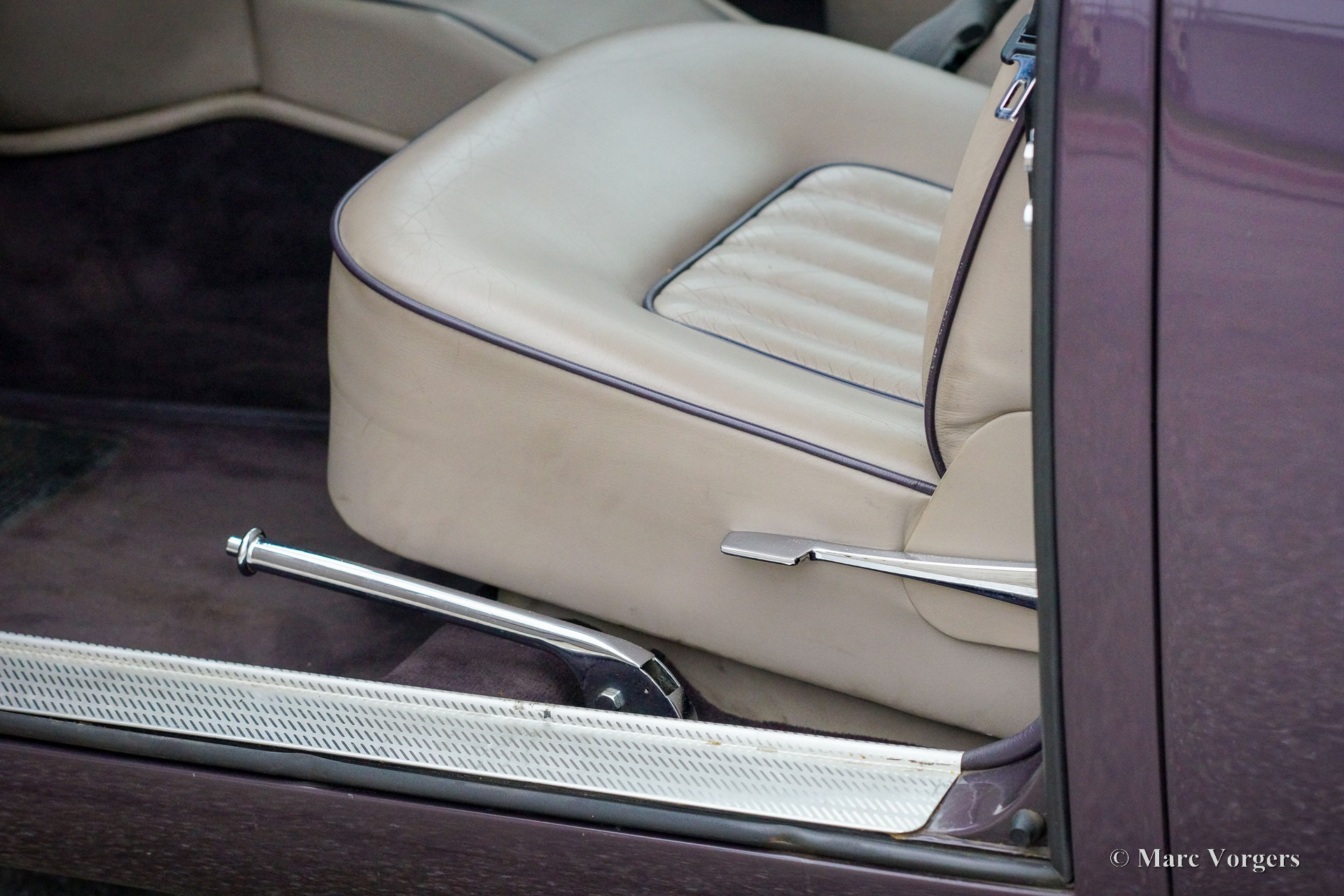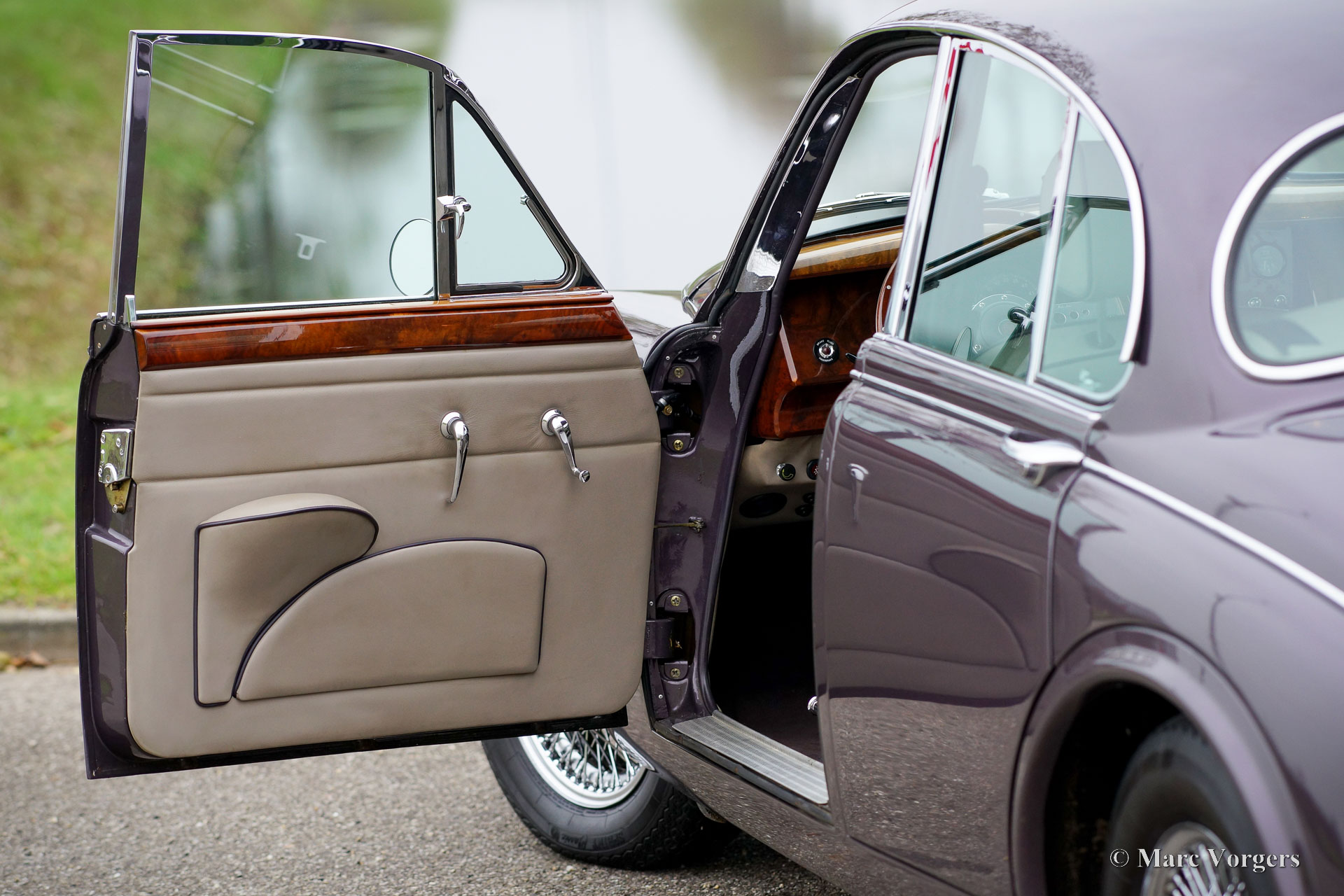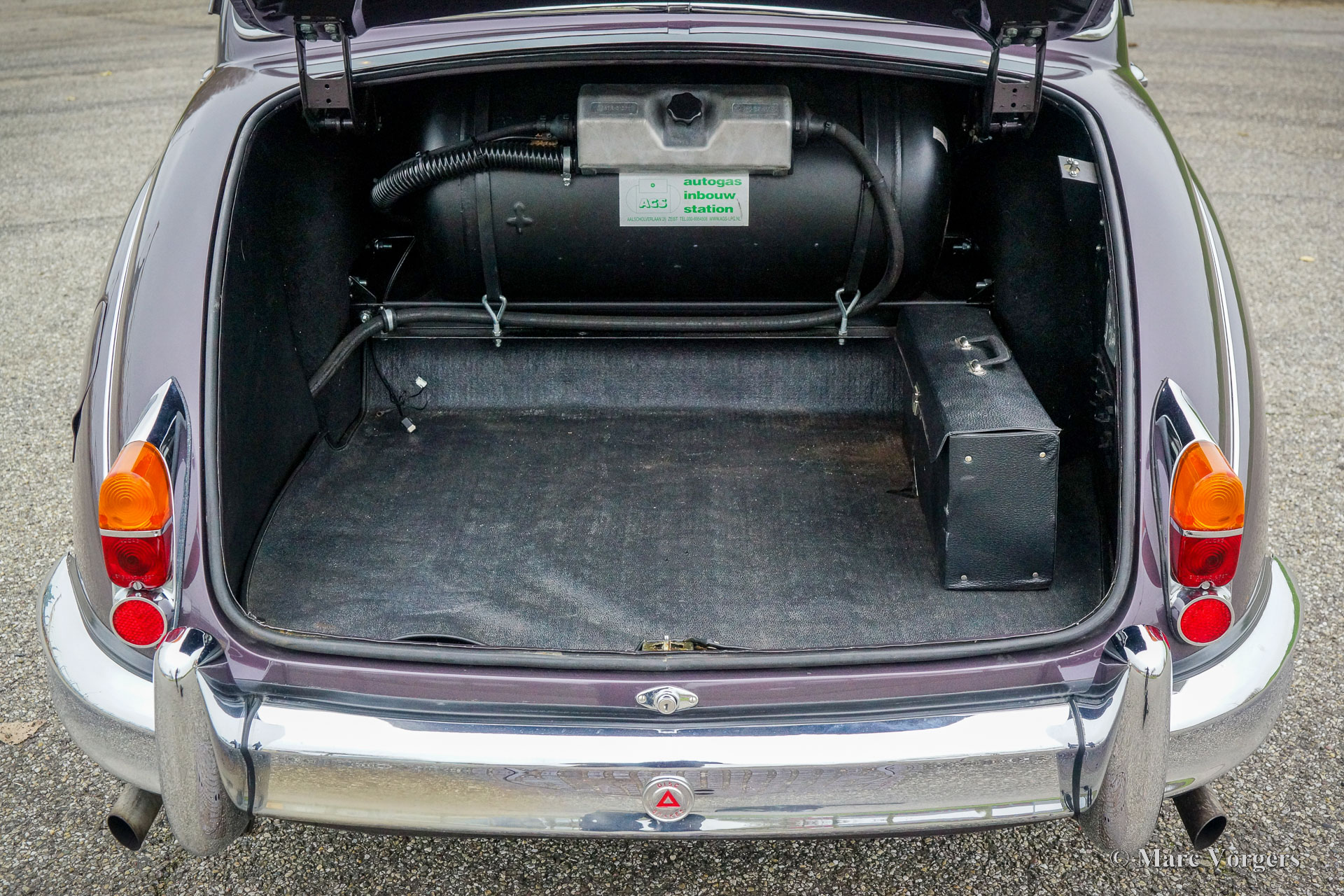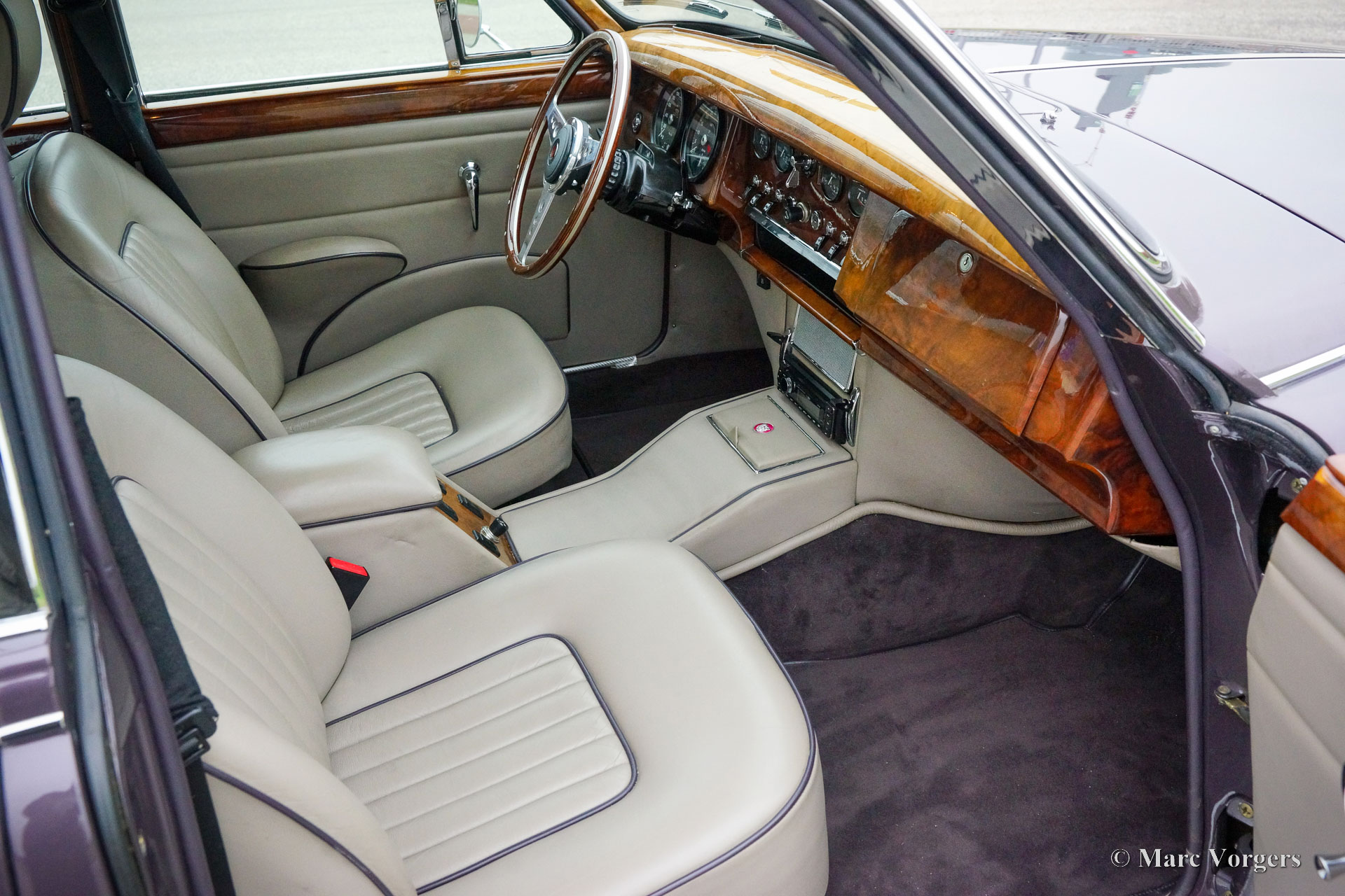 Jaguar Mk II 4,2 litres, année 1961. Couleur champagne violet métallisé combinée à un intérieur en cuir gris garni de passepoil violet et de moquette grise. Cette Jaguar Mk II remarquablement modifiée fut entièrement restaurée, révisée et améliorée selon des normes plus modernes par le groupe Roadster aux Pays-Bas. Les travaux importants furent achevés en 1999. Aujourd'hui, 23 ans plus tard, la voiture est toujours en excellent état ! L'extérieur semble avoir été récemment restauré et l'intérieur somptueux est toujours en excellent état. Le groupe Roadster était une entreprise néerlandaise renommée dans les années 1990 et au début des années 2000, construisant des modèles Jaguar Mk II sur mesure pour des clients exigeants. Ces voitures Jaguar Mk II améliorées et modernisées avaient un prix élevé. Cette Jaguar Mk II est équipée d'un puissant moteur XK de 4,2 litres à injection d'essence et d'une boîte de vitesses automatique à 4 rapports d'une Jaguar XJ6 série 3. La direction assistée et les freins assistés proviennent également de ce modèle. La suspension arrière (à l'origine avec des ressorts à lames) est désormais équipée de ressorts télescopiques INTRAX avec des amortisseurs spéciaux. L'essieu arrière a un rapport plus élevé (3,07) et un différentiel à glissement limité. Les freins furent améliorés avec des disques plus grands (ventilés) et des étriers améliorés. L'intérieur comprend des sièges Jaguar XJ confortables et plus sûrs avec appuie-tête, un accoudoir central avec interrupteurs de fenêtre, une garniture de pavillon en cuir, la climatisation, des vitres électriques, des vitres teintées et un système hifi-stéréo avec lecteur CD. De plus, la voiture est équipée de roues à rayons chromées, d'une puissante dynamo de 70 ampères, d'une installation GPL moderne et d'un double système d'échappement en acier inoxydable sur mesure. Cette Jaguar Mk II très luxueuse est une machine puissante qui est beaucoup plus rapide qu'une Jaguar Mk II standard. La tenue de route et la maniabilité sont également à un niveau bien supérieur par rapport à un Mk II standard. Une Jaguar Mk II magnifique et très spéciale !