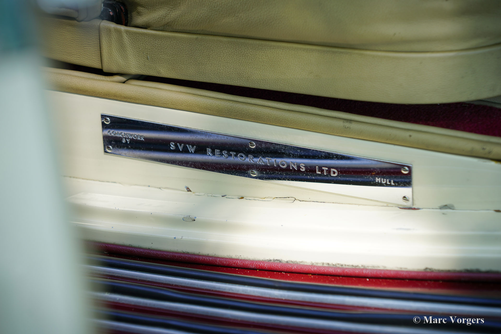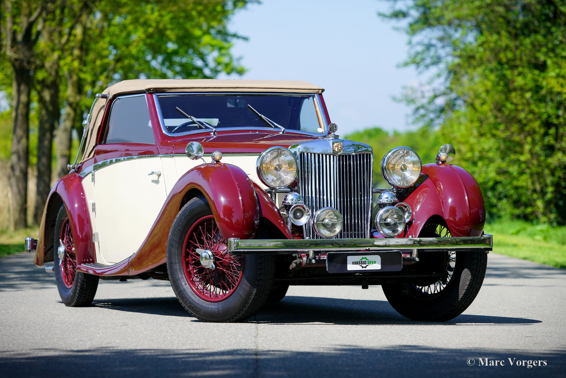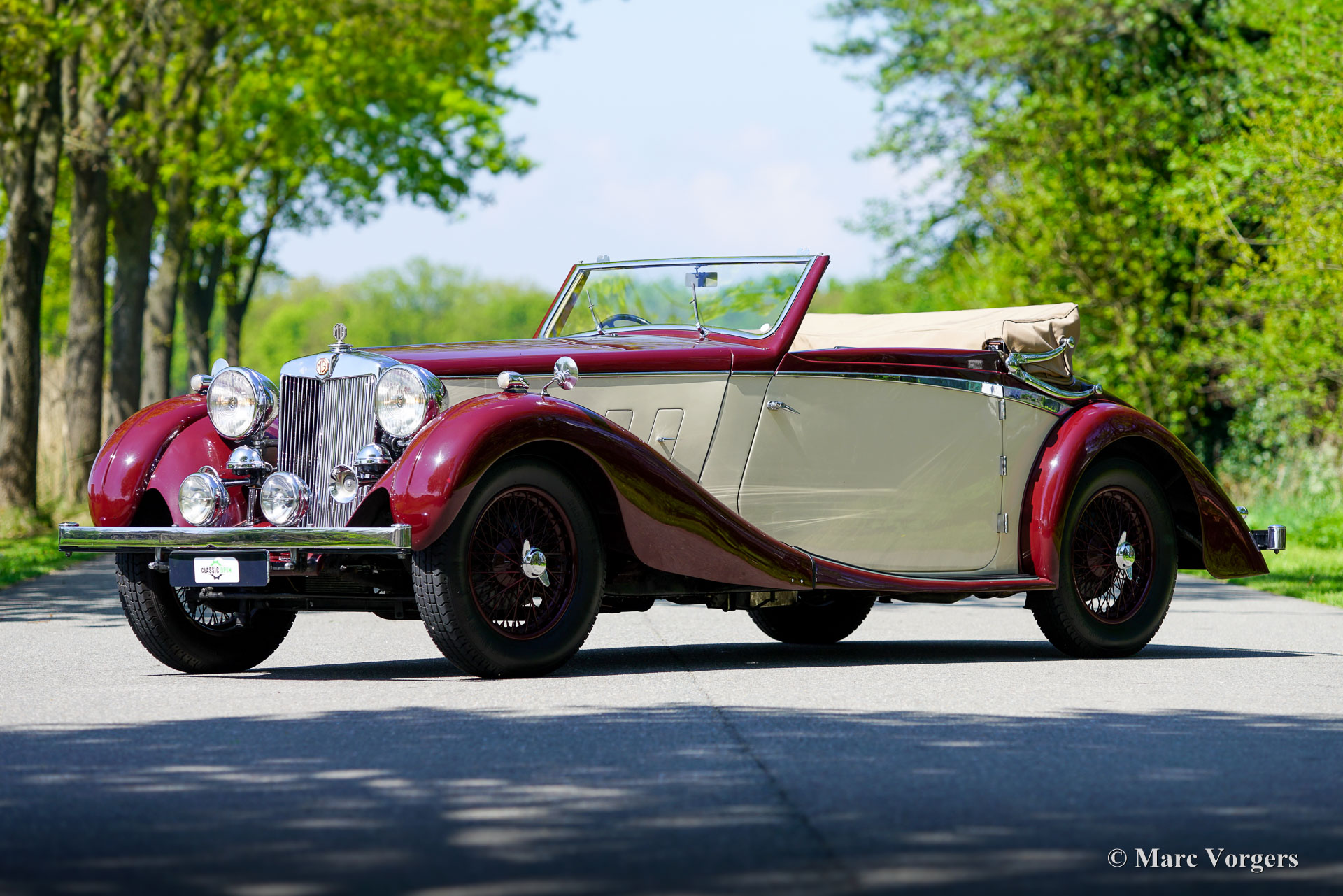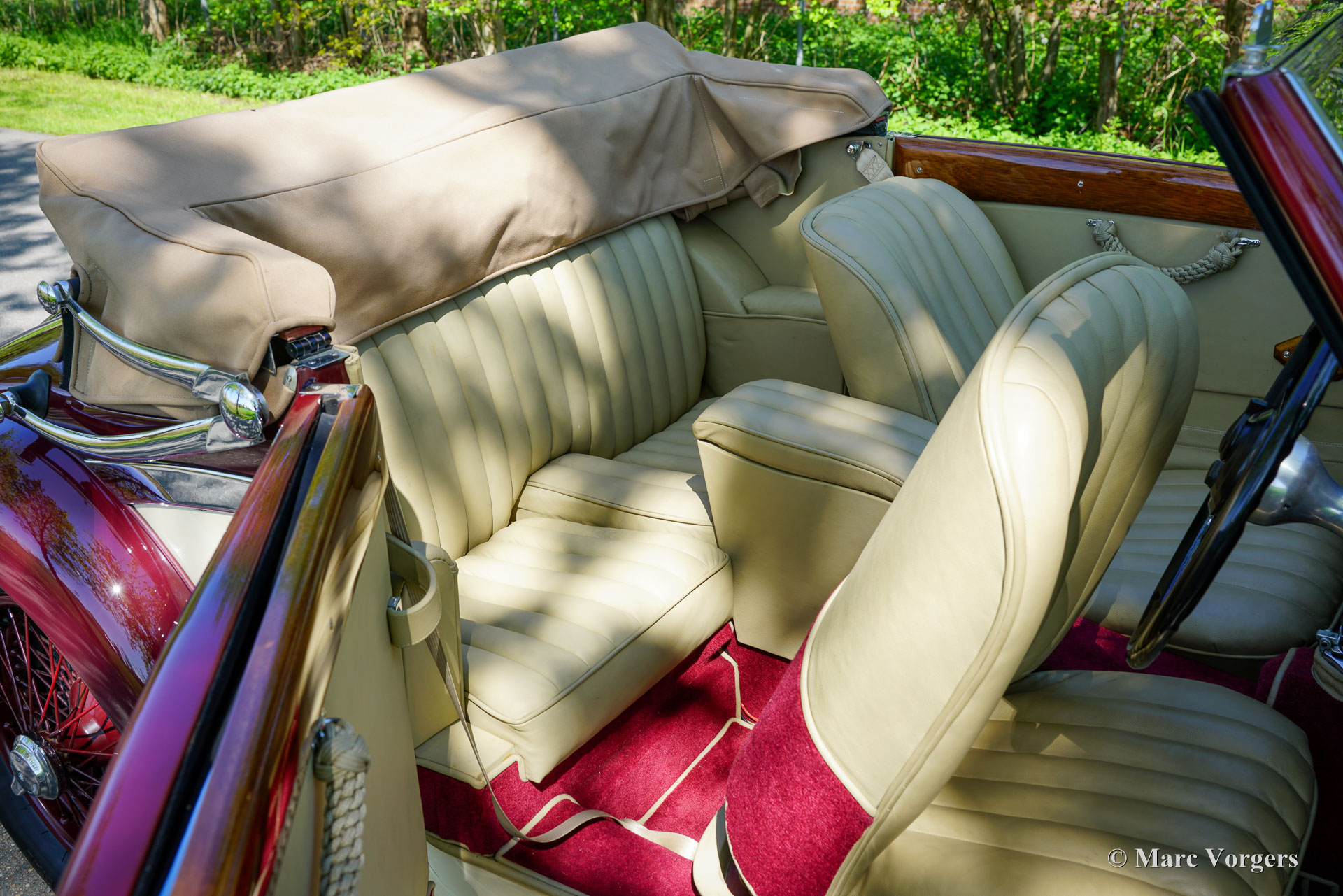 MG SA « Keller » Spéciale, année 1937. Numéro de châssis S 2004, numéro de moteur QPHG2418. Couleur extérieure bordeaux sur blanc crème, jantes bordeaux, capote et couvre-capot en mohair beige. Intérieur cuir beige, moquette bordeaux bordée de passepoils beiges. La MG SA, six cylindres de 2,3 litres, a été lancée en 1935. Ce modèle fut développé pour proposer une offre MG dans la catégorie supérieure des Alvis, SS et Lagonda. Ce châssis MG SA a quitté l'usine équipé d'une carrosserie de berline. Entre 2002 et 2009, il fut restauré et doté d'une carrosserie spéciale de type « tourer ouvert » d'une beauté époustouflante, dans le style des « Keller » suisses. Cette carrosserie artisanale avec cadre en frêne fut fournie et installée par SVW Ltd., spécialiste des MG SA/VA/WA à Hull. Cette célèbre entreprise britannique a construit sept carrosseries de style « Keller ». À la fin des années 1930, douze châssis de ce style furent construits en collaboration avec les entreprises Keller et Reinbold & Christie à Zurich, en Suisse. L'une des voitures « Keller » originales est encore connue aux États-Unis. Cette magnifique MG SA « Keller » Spécial est l'une des sept reconstitutions construites par SVW Ltd. Le châssis de la MG SA, restauré et révisé, présente des composants d'origine avec quelques améliorations. La carrosserie est composée d'un cadre en frêne, de panneaux métalliques et de portes en aluminium.