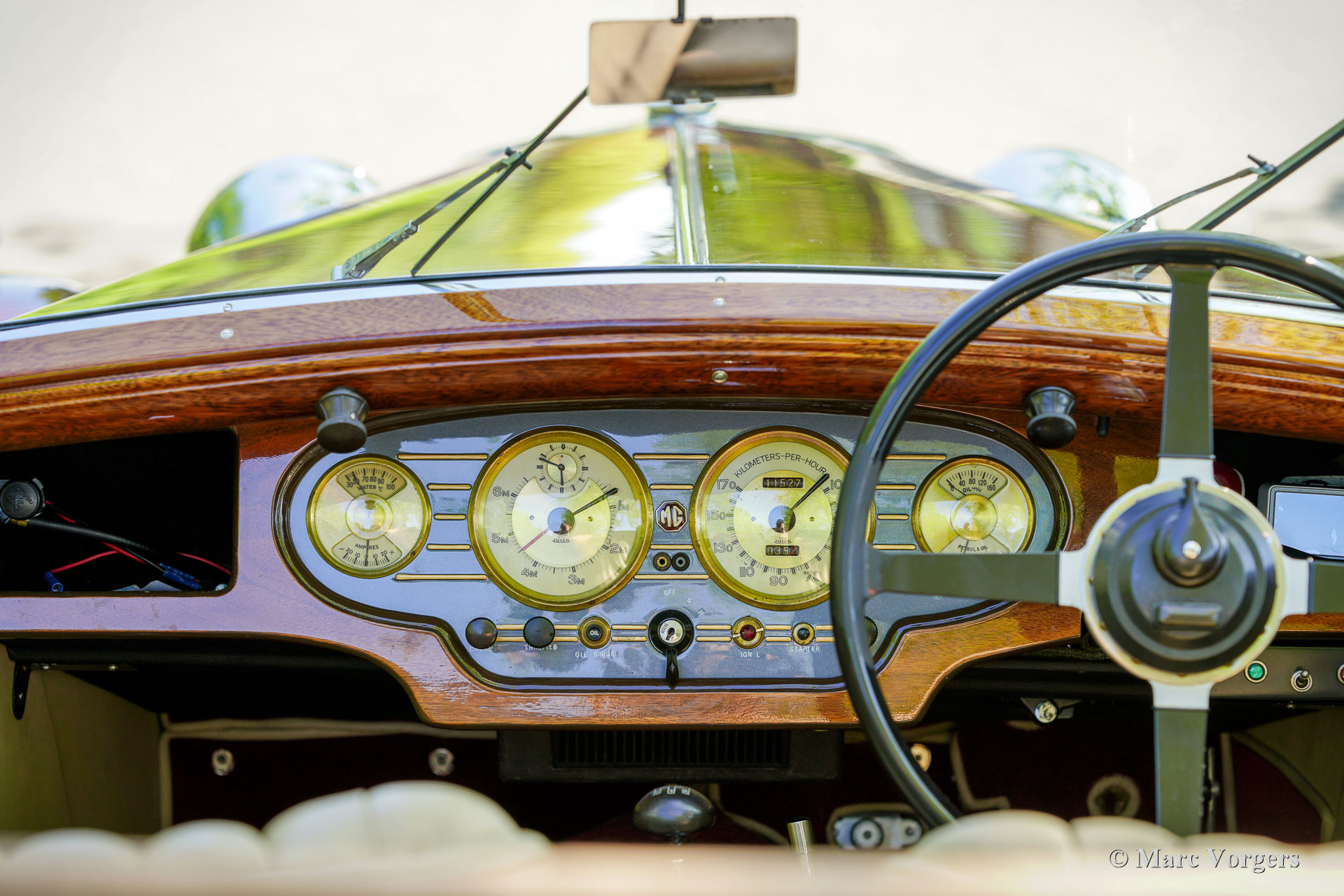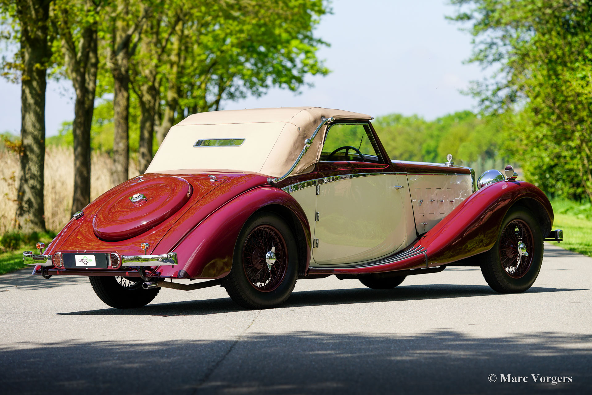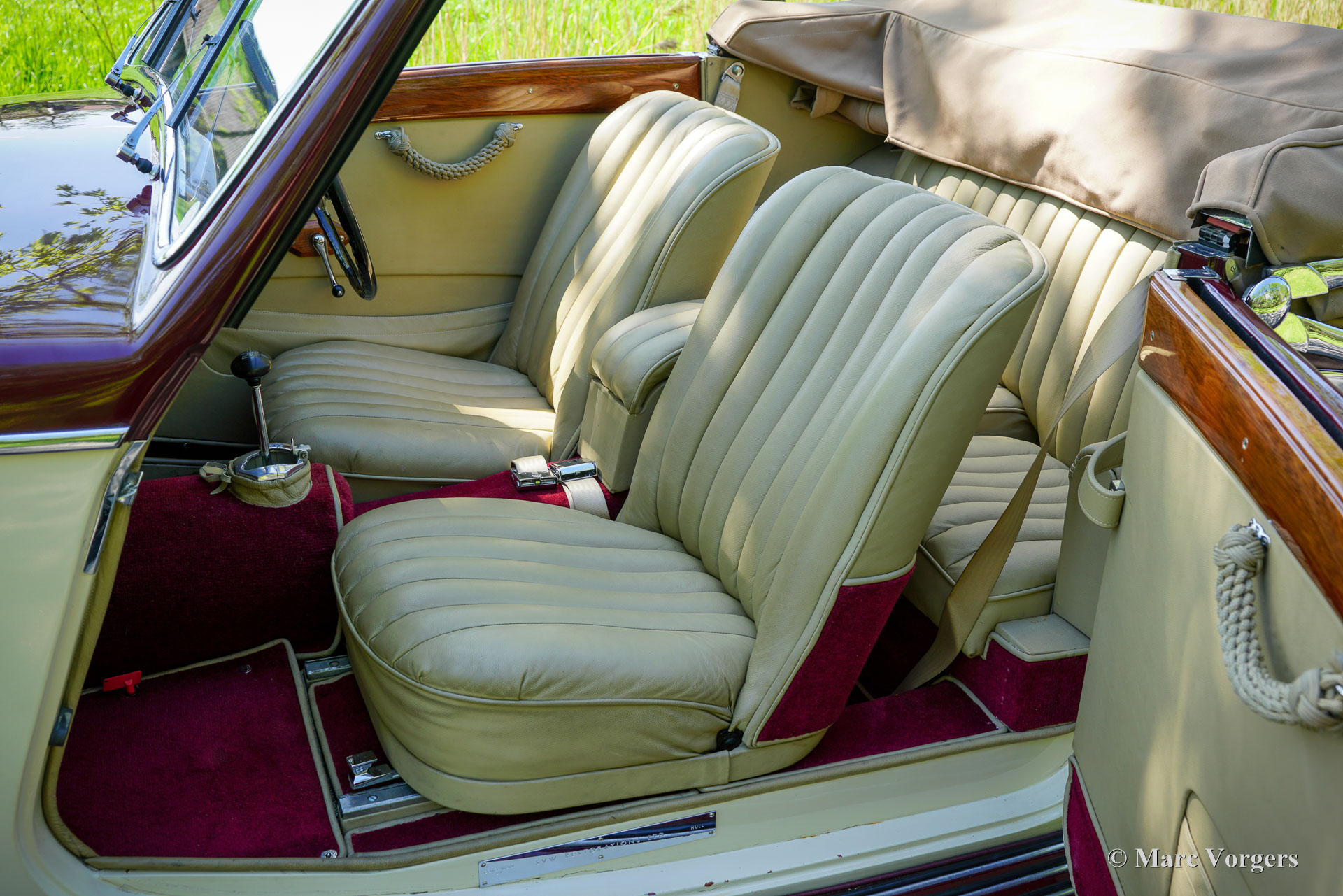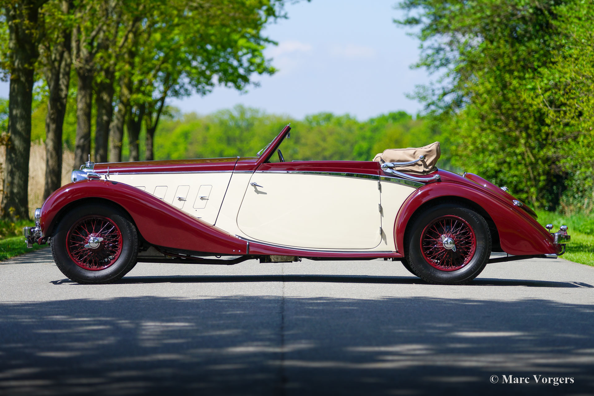 MG SA « Keller » Spéciale, année 1937. Numéro de châssis S 2004, numéro de moteur QPHG2418. Couleur extérieure bordeaux sur blanc crème, jantes bordeaux, capote et couvre-capot en mohair beige. Intérieur cuir beige, moquette bordeaux bordée de passepoils beiges. La MG SA, six cylindres de 2,3 litres, a été lancée en 1935. Ce modèle fut développé pour proposer une offre MG dans la catégorie supérieure des Alvis, SS et Lagonda. Ce châssis MG SA a quitté l'usine équipé d'une carrosserie de berline. Entre 2002 et 2009, il fut restauré et doté d'une carrosserie spéciale de type « tourer ouvert » d'une beauté époustouflante, dans le style des « Keller » suisses. Cette carrosserie artisanale avec cadre en frêne fut fournie et installée par SVW Ltd., spécialiste des MG SA/VA/WA à Hull. Cette célèbre entreprise britannique a construit sept carrosseries de style « Keller ». À la fin des années 1930, douze châssis de ce style furent construits en collaboration avec les entreprises Keller et Reinbold & Christie à Zurich, en Suisse. L'une des voitures « Keller » originales est encore connue aux États-Unis. Cette magnifique MG SA « Keller » Spécial est l'une des sept reconstitutions construites par SVW Ltd. Le châssis de la MG SA, restauré et révisé, présente des composants d'origine avec quelques améliorations. La carrosserie est composée d'un cadre en frêne, de panneaux métalliques et de portes en aluminium.
