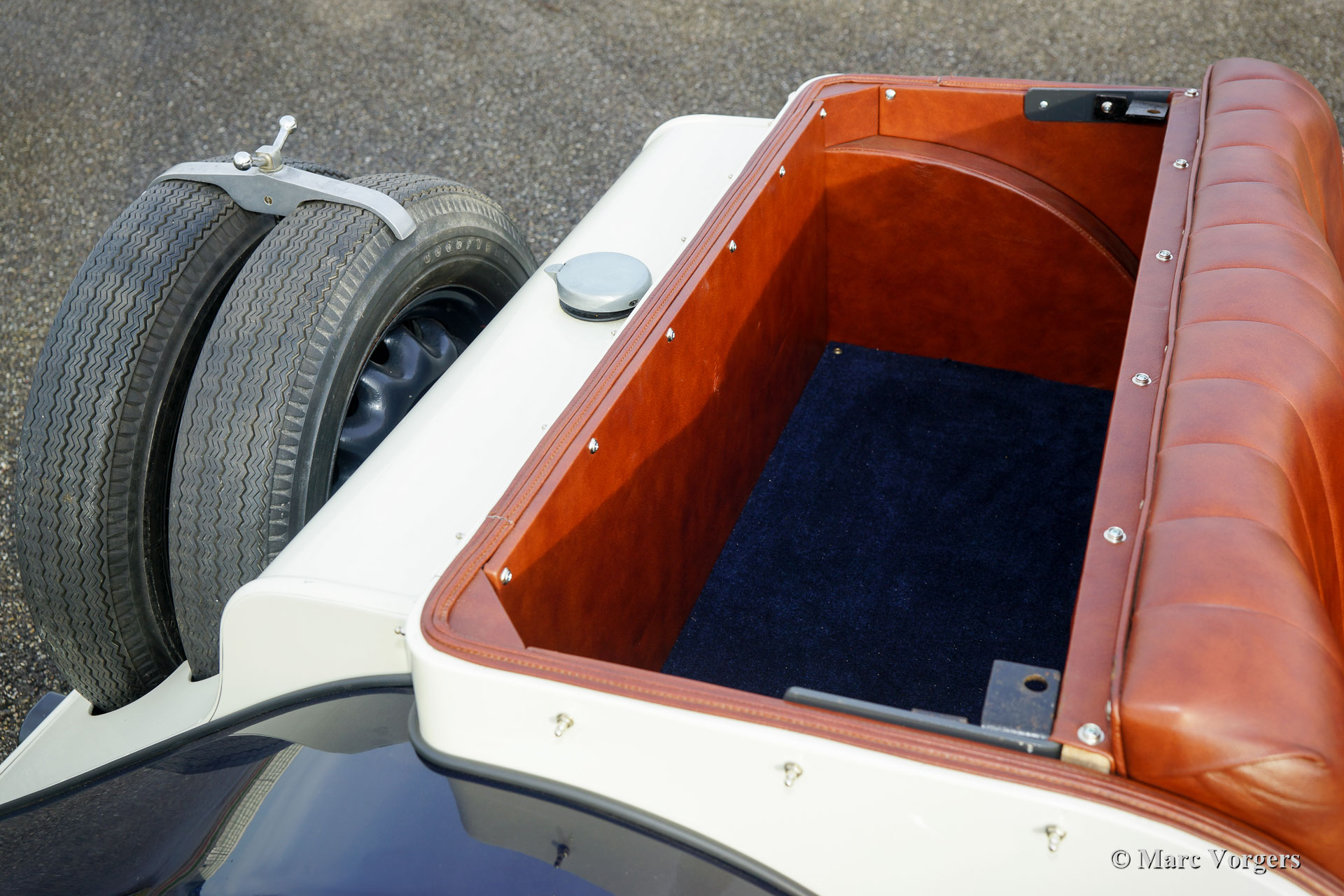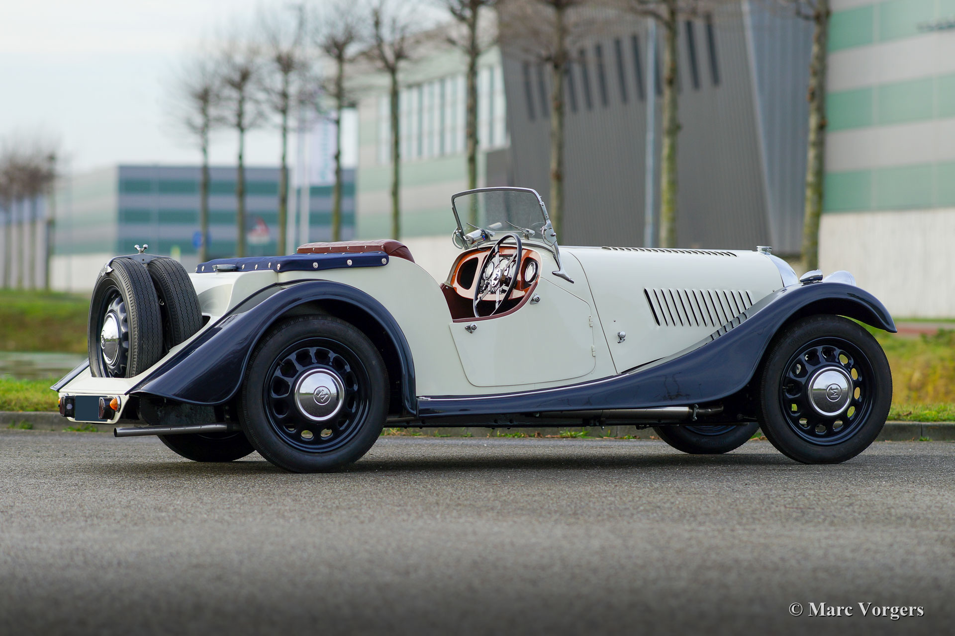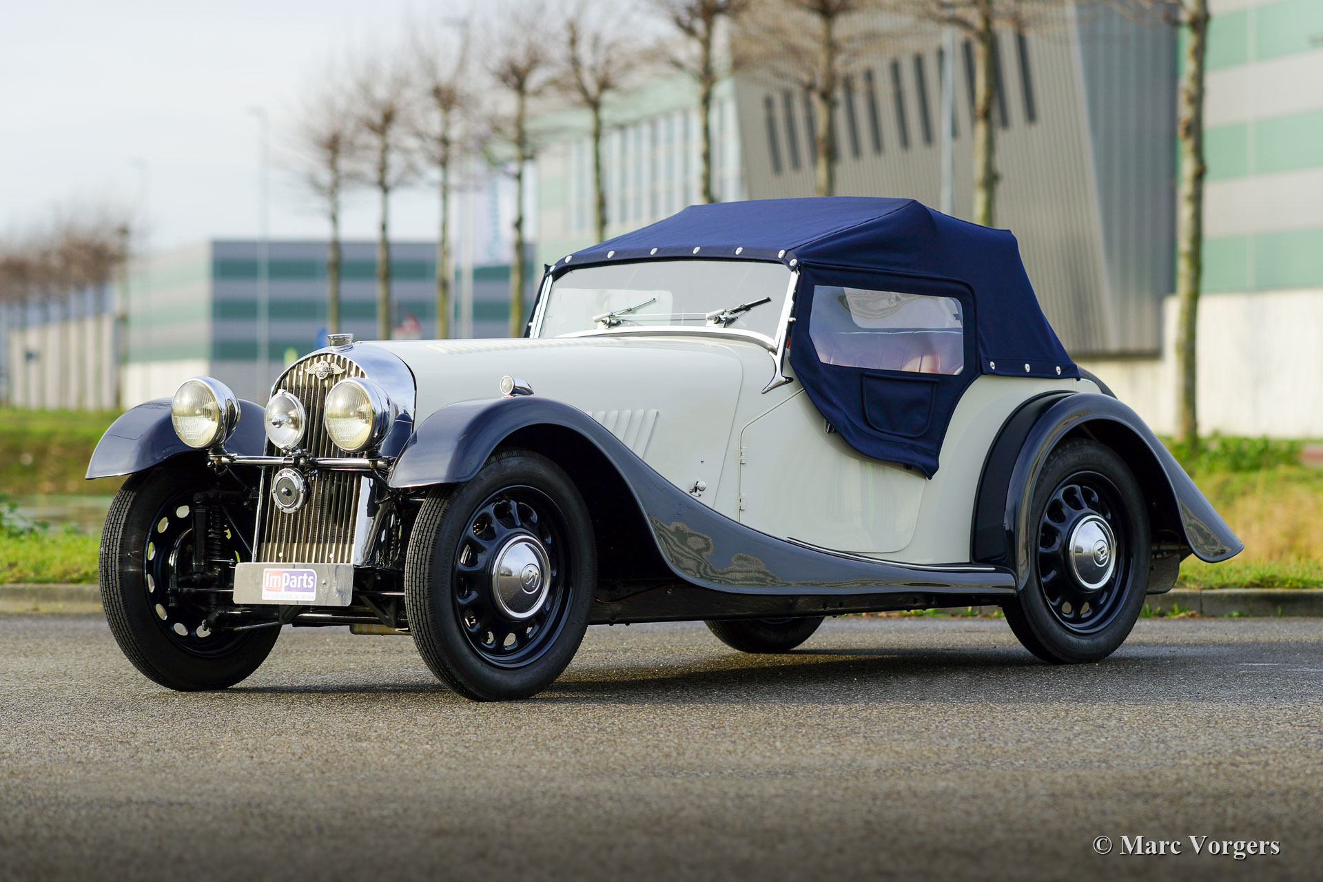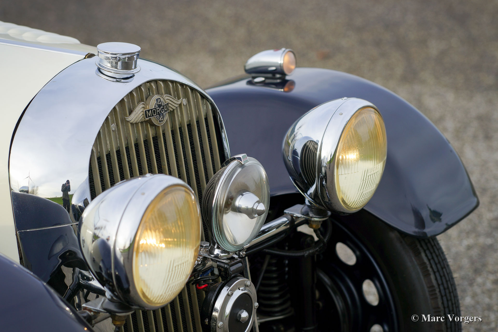 Morgan 4-4 « Flat-Rad », année 1946. Couleur bicolore ; Blanc ivoire sur bleu royal combiné avec un intérieur en cuir marron et un tapis bleu foncé. Capuche, cadres des fenêtres latéraux et tonneau arrière bleu foncé. Cette rare Morgan 4-4 « Flat Rad » fut largement restaurée et révisée. La carrosserie fut parfaitement peinte, l'intérieur fut magnifiquement rembourré et la mécanique fut révisée. Le moteur d'origine Standard 10 est reconstruit détaillée et il fonctionne et tire parfaitement. Le moteur délivre environ 40 ch et la puissance est transmise aux roues arrière via une boîte de vitesses Moss à quatre vitesses. La Morgan 4-4 « Flat Rad » (radiateur plat, les voitures ultérieures disposent d’une calandre incurvée) a été construite de 1936 à 1950. Au total, 1428 exemplaires furent construits, dont 600 étaient des modèles sportifs à 2 places. Le 4-4 fut le premier Morgan avec quatre roues et un moteur à quatre cylindres, d'où le nom du modèle 4-4. Bien sûr, ces automobiles Morgan furent construits à la main par des artisans qualifiés. Cette Morgan 4-4 roule délicieusement et elle ressemble à une image ! L'intérieur offre amplement d'espace et d'espace pour les bagages derrière les sièges. Ces voitures sont rarement proposées à la vente, une occasion unique d’acheter un Morgan 4-4 ‘Flat Rad’ !