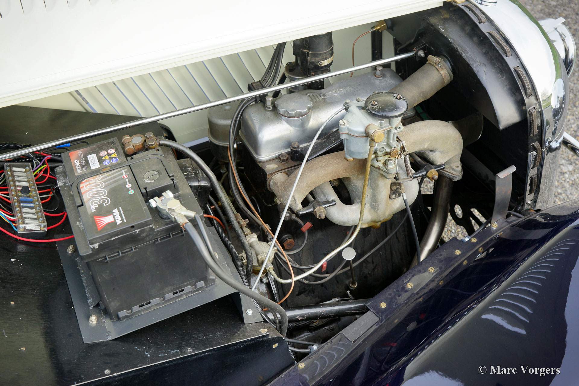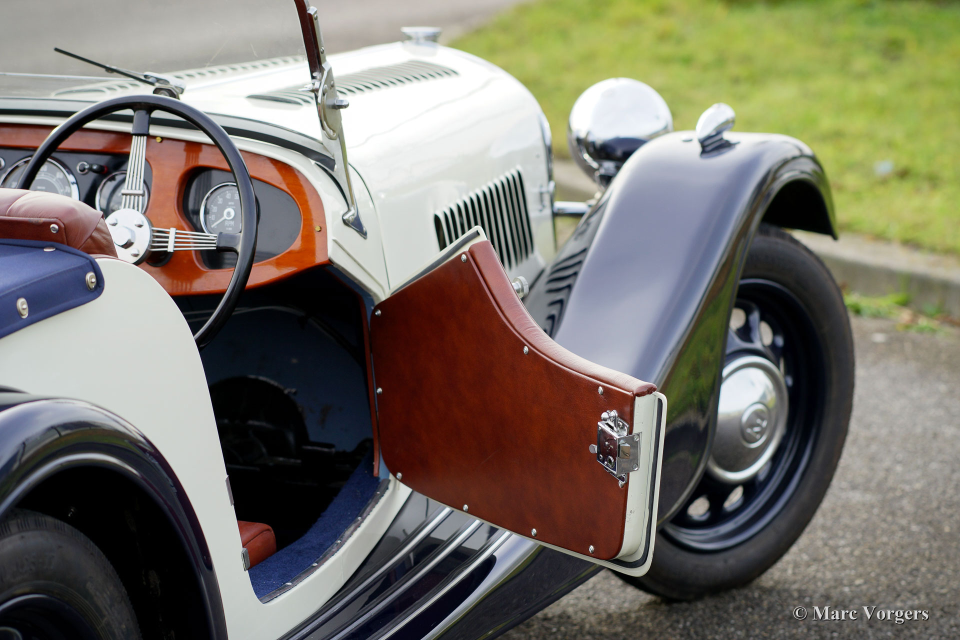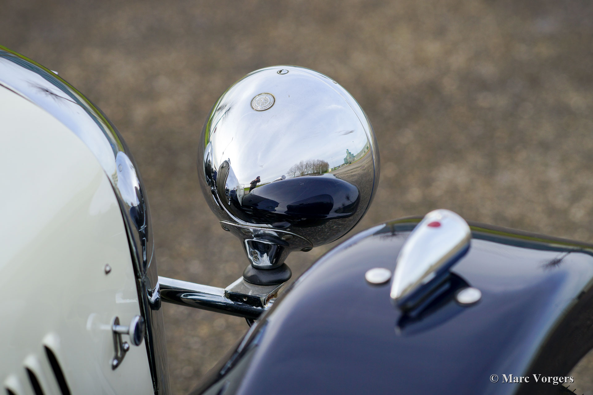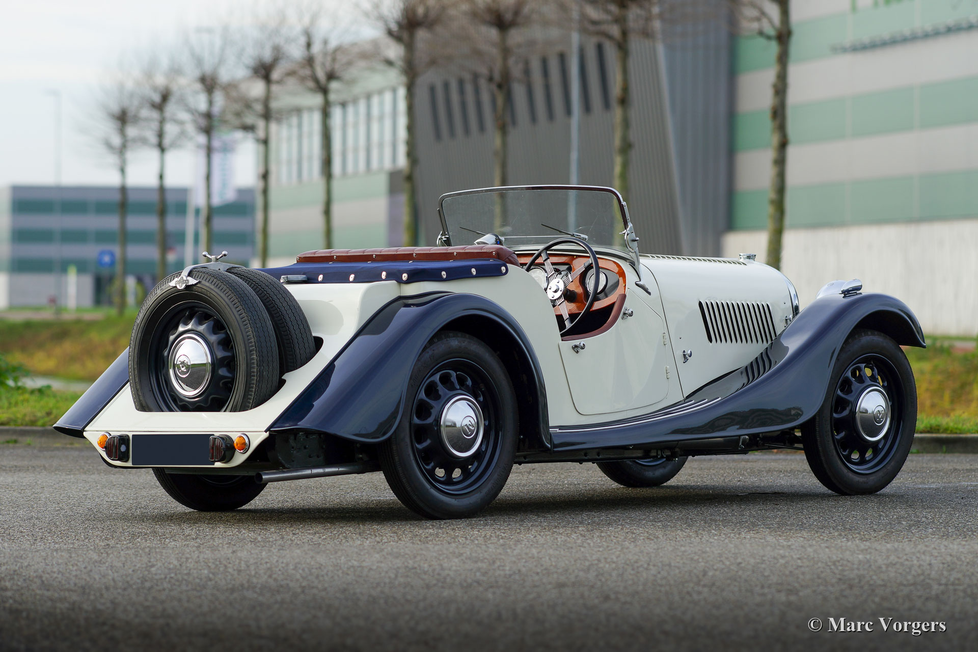 Morgan 4-4 « Flat-Rad », année 1946. Couleur bicolore ; Blanc ivoire sur bleu royal combiné avec un intérieur en cuir marron et un tapis bleu foncé. Capuche, cadres des fenêtres latéraux et tonneau arrière bleu foncé. Cette rare Morgan 4-4 « Flat Rad » fut largement restaurée et révisée. La carrosserie fut parfaitement peinte, l'intérieur fut magnifiquement rembourré et la mécanique fut révisée. Le moteur d'origine Standard 10 est reconstruit détaillée et il fonctionne et tire parfaitement. Le moteur délivre environ 40 ch et la puissance est transmise aux roues arrière via une boîte de vitesses Moss à quatre vitesses. La Morgan 4-4 « Flat Rad » (radiateur plat, les voitures ultérieures disposent d’une calandre incurvée) a été construite de 1936 à 1950. Au total, 1428 exemplaires furent construits, dont 600 étaient des modèles sportifs à 2 places. Le 4-4 fut le premier Morgan avec quatre roues et un moteur à quatre cylindres, d'où le nom du modèle 4-4. Bien sûr, ces automobiles Morgan furent construits à la main par des artisans qualifiés. Cette Morgan 4-4 roule délicieusement et elle ressemble à une image ! L'intérieur offre amplement d'espace et d'espace pour les bagages derrière les sièges. Ces voitures sont rarement proposées à la vente, une occasion unique d’acheter un Morgan 4-4 ‘Flat Rad’ !