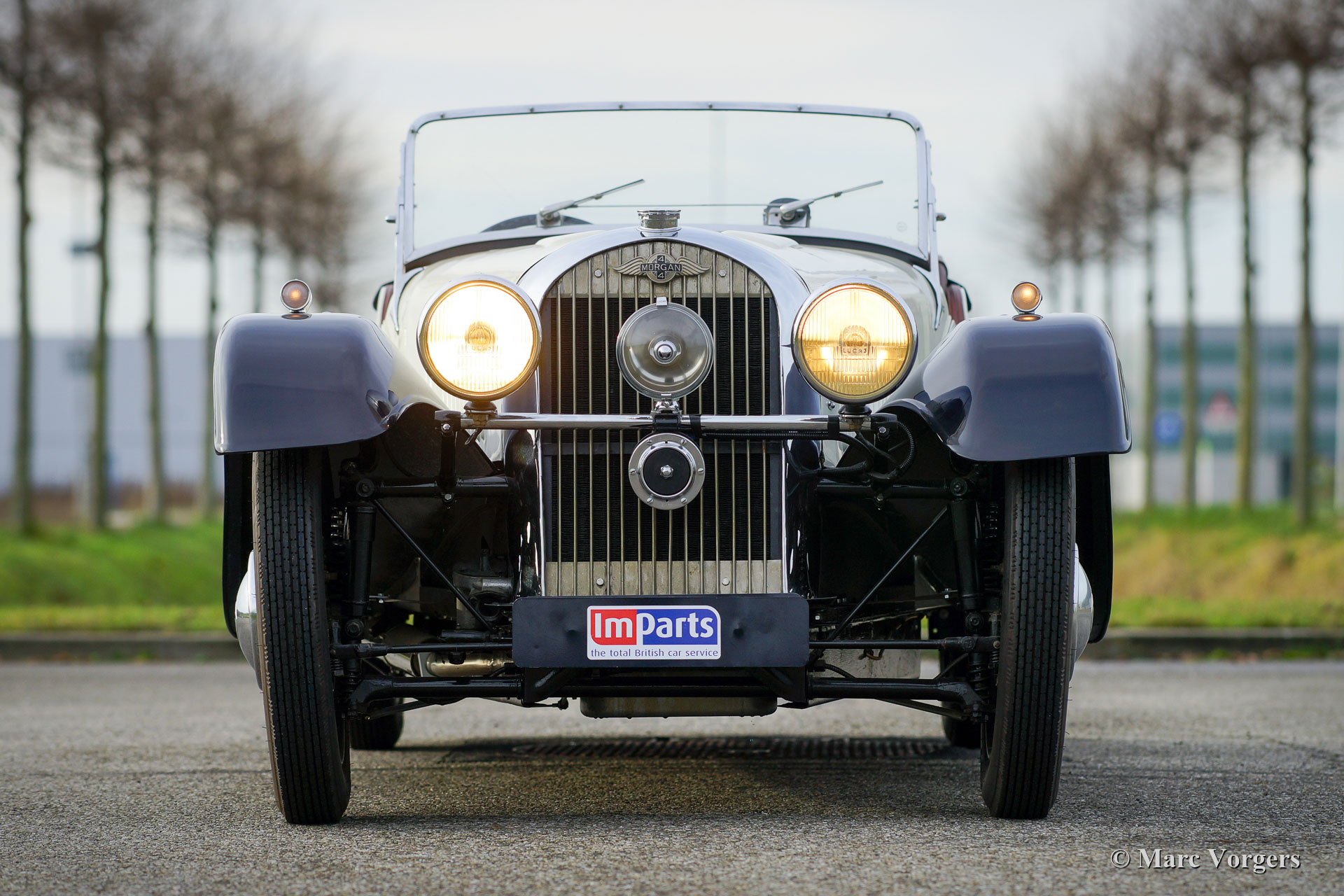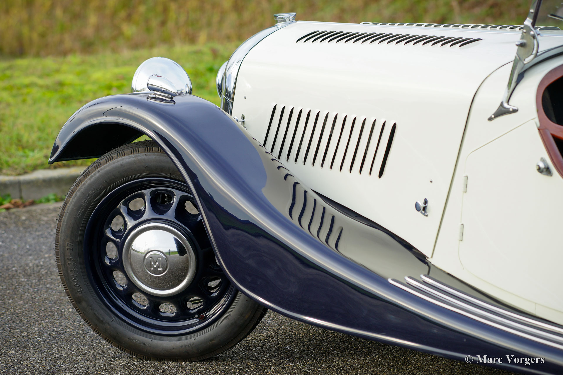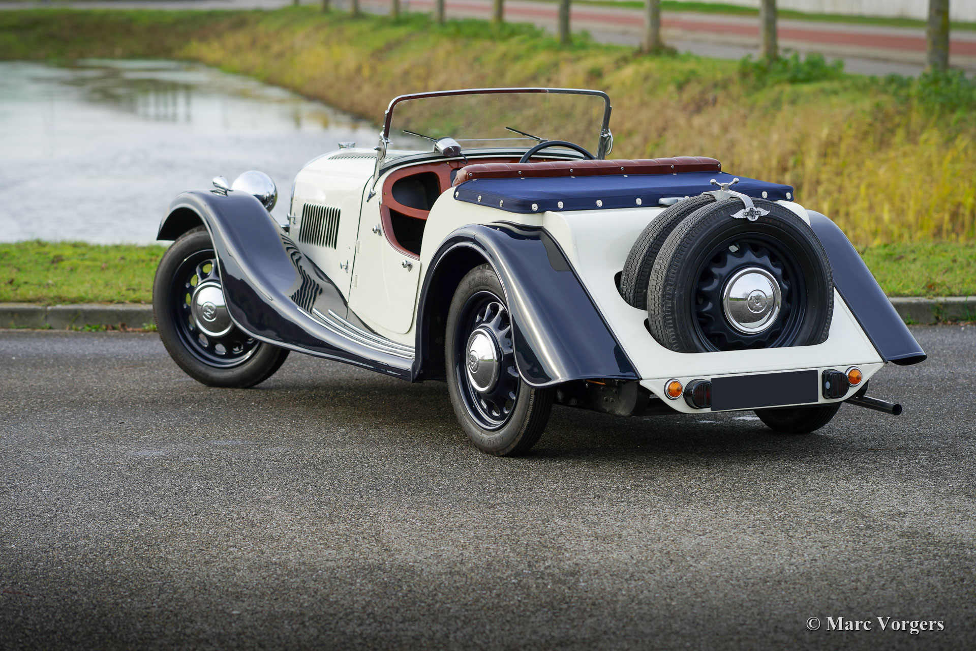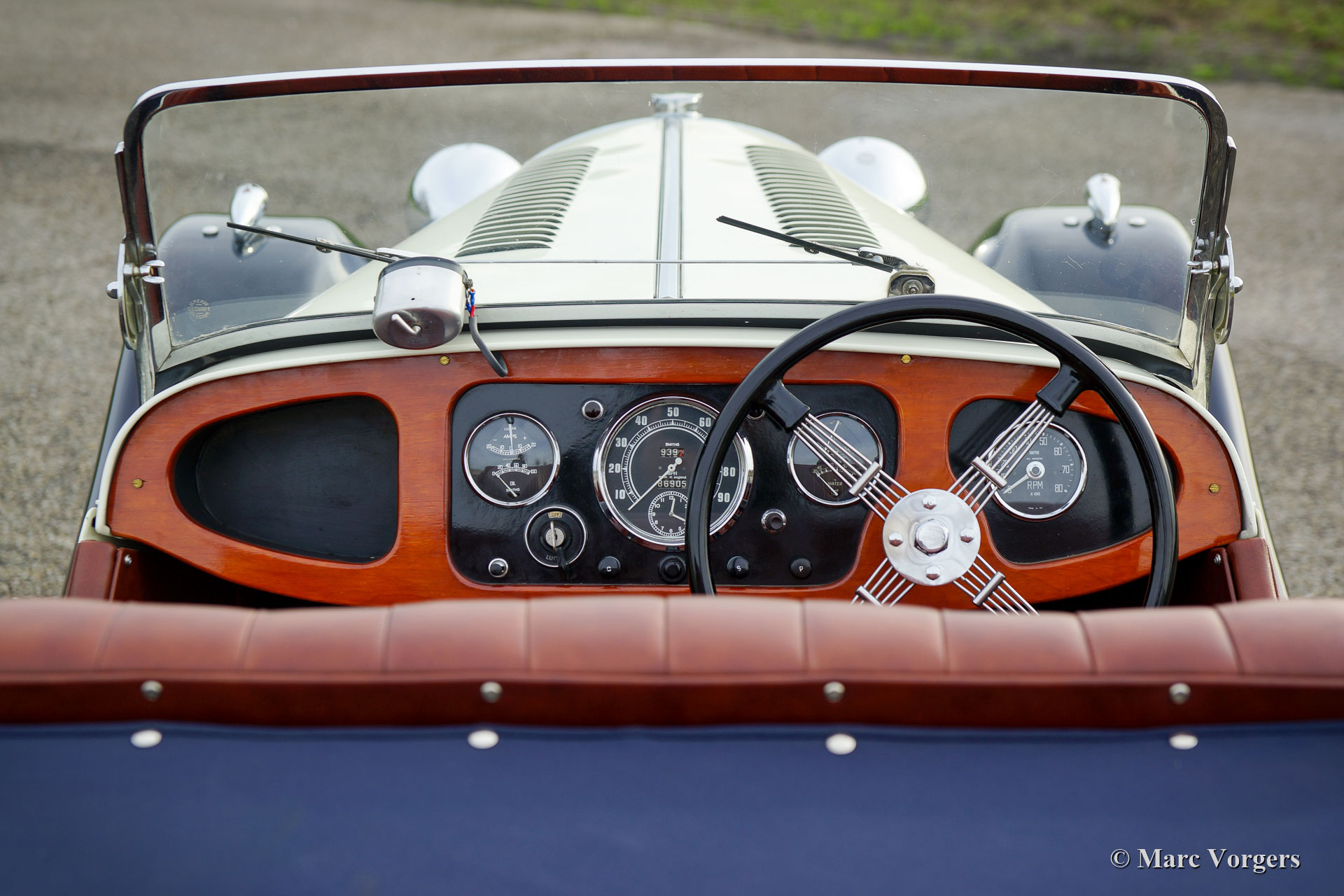 Morgan 4-4 « Flat-Rad », année 1946. Couleur bicolore ; Blanc ivoire sur bleu royal combiné avec un intérieur en cuir marron et un tapis bleu foncé. Capuche, cadres des fenêtres latéraux et tonneau arrière bleu foncé. Cette rare Morgan 4-4 « Flat Rad » fut largement restaurée et révisée. La carrosserie fut parfaitement peinte, l'intérieur fut magnifiquement rembourré et la mécanique fut révisée. Le moteur d'origine Standard 10 est reconstruit détaillée et il fonctionne et tire parfaitement. Le moteur délivre environ 40 ch et la puissance est transmise aux roues arrière via une boîte de vitesses Moss à quatre vitesses. La Morgan 4-4 « Flat Rad » (radiateur plat, les voitures ultérieures disposent d’une calandre incurvée) a été construite de 1936 à 1950. Au total, 1428 exemplaires furent construits, dont 600 étaient des modèles sportifs à 2 places. Le 4-4 fut le premier Morgan avec quatre roues et un moteur à quatre cylindres, d'où le nom du modèle 4-4. Bien sûr, ces automobiles Morgan furent construits à la main par des artisans qualifiés. Cette Morgan 4-4 roule délicieusement et elle ressemble à une image ! L'intérieur offre amplement d'espace et d'espace pour les bagages derrière les sièges. Ces voitures sont rarement proposées à la vente, une occasion unique d’acheter un Morgan 4-4 ‘Flat Rad’ !