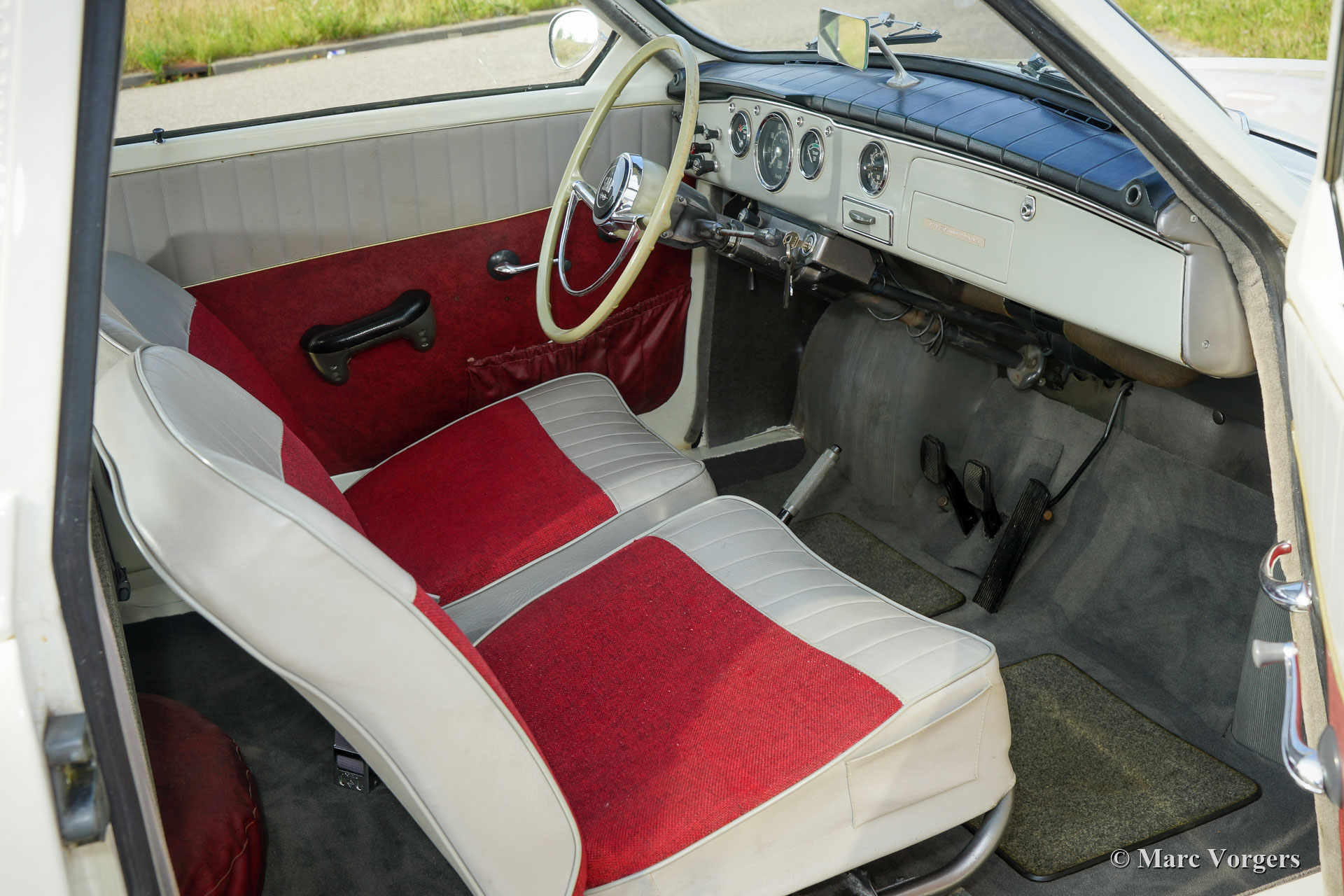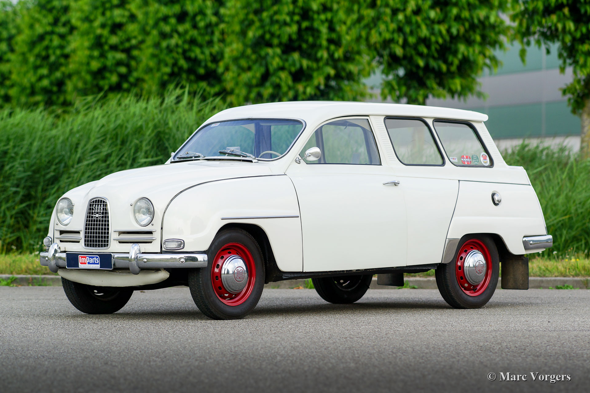 Saab 95 « deux temps » break, année 1964. Couleur blanche combinée à un intérieur rouge / gris. C’est difficile de trouver un Saab 95 break à deux temps. La voiture présente toujours le nez court. La Saab est propulsée par le légendaire moteur Saab à 3 cylindres de 841 cm3 et à deux temps. La boîte de vitesses à commande manuelle avec changement de colonne comprend quatre vitesses. Cette fantastique Saab 95 est en très bon état et super originale ! La voiture présente des signes normaux d'utilisation et d'âge ; une belle patine vintage. Les roues rouges ont fière allure sur cette voiture ! À l'époque, le break de Saab était commercialisé comme une voiture à 7 passagers, deux à l'avant, trois sur la banquette arrière et deux enfants sur la banquette spéciale dans le coffre. Les banquettes arrière peuvent être complètement repliées à plat pour obtenir un sol plat. Il s’agit d’un rare break « deux temps » Saab 95 en très bon état et dans un état super originale !