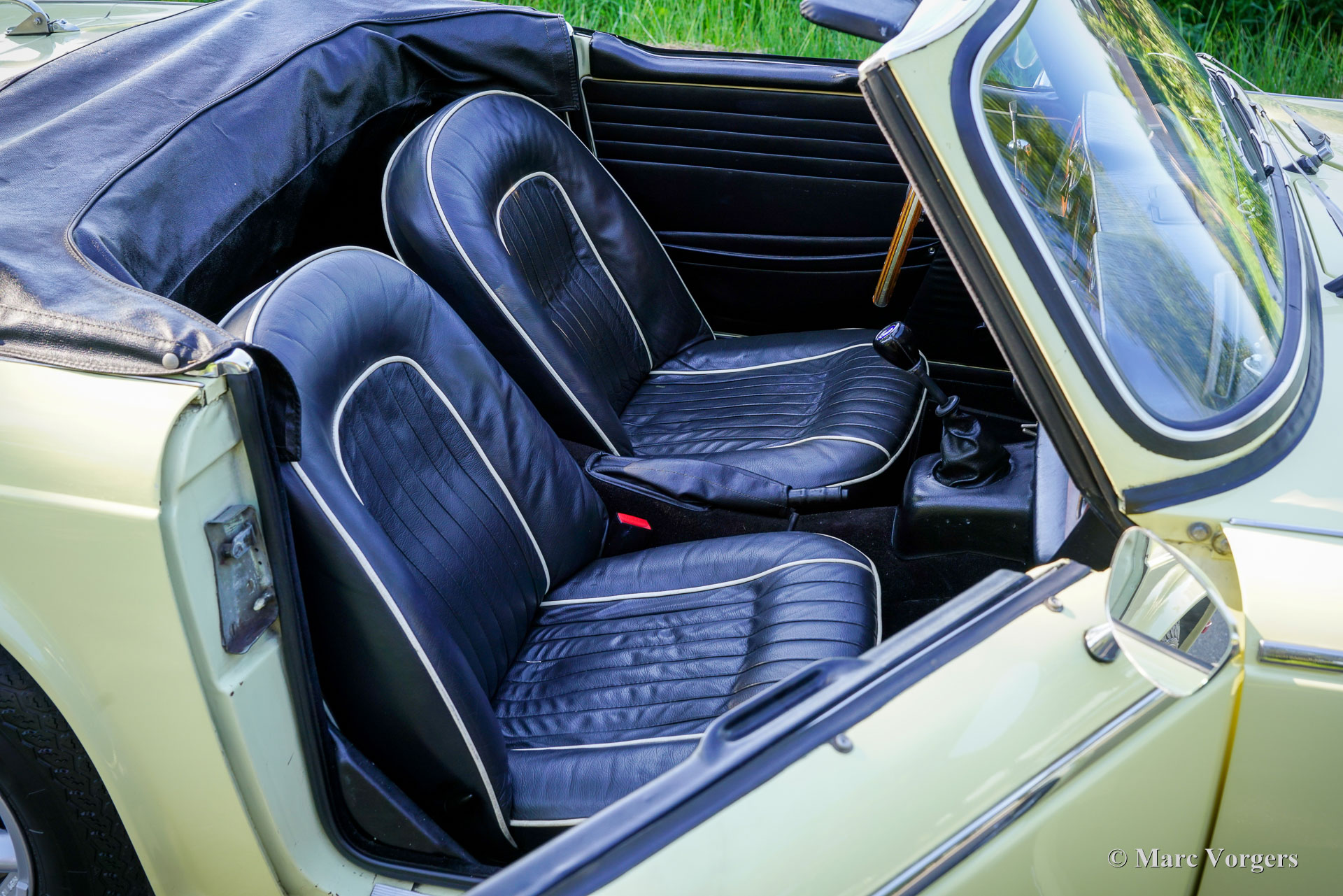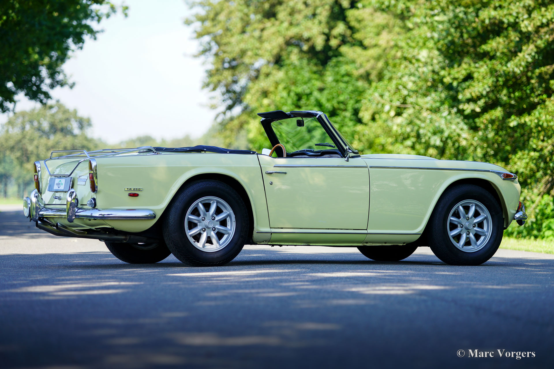 Triumph TR 250, année 1968. Couleur jaune jasmin associée à un intérieur en cuir noir garni de passepoil blanc et de tapis noir. Capote en tissu noir et housse de capote en vinyle. La Triumph TR 250 est le modèle sœur américaine de la Triumph TR 5 européenne. La TR 250 était équipée de carburateurs, la TR 5 était équipée d'une injection mécanique d'essence Lucas. La TR 250 est une Triumph rare, seuls 8484 exemplaires furent construits en 1967 et 1968. Cette Triumph TR 250 est dans un très bon état et la voiture roule et sonne à merveille ! Le merveilleux moteur six cylindres en ligne en fonte de 2,5 litres est réglé pour la « Fast Road » et est équipé du système S.U. carburateurs. De plus, la voiture est équipée d'un overdrive, de joints homocinétiques dans les demi-essieux arrière, de roues de style Minilite, d'un allumage électronique 123, d'un réservoir d'essence en acier inoxydable, d'un échappement sport en acier inoxydable et d'une pompe à essence électrique (Facet). Les lignes élégantes furent dessinées par le maître designer italien Michelotti. L'intérieur respire l'atmosphère du roadster britannique classique avec des sièges bas rapprochés, un tableau de bord en bois avec une série d'indicateurs, ainsi qu'un volant et un levier de vitesses parfaitement placés pour une expérience de conduite à la fois sportive et confortable. Cette magnifique Triumph TR 250 a été importée de l'Oregon (USA) en 1994, la voiture n'a connu depuis qu'un seul propriétaire passionné. Une superbe voiture de conducteur !