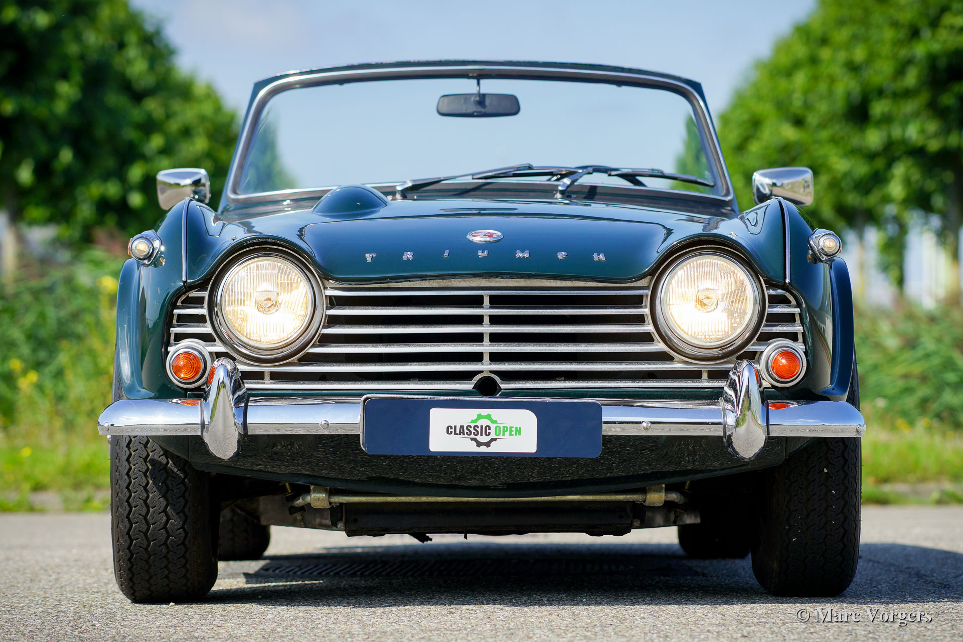 The Triumph TR 4 is a real British roadster; pure and honest. The TR 4 is built with a sturdy separate chassis with independent front suspension and a live rear axle. (IRS versions are equipped with independent rear suspension). The TR4 is equipped with disc brakes at the front and drum brakes at the rear. The bonnet shows a beautiful power bulge which gives space for the two carburettors. The Triumph TR 4 has a very beautiful wooden dashboard that is clear and functional and is equipped with large Smiths clocks. For the TR 4 a very nice "Surrey-top" is available as accessory. The Triumph "Surrey top inspired Porsche to built the Porsche "Targa" versions. The Triumph TR4 is as all the TR versions a real drivers car.