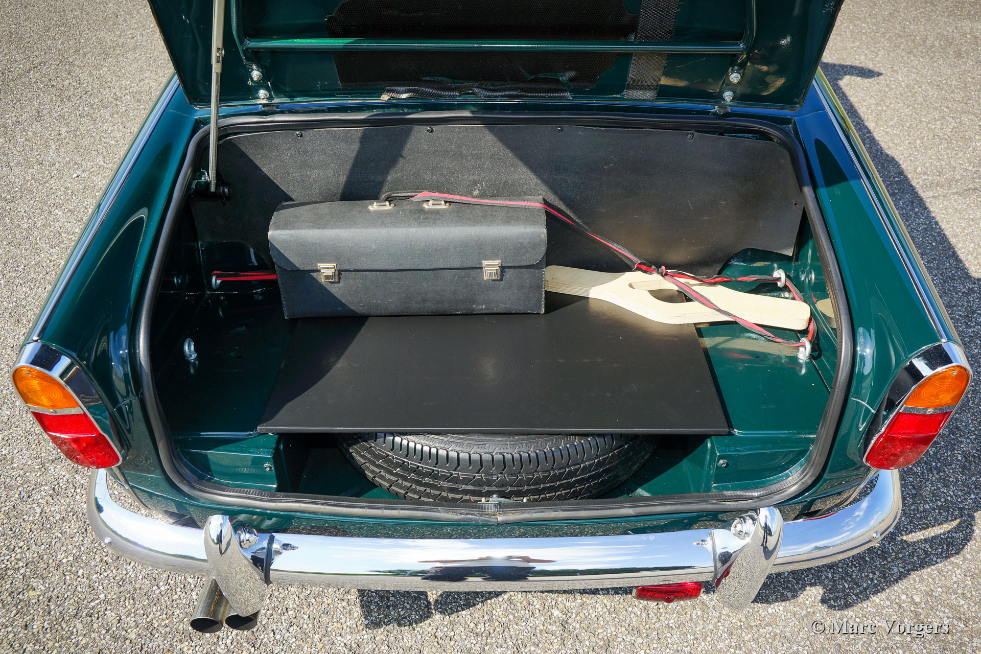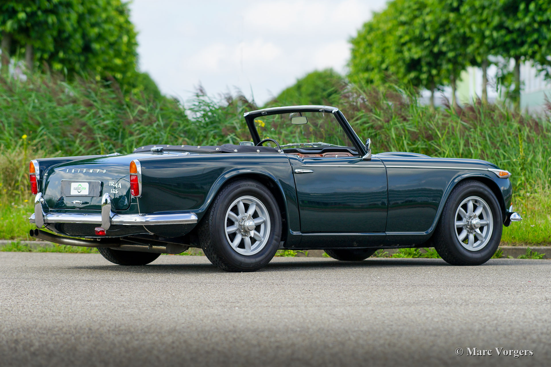 Triumph TR 4A IRS, année 1966. Couleur British Racing Green combinée à un intérieur noir garni de passepoil blanc et de moquette noire. Cette magnifique et assez rare Triumph TR4 A IRS a été largement restaurée dans le passé, la voiture est en excellent état. L'intérieur présente un magnifique tableau de bord en noyer rempli de cadrans chromés et d'un magnifique volant d'origine. Sous le long capot a installé un moteur quatre cylindres en fonte de 2,2 litres de 125 ch, équipé de deux carburateurs Weber à double starter et un arbre a cames ‘fast road’. La puissance est transmise aux roues arrière via une boîte de vitesses manuelle à quatre vitesses et un overdrive qui fonctionne sur les 2e, 3e et 4e rapports. Une caractéristique spéciale du TR 4A IRS est la construction de la suspension arrière indépendante « Independent Rear Suspension » qui donne aux roues arrière de l'IRS plus d'adhérence et une conduite plus confortable que l'essieu moteur des anciennes voitures de sport Triumph TR. De plus, cette Triumph TR est équipée d'un échappement en acier inoxydable, d'un ventilateur de refroidissement électrique et de roues de style Minilite avec des écrous de roue chromés. C'est un roadster Triumph hautement désirable !