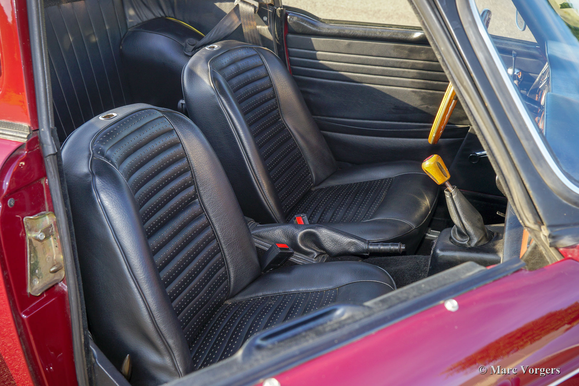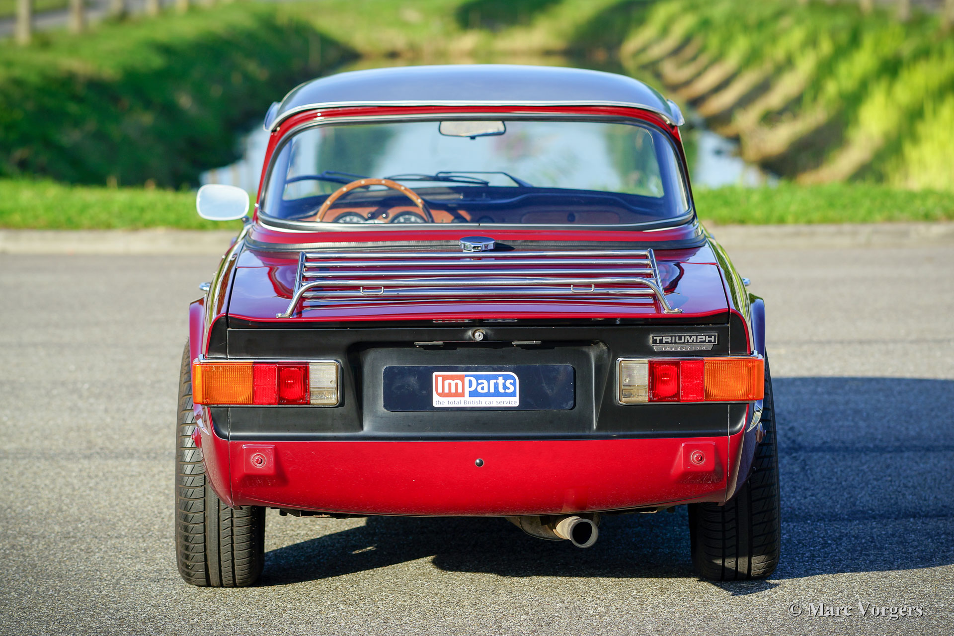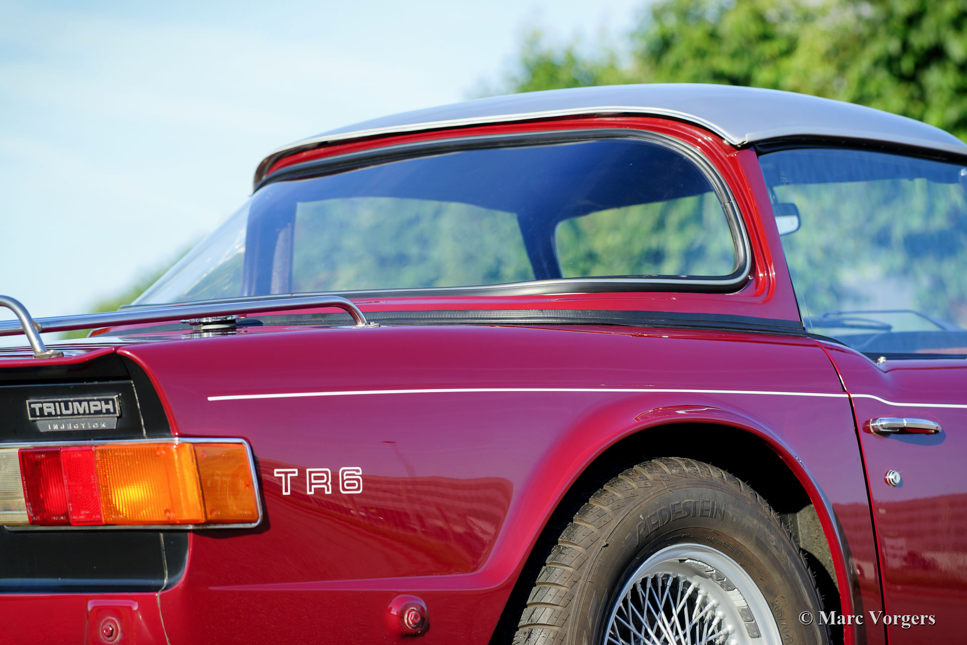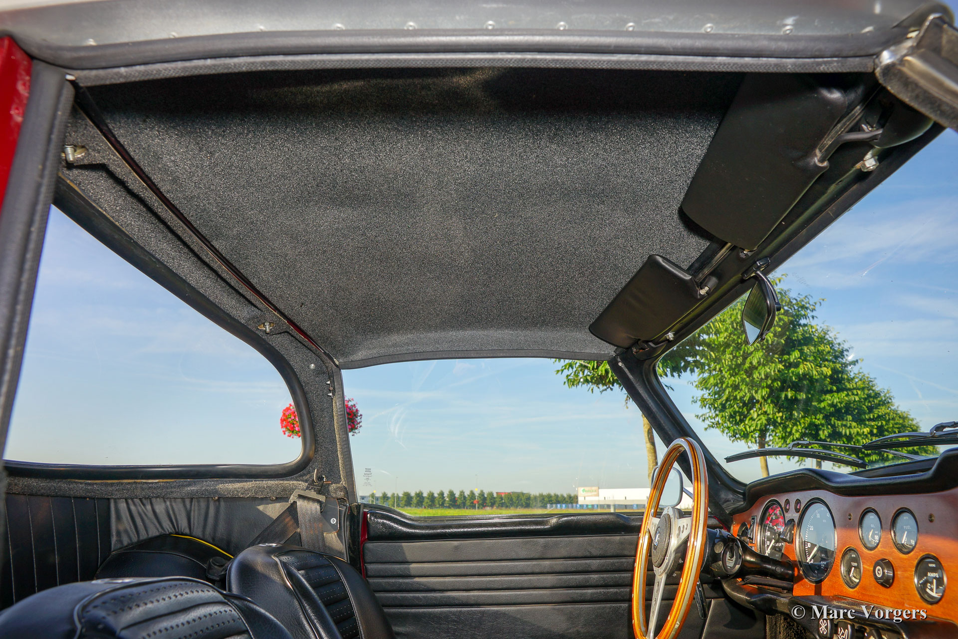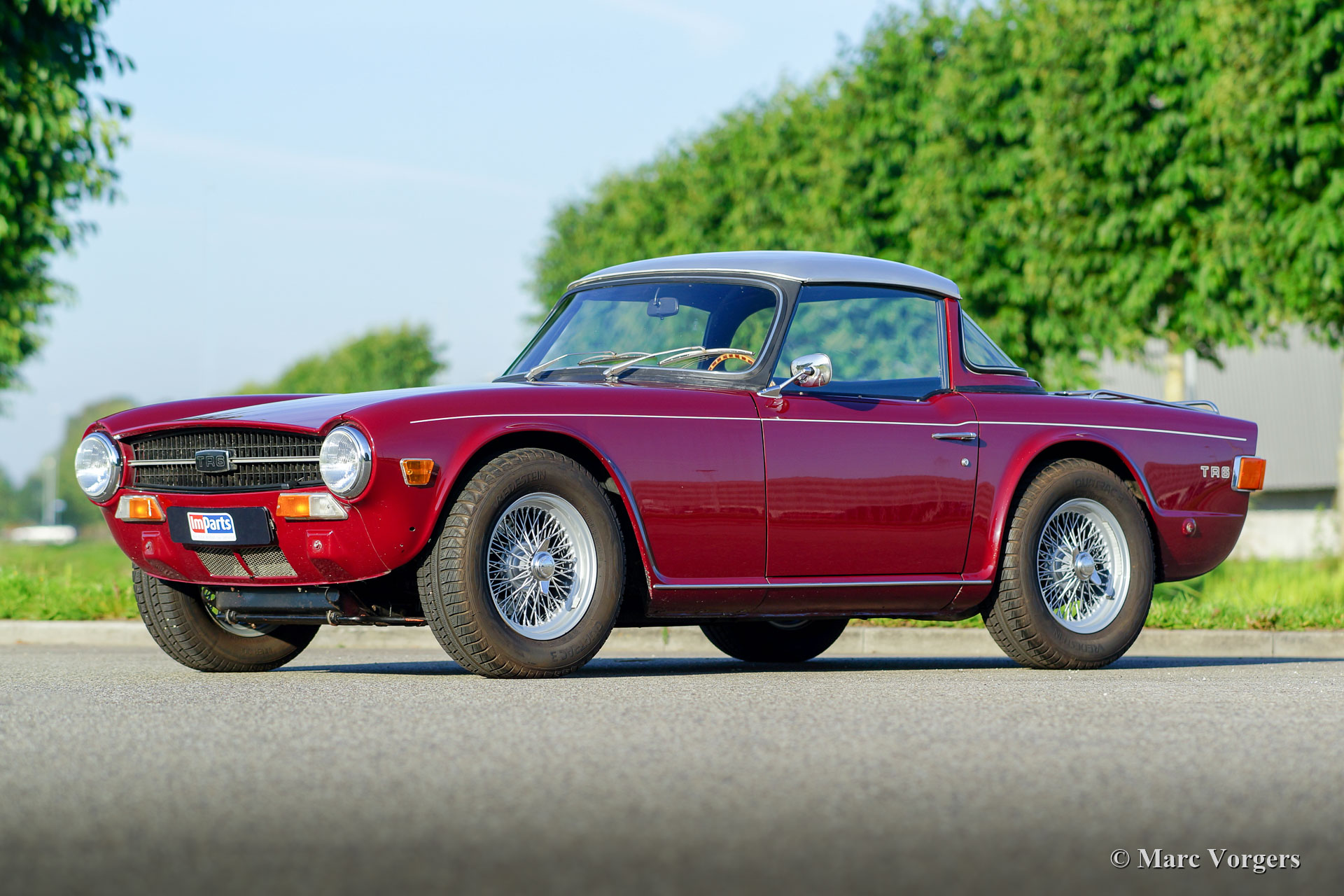 Triumph TR 6 PI, année 1971. Couleur marron / rouge (Carmine Red) combinée à un intérieur en similicuir noir et moquette noire. La voiture est dotée un Surrey Top très recherché ! La partie arrière (avec fenêtre) est peinte en couleur de la carrosserie, le panneau métal de toit amovible est peint en argent. (Bon à savoir : le Top Triumph Surrey a inspiré Porsche à présenter son modèle Targa avec un toit similaire). Cette Triumph TR 6 est un modèle recherché de PI « Petrol Injection » équipé d’un puissant moteur de 150 ch! La TR 6 a été rendue encore plus racée en supprimant les pare-chocs avant et arrière. Ce TR 6 PI est en très bon état avec quelques traces d’utilisation normale. Les caractéristiques de l’automobile sont les suivantes : larges roues à fil peintes en argent, freins à disque ventilés à l’avant, étriers de frein plus gros, servofrein plus puissant, réservoir d’essence en aluminium plus grand, pompe à essence Bosch et porte-bagages chromé sur le couvercle du coffre. C’est une vraie voiture de conducteur avec une note de moteur six cylindres exaltante… Ce qui apporte un sourire durable au visage du conducteur et son compagnon…
