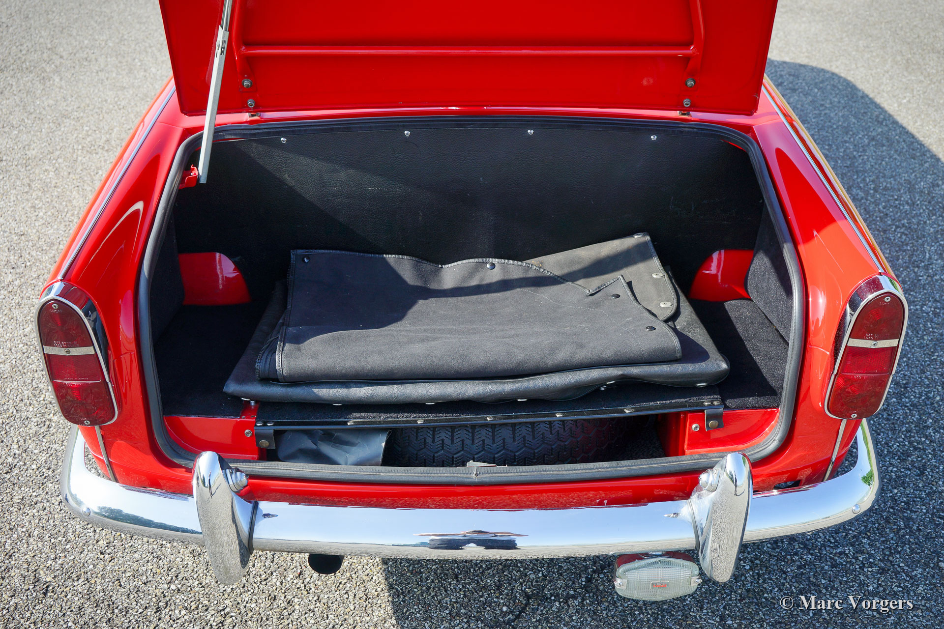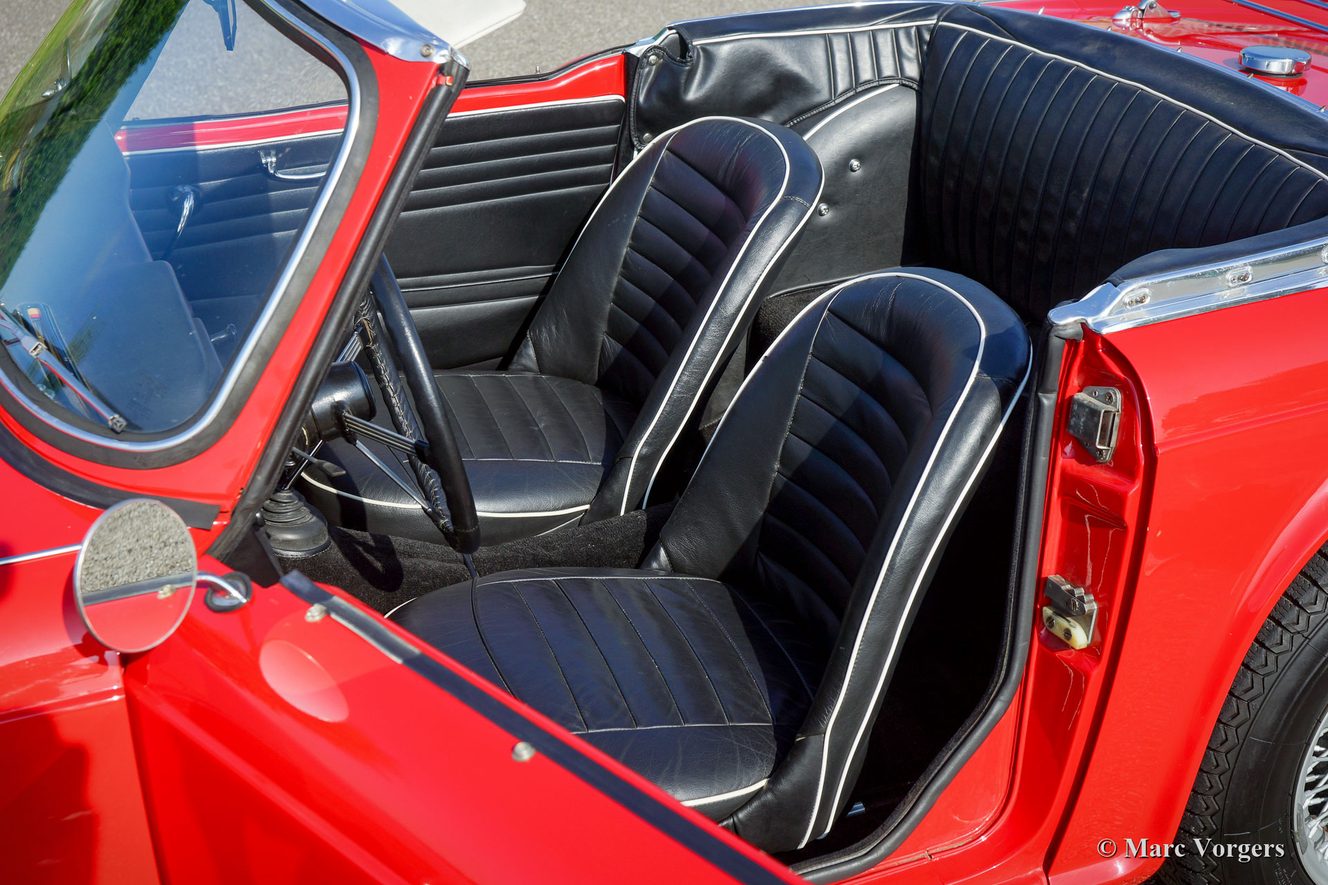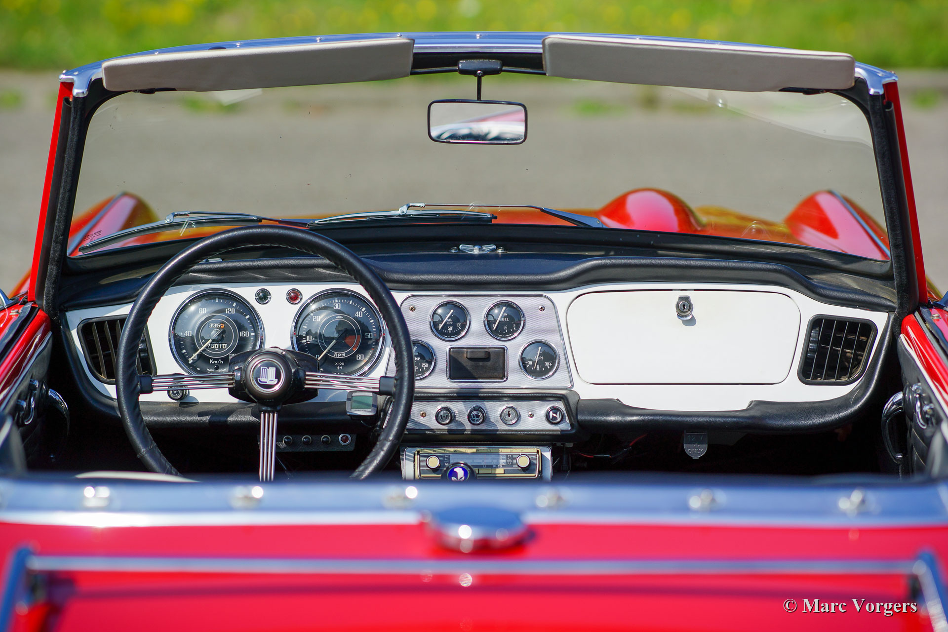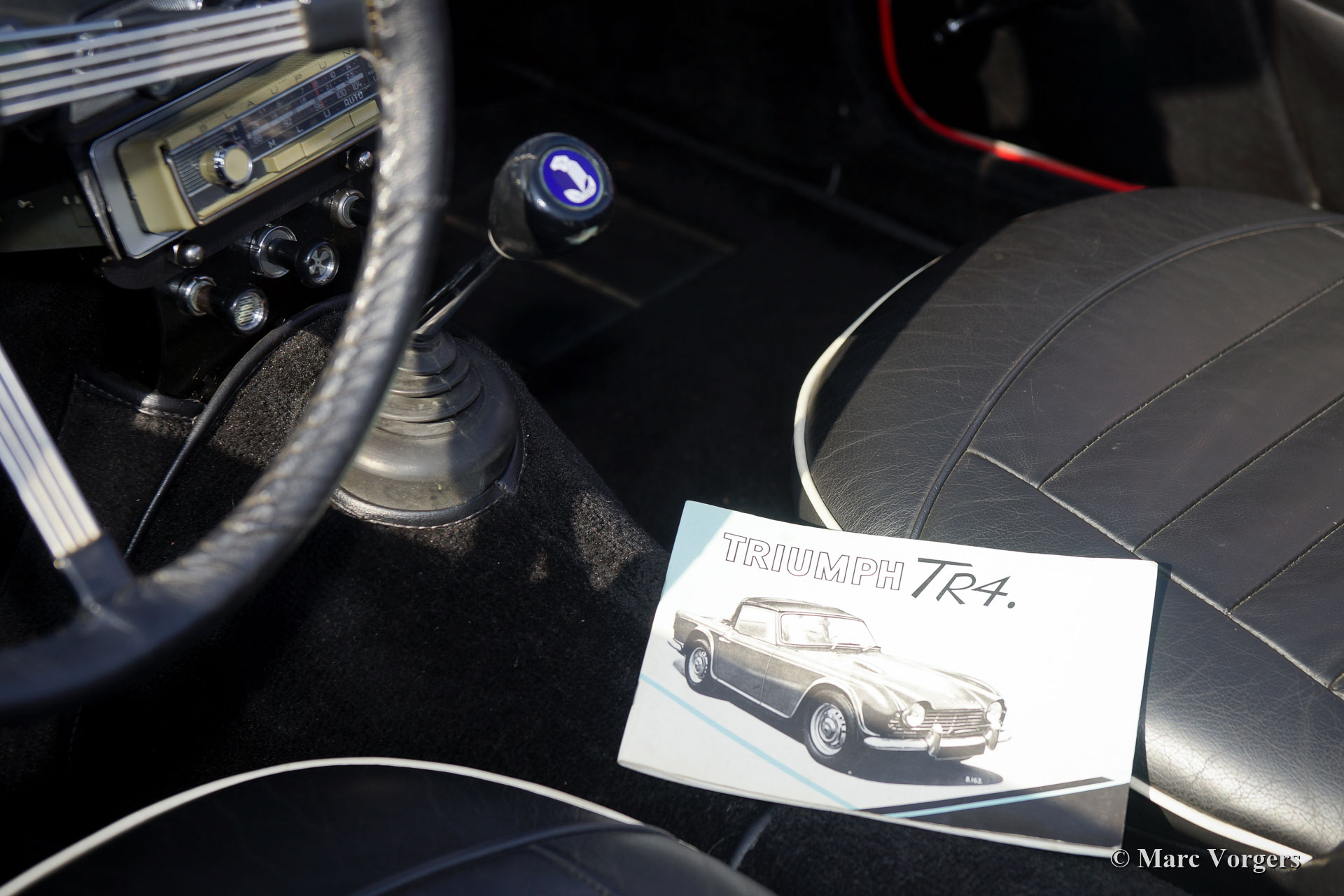 Triumph TR 4, année 1962. Couleur rouge combinée à un intérieur en cuir noir bordé de passepoil blanc. Soft-top et couvercle de tonneau noir. Cette « matching numbers » Triumph TR4 fut restaurée detaillée dans les années 2000 - 2002. En regardant la voiture, vous avez l’impression que celle-ci a été restaurée il ya environ un an. Cette rare TR4 précoce est en superbe état et la voiture roule et pilote parfaitement ! Les premiers TR4 sont immédiatement reconnaissables au magnifique tableau de bord en métal peint en blanc dans cette voiture (comme original). Le capot a toujours la "goutte larmée" qui laisse de la place aux carburateurs. La radio Blaupunkt Mainz ATR de 1964 est tout à fait particulière. Elle est dotée de la bande de fréquence FM souhaitable. Cette radio est une radio à transistors portable qui peut être utilisée en dehors de la voiture ! Dans la voiture, la radio doit être insérée dans un traîneau spécial dans lequel le 12 volts, l'antenne et le haut-parleur externe sont connectés. Un appareil d'époque très rare et beau ! De plus, cette Triumph TR4 est équipée de projecteurs Lucas FT & LR 11 antibrouillard et longue portée à l’avant, de roues à rayons de fil peinte argent, du volant d’origine et d’un porte-bagages chromé. La voiture fut améliorée / modifiée à certains endroits : bagues en polyuréthane dans la suspension, interrupteur principal 12 V, alternateur (dynamo en courant continu est toujours présent), ventilateur de refroidissement électrique supplémentaire, modification du filtre à huile (l'ancien filtre est toujours présent) et carter d'huile en aluminium. Un spécimen de première classe !