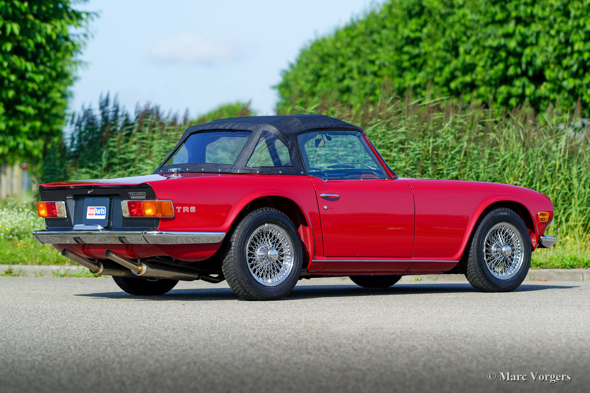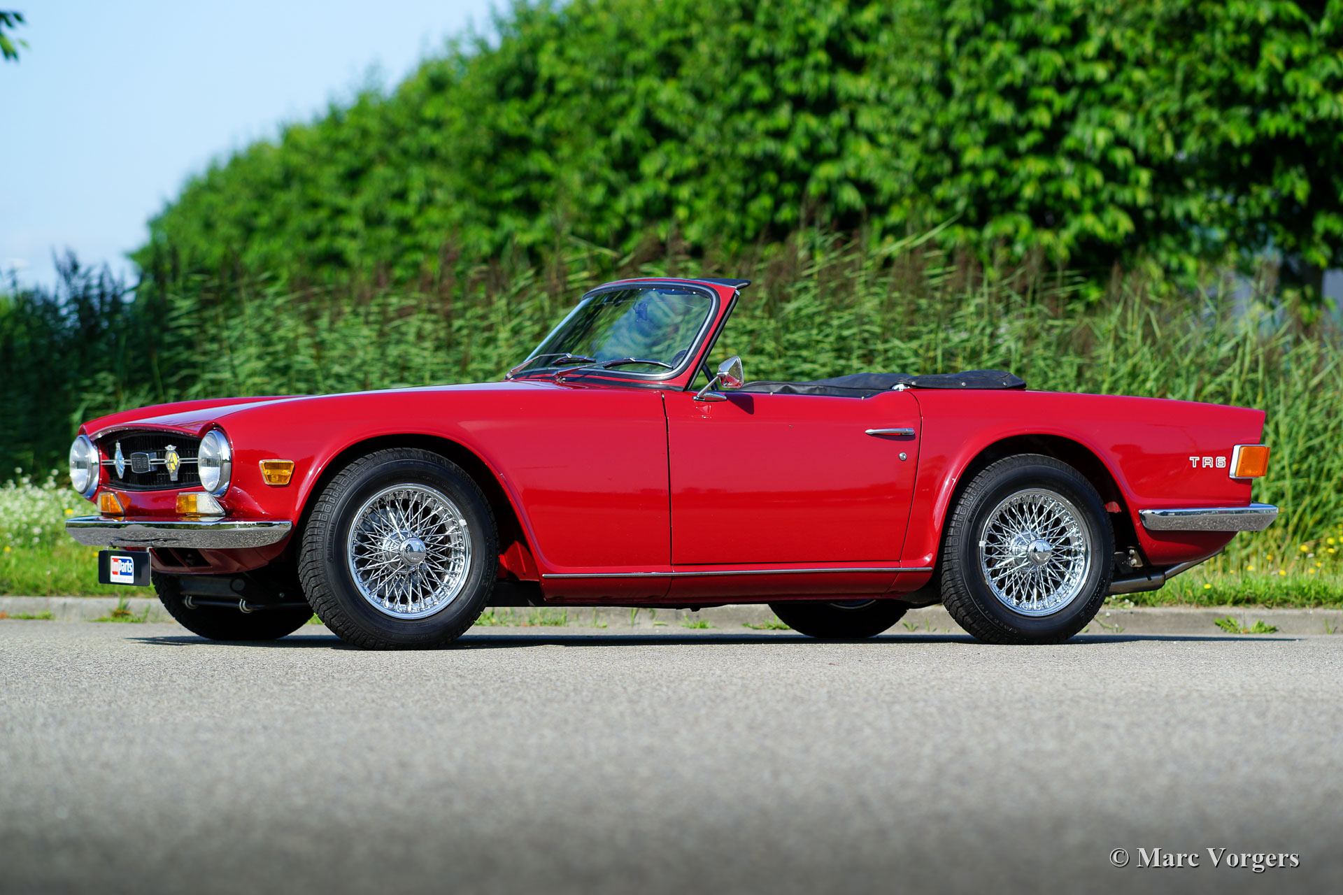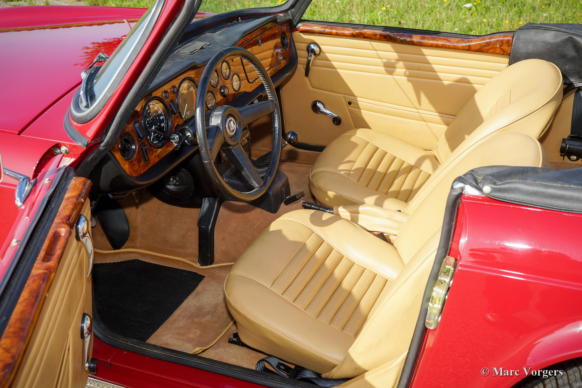 Triumph TR6 PI, année 1969. De couleur rouge foncé avec un intérieur beige et un tapis beige. Capote et capuchon noirs. Ce superbe Triumph TR6 PI est un modèle CP précoce doté d’un moteur six cylindres en ligne de 150 SAE équipé de l’injection mécanique d’essence Lucas ! C'est un modèle européen qui fut assemblé en Belgique et vendu neuf en Allemagne. Cette belle voiture est en superbe état et la voiture conduite et pilote magnifique ! Le moteur est très puissant et sonne fantastique ! Il y a quelques années, cette TR6 PI fut intégralement restaurée et révisée. La voiture est équipée de roues à rayons de fil chromées, d’une « overdrive », d’un échappement en acier inoxydable, d’un allumage électronique, d’un commutateur principal 12 V et de ceintures de sécurité à enroulement en 3 points. C'est une voiture de sport britannique très recherchée, sportive, confortable et pratique. Un spécimen de haut niveau et une voiture de pilote fantastique !