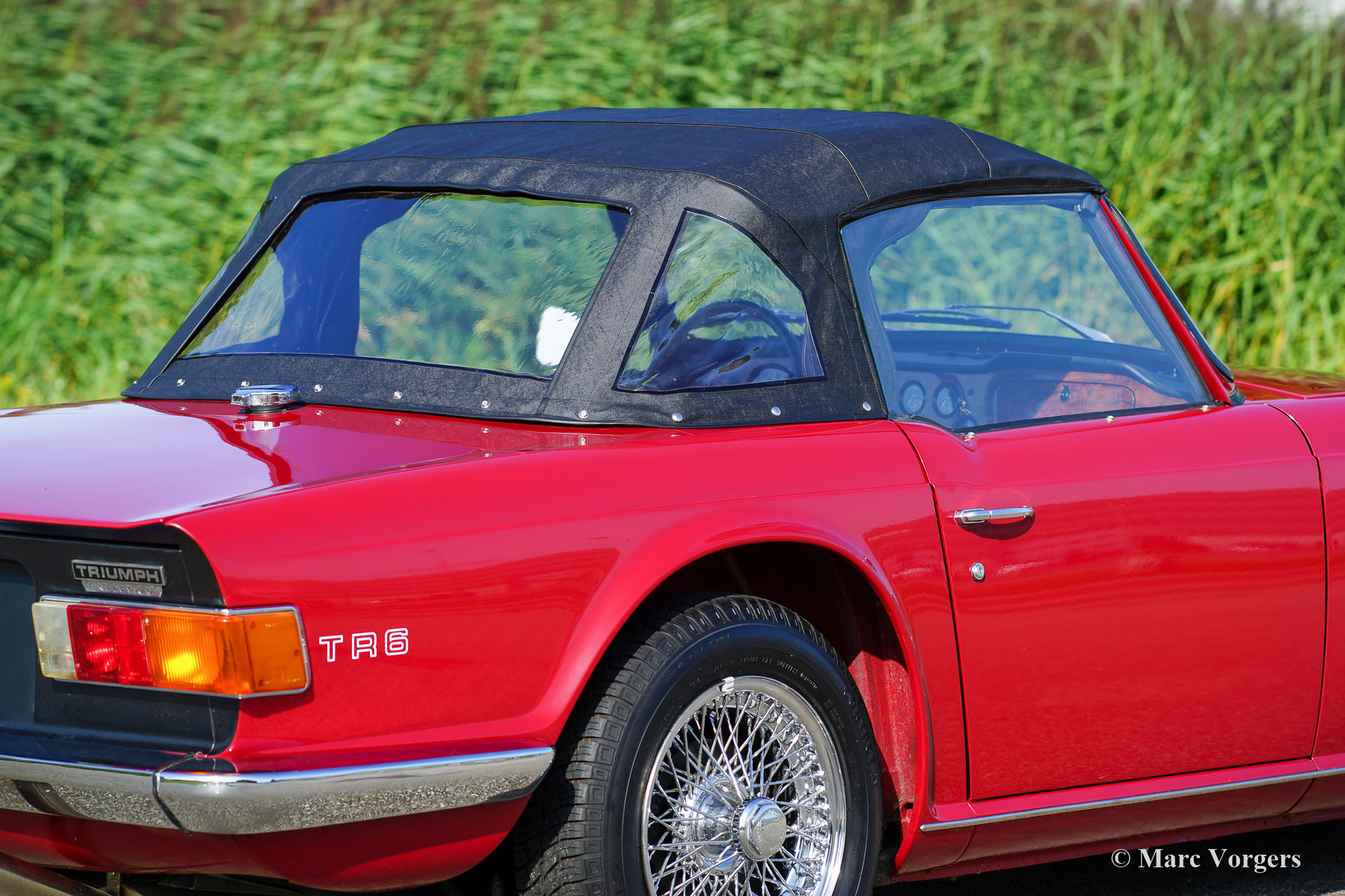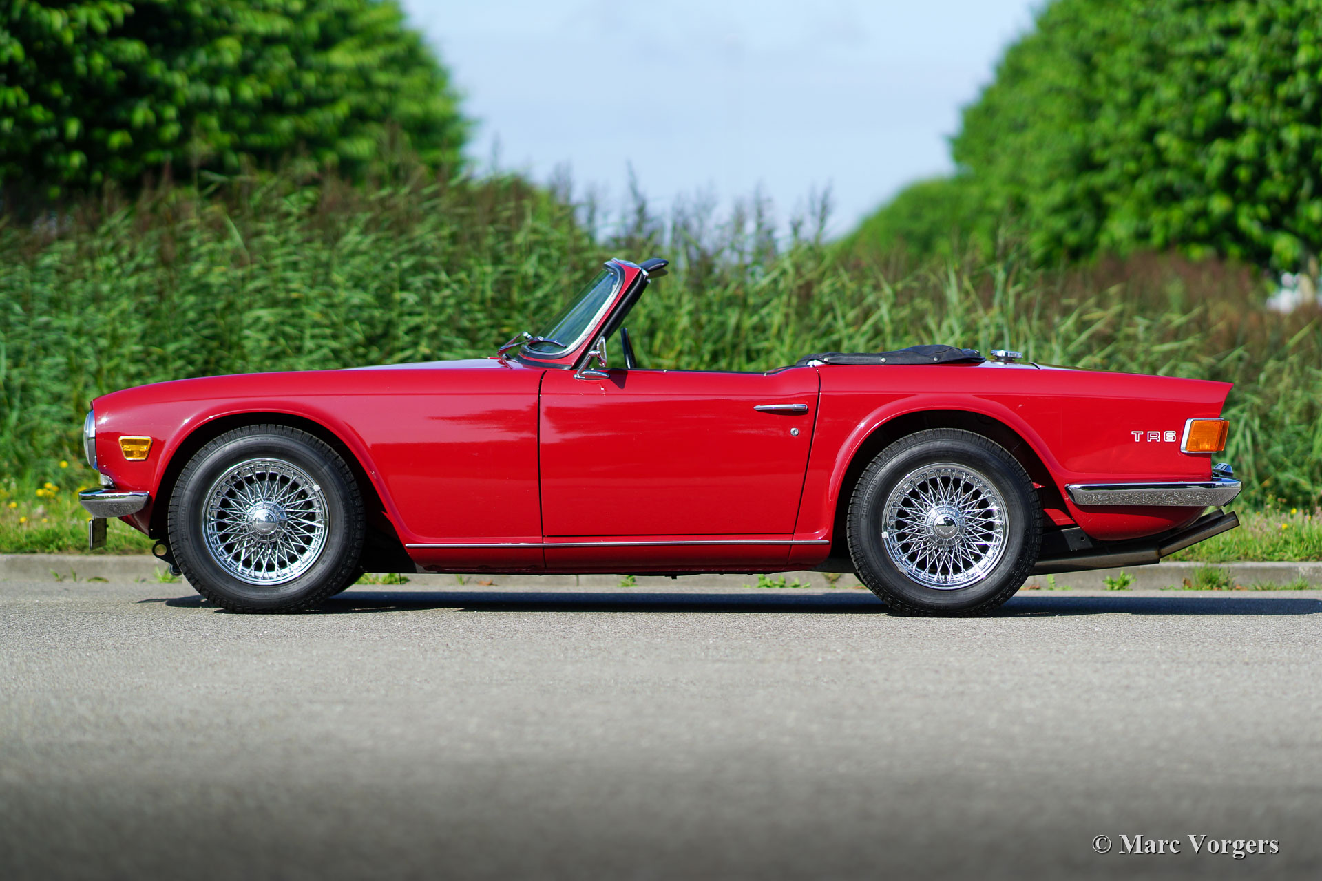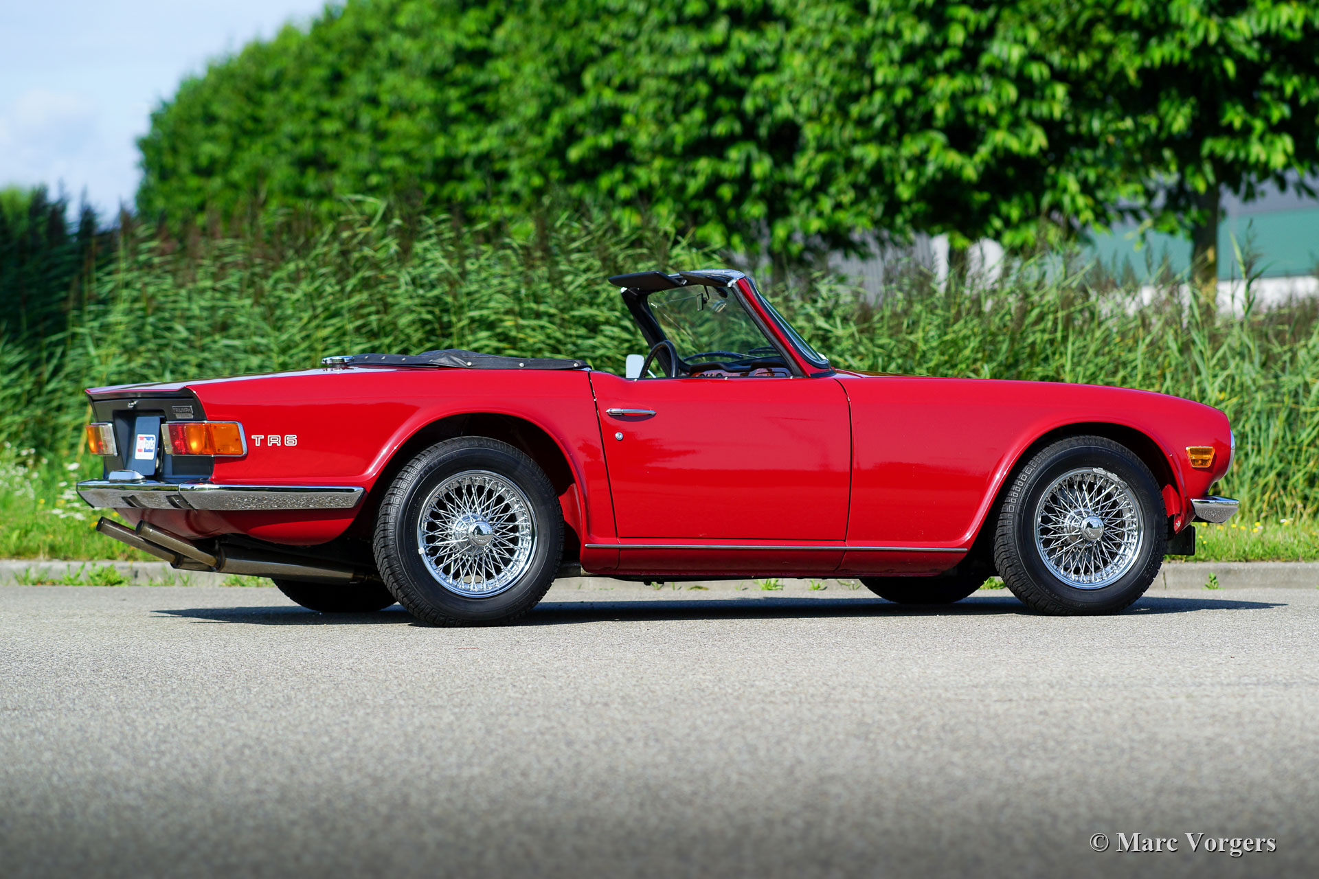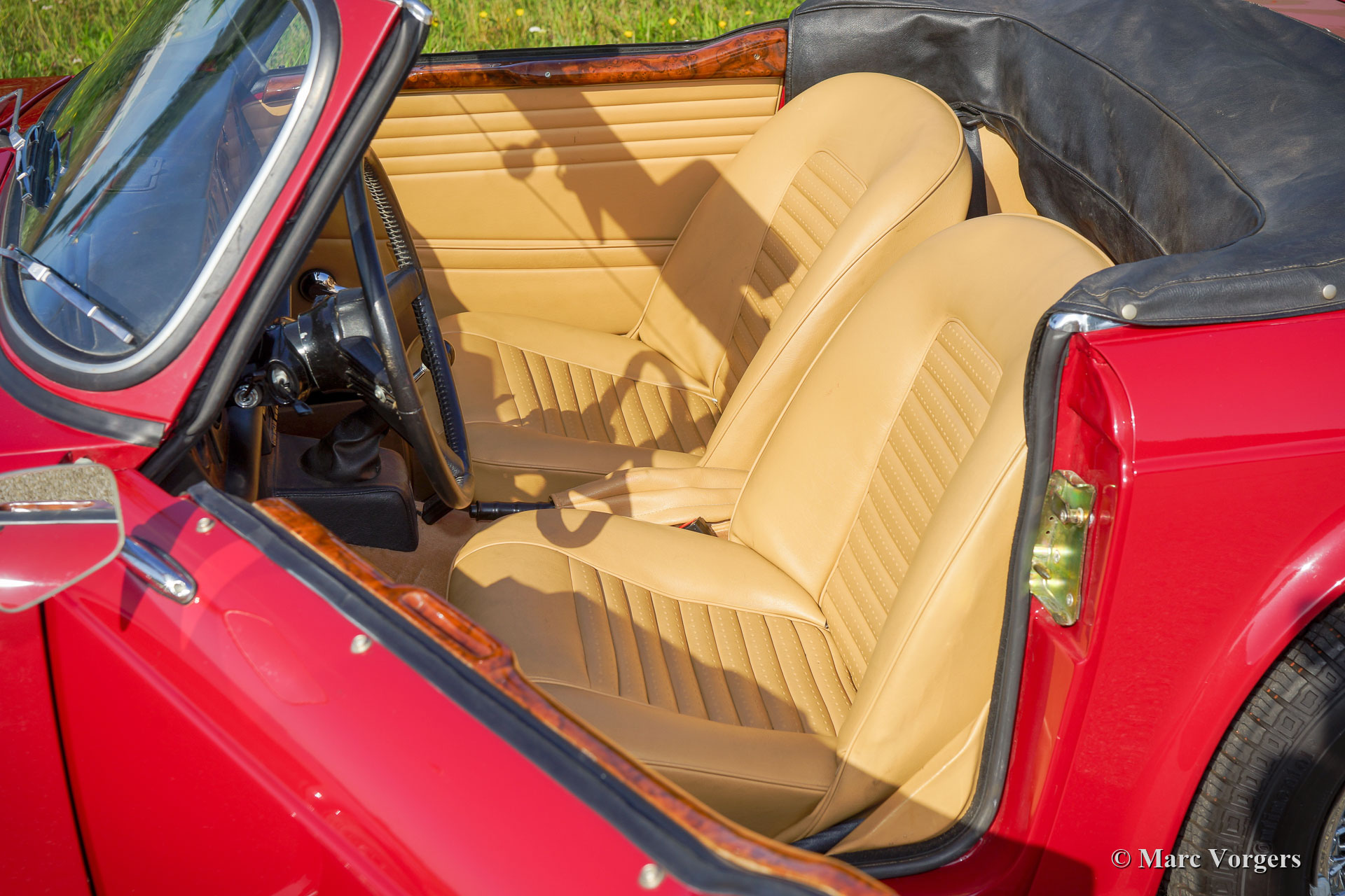 Triumph TR6 PI, année 1969. De couleur rouge foncé avec un intérieur beige et un tapis beige. Capote et capuchon noirs. Ce superbe Triumph TR6 PI est un modèle CP précoce doté d’un moteur six cylindres en ligne de 150 SAE équipé de l’injection mécanique d’essence Lucas ! C'est un modèle européen qui fut assemblé en Belgique et vendu neuf en Allemagne. Cette belle voiture est en superbe état et la voiture conduite et pilote magnifique ! Le moteur est très puissant et sonne fantastique ! Il y a quelques années, cette TR6 PI fut intégralement restaurée et révisée. La voiture est équipée de roues à rayons de fil chromées, d’une « overdrive », d’un échappement en acier inoxydable, d’un allumage électronique, d’un commutateur principal 12 V et de ceintures de sécurité à enroulement en 3 points. C'est une voiture de sport britannique très recherchée, sportive, confortable et pratique. Un spécimen de haut niveau et une voiture de pilote fantastique !