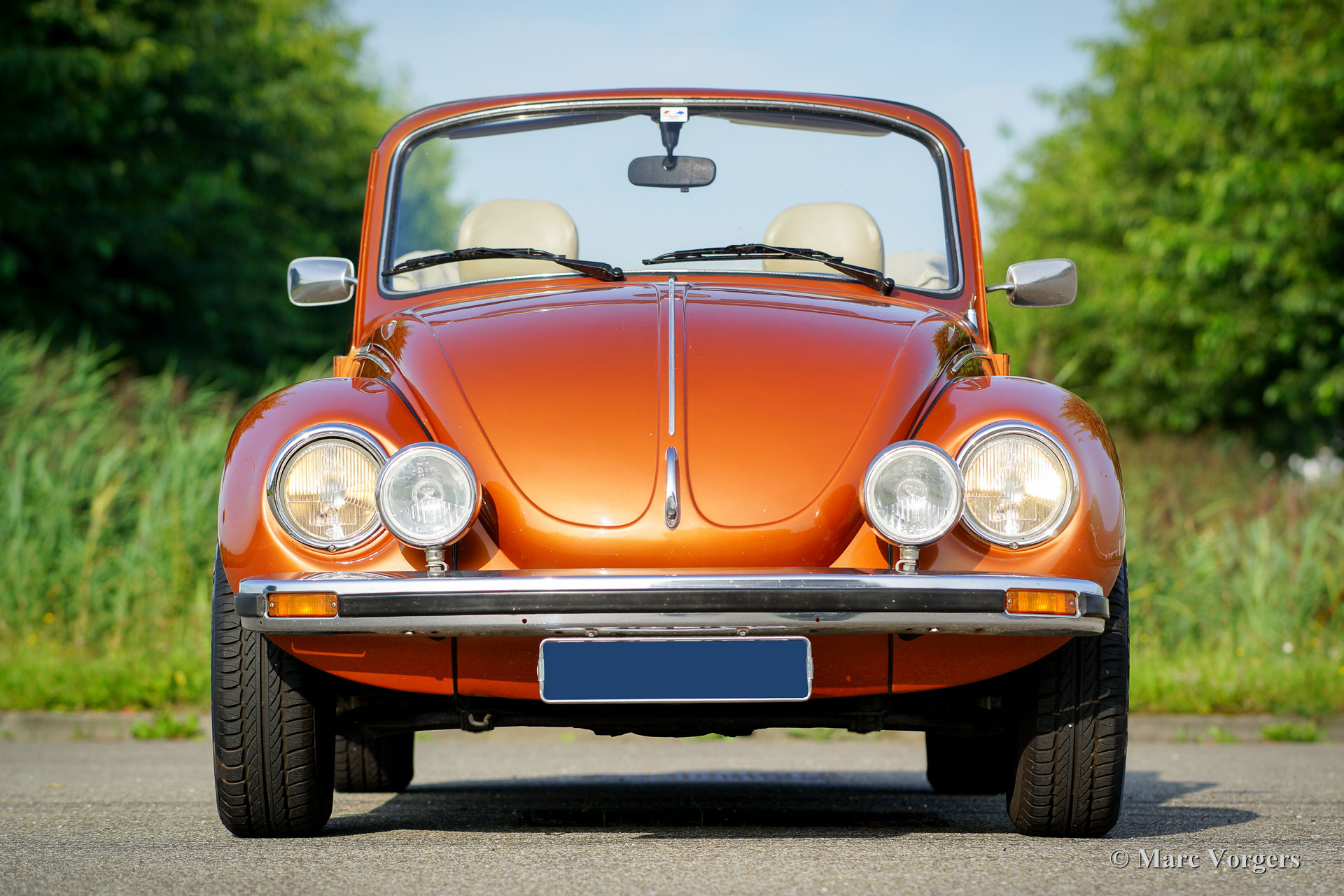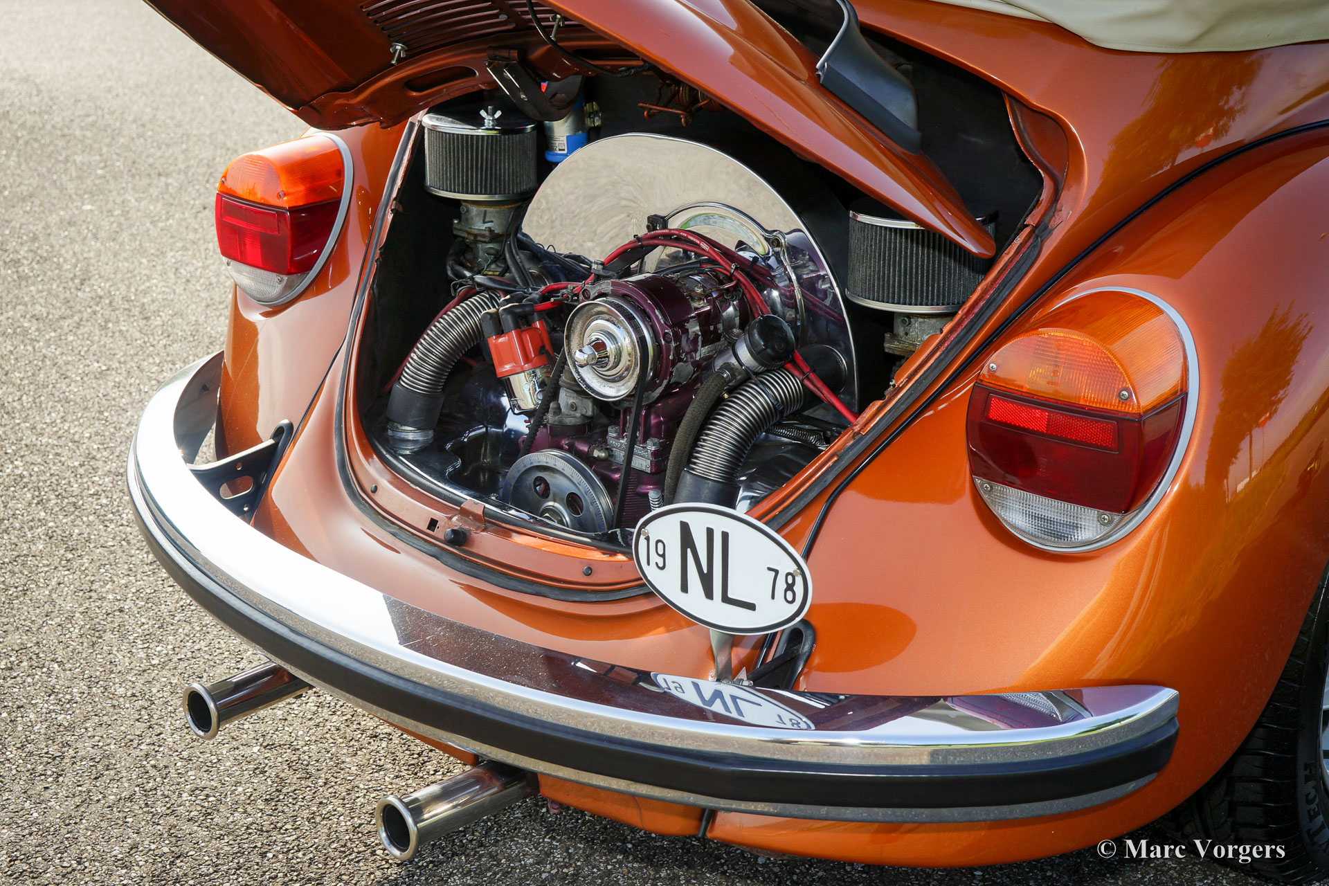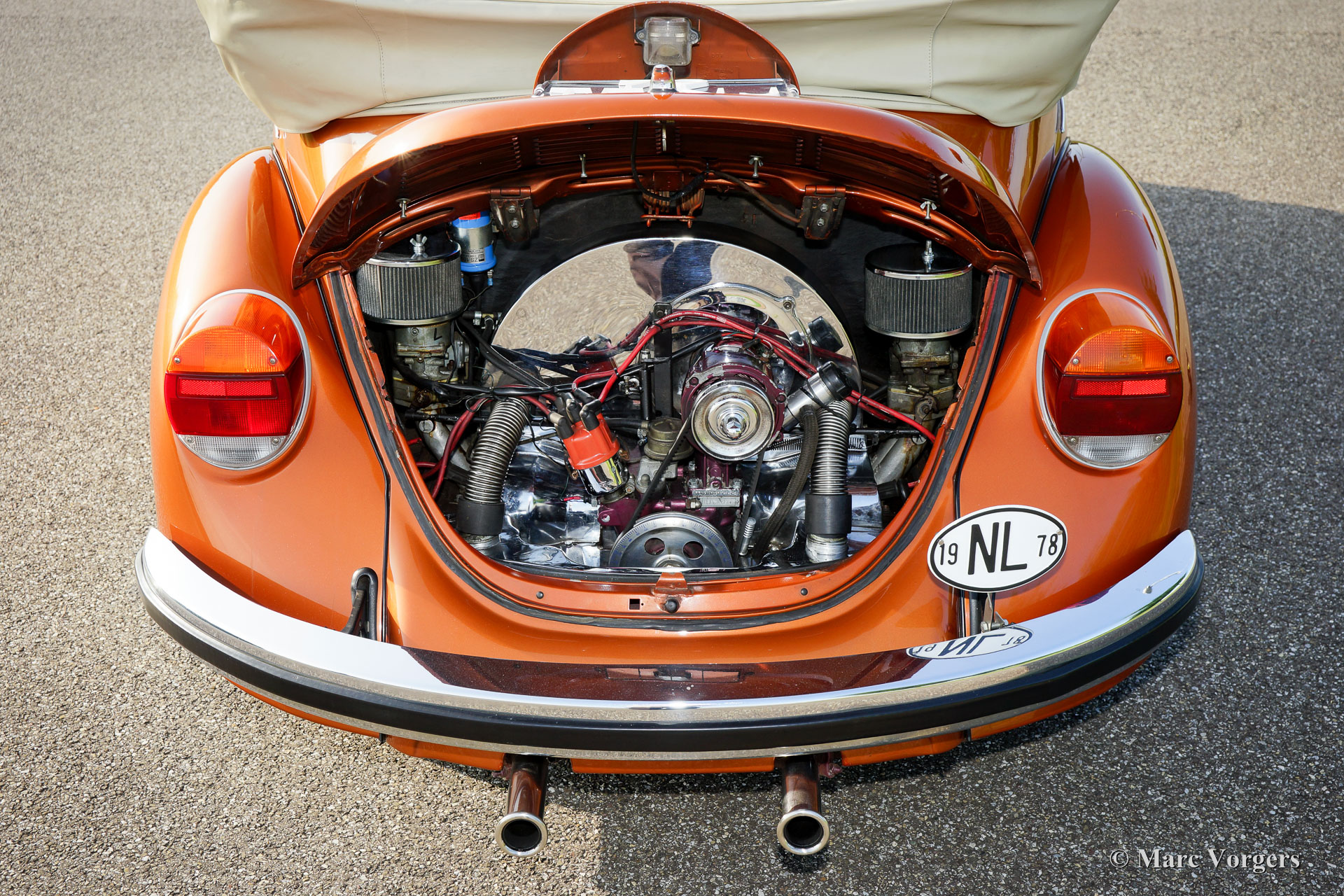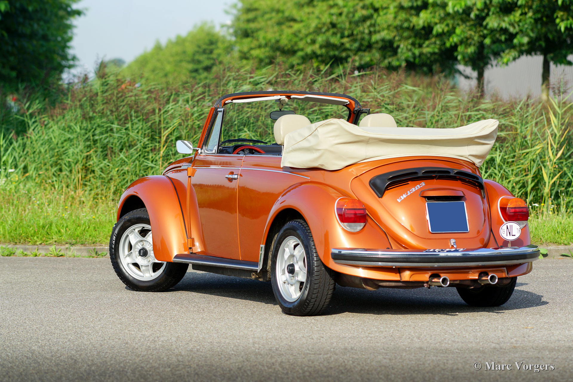 Volkswagen ‘Coccinelle’ Cabriolet, année 1978. Couleur Marron Brasil métallisé avec un intérieur beige a cuir artificiel et tapis noir. Capot beige et couvercle de la hotte beige. Cette très belle VW ‘Coccinelle’ Cabriolet classique fut chère par son premier propriétaire (allemand) depuis 25 ans. Dans les années 1989 à 1992, il a restauré la voiture. L'histoire est magnifiquement documentée. En 2007, ce VW fut importé aux Pays-Bas. En 2010, la voiture a reçu un moteur plus puissant de 1835 cc qui a parcouru 40 000 kilomètres maintenant. Le moteur est équipé de deux carburateurs Weber et d'un système d'échappement spécial. Ces mises à niveau ajoutent du poivre à ce cabriolet confortable et sportif à quatre places ! Récemment, la voiture a reçu quelques améliorations : les freins furent révisés et renouvelés étaient le réservoir d'essence, les amortisseurs et le démarreur électrique. Ce VW ‘Coccinelle’ cabriolet est en très bon état et la voiture fonctionne parfaitement. La peinture montre des imperfections minimales. La voiture est équipée d'une très belle ‘épreuve du vent’, d'un système de son radio / CD Kenwood, d'un volant sportif avec bordure en bois et d'un bouton de changement de bois. Un décapotable très populaire dans une combinaison de couleurs brillantes !