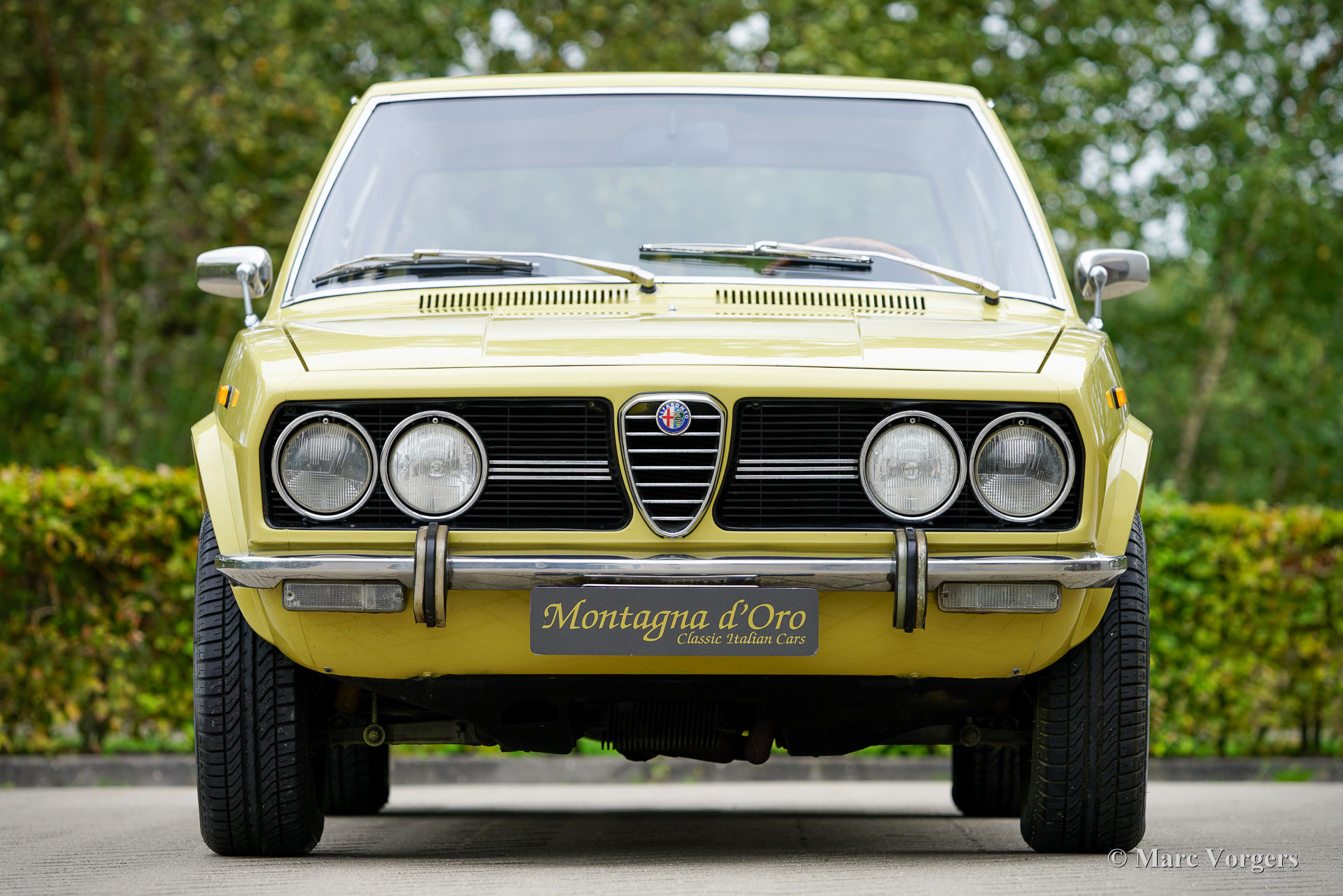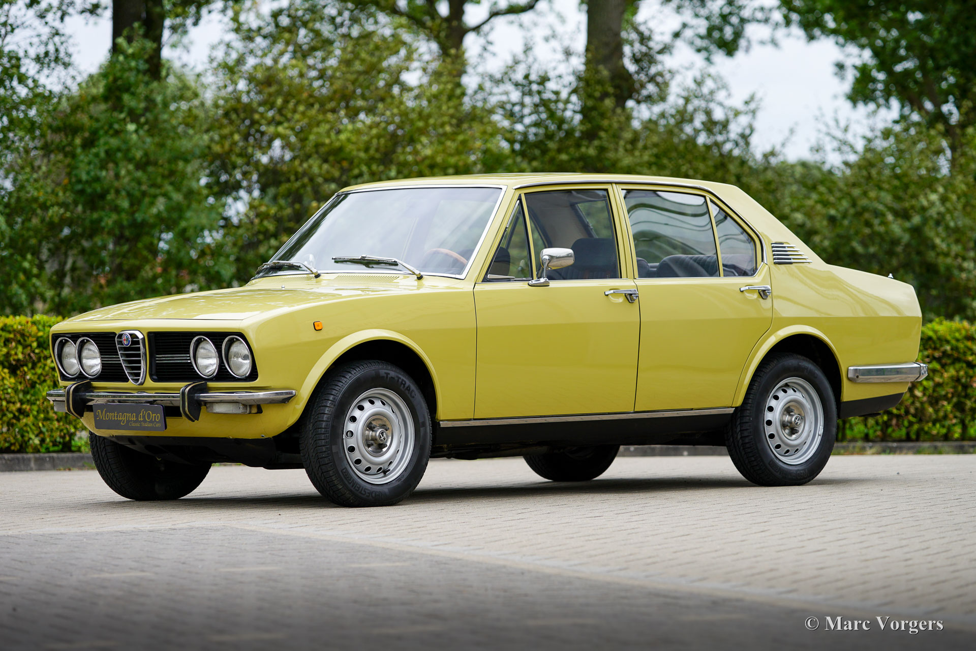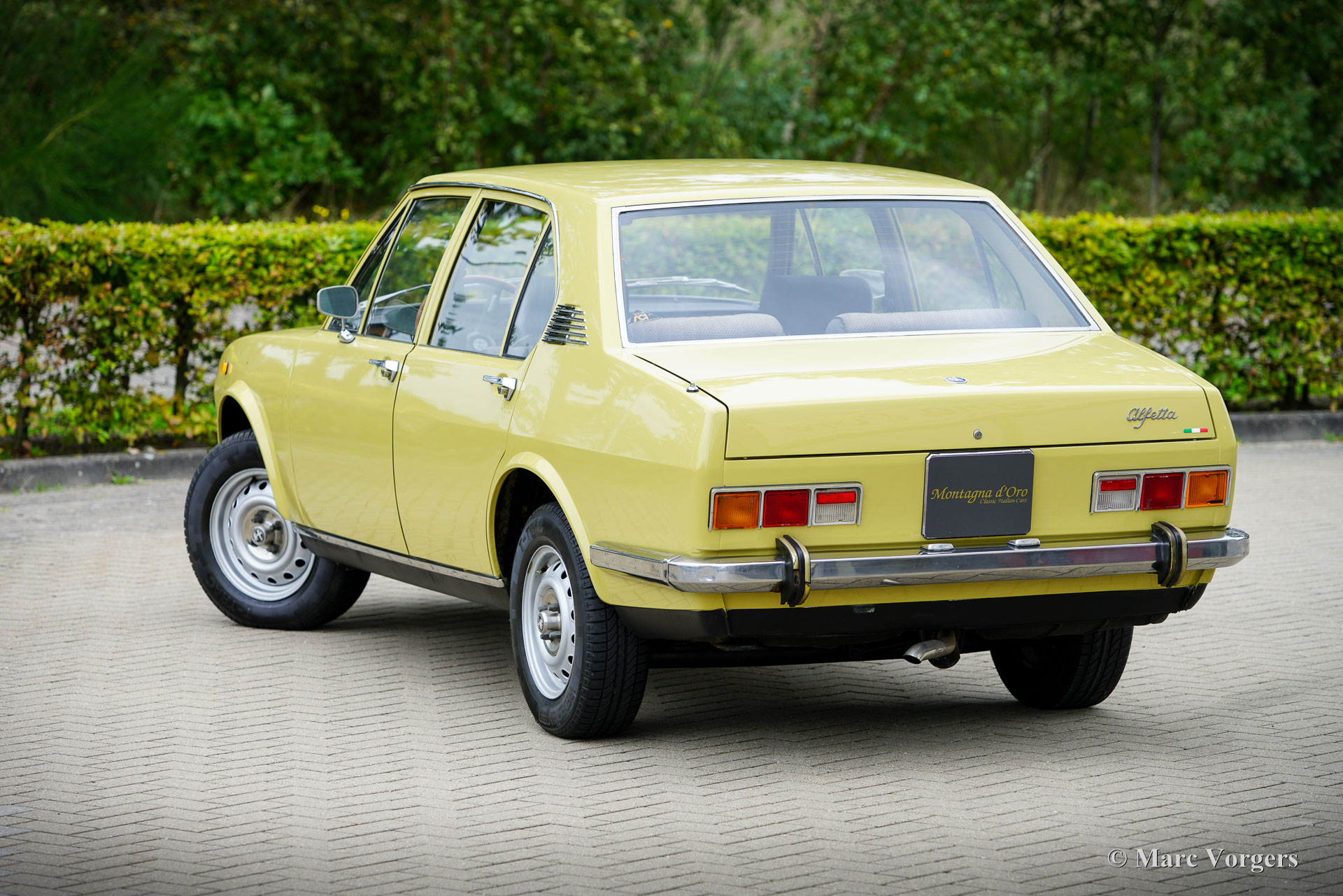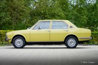 Alfa Romeo Alfetta 1800, année 1972. Couleur jaune pâle (Giallo Piper, code couleur AR AR116) associée à un intérieur en tissu bleu. Cette magnifique Alfetta 1800 fut vendue neuve en Italie, l'automobile fut importée aux Pays-Bas en décembre 2001. Le compteur indique actuellement 65,679 kilomètres. Les Alfetta du début des années 1970 sont un spectacle rare à notre époque. Ce bel exemplaire est dans un très bon état. La carrosserie saine a reçu par le passé une nouvelle peinture dans la couleur d'origine. La voiture fut bien entretenue au fil des années ; les factures d'entretien et de réparation sont présentes. L'Alfa Romeo Alfetta fut introduit en 1972. Il s'agissait de la première berline Alfa Romeo de taille moyenne en dix ans. Alfa Romeo a introduit la nouvelle boîte de vitesses/transmission finale « Transaxle » montée à l'arrière sur l'Alfetta, qui a permis une répartition du poids presque parfaite de 50/50. Ajouté à la suspension entièrement indépendante, au moteur sportif et puissant à double arbre à cames en aluminium, aux freins à disque sur les quatre roues et à la boîte de vitesses à cinq rapports, l'Alfetta était une véritable berline sport ! Ce bel exemplaire offre l'expérience de conduite telle que voulue par les designers, un merveilleux mélange de confort et de sportivité. Le bruit du moteur est une musique pour les oreilles des passionnés. La voiture est bien documentée et complète avec deux jeux de clés d'origine.