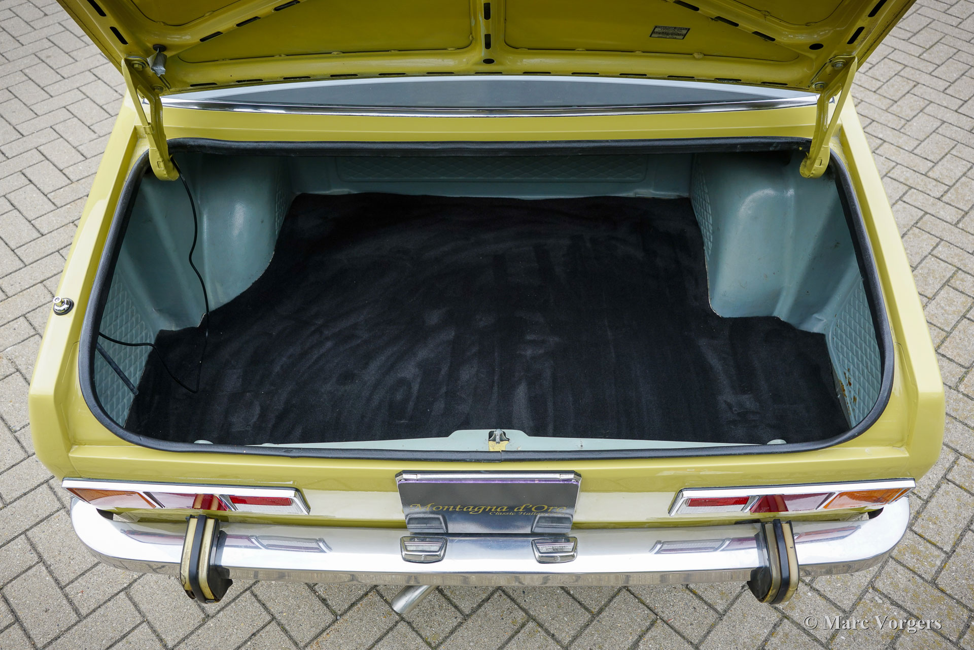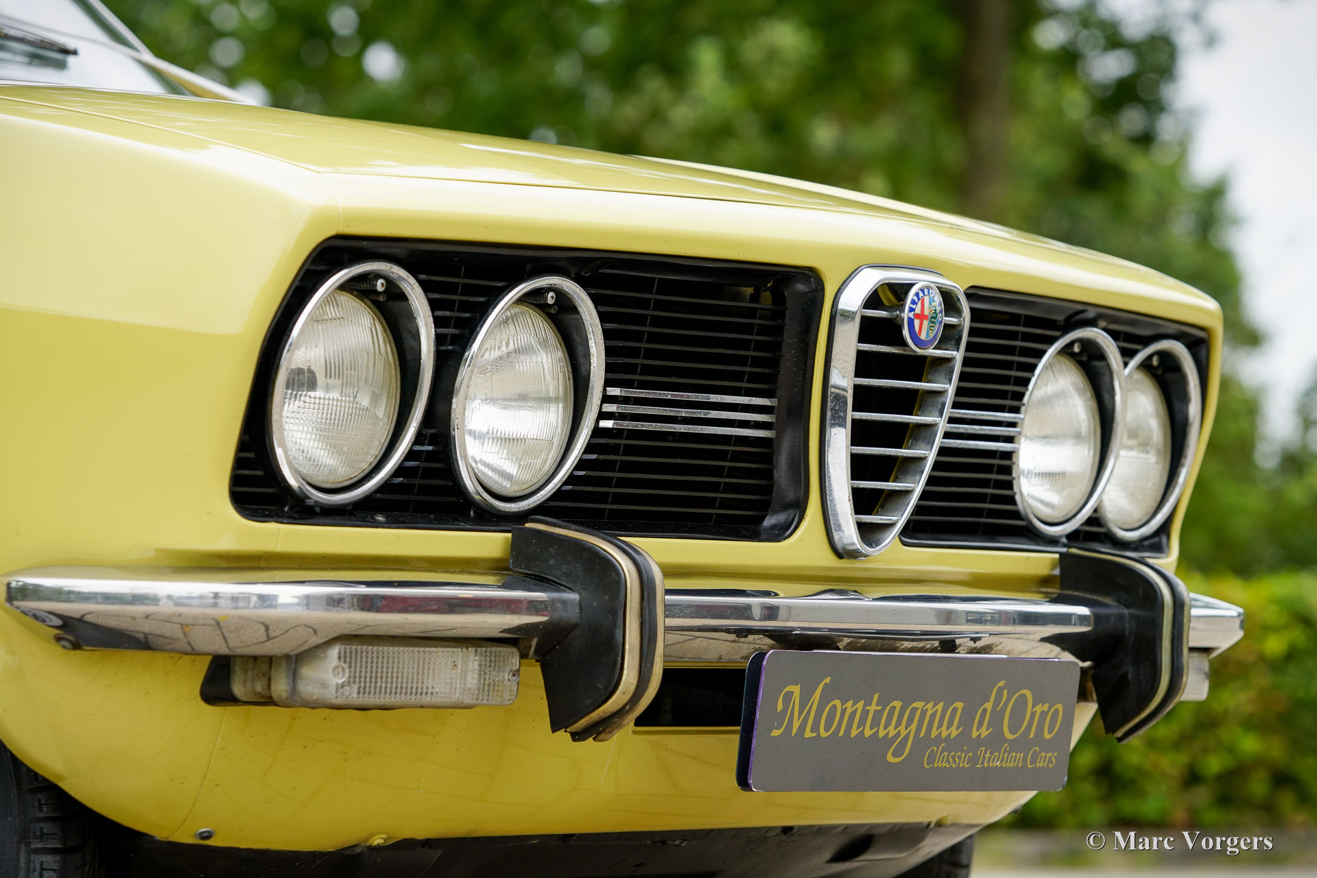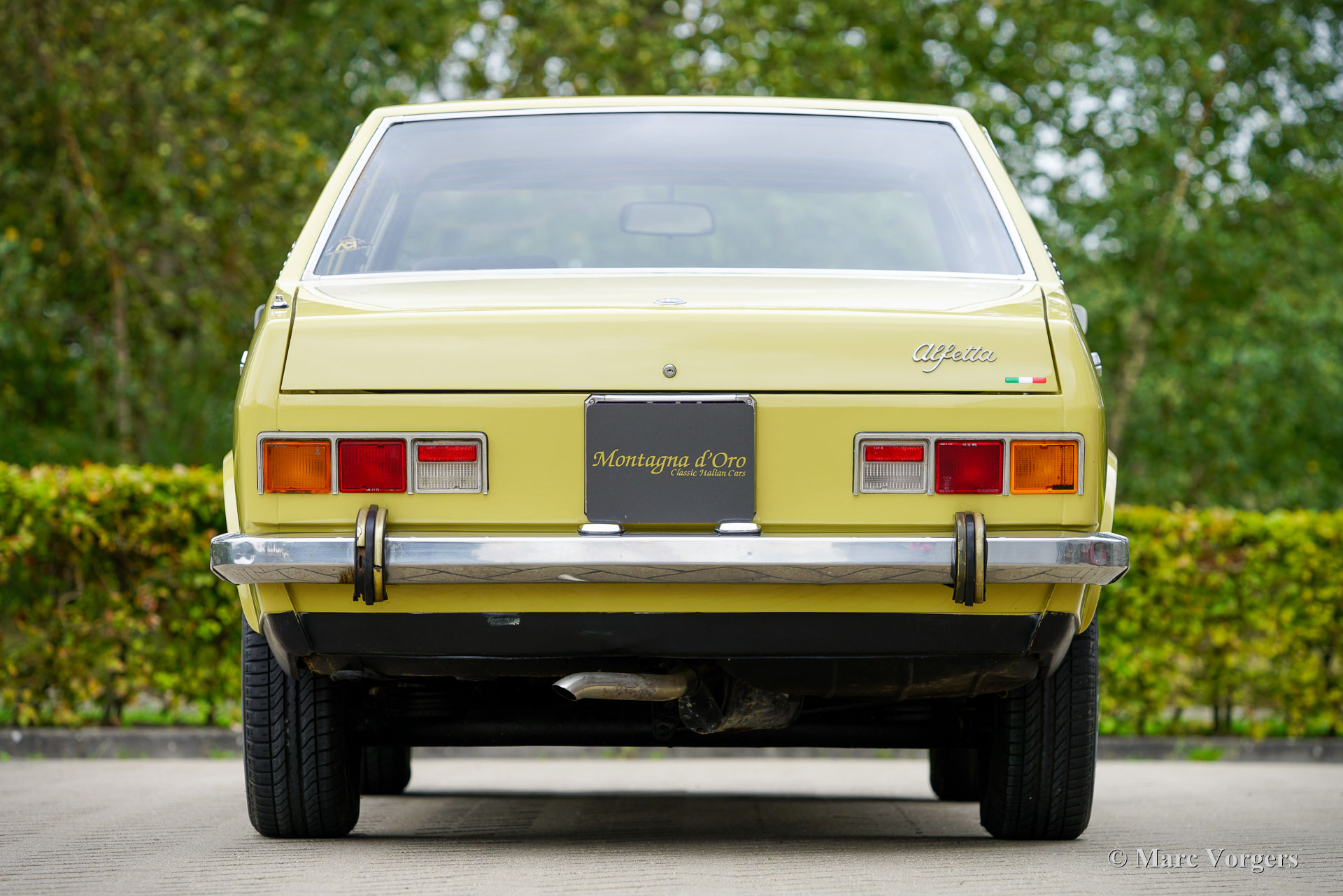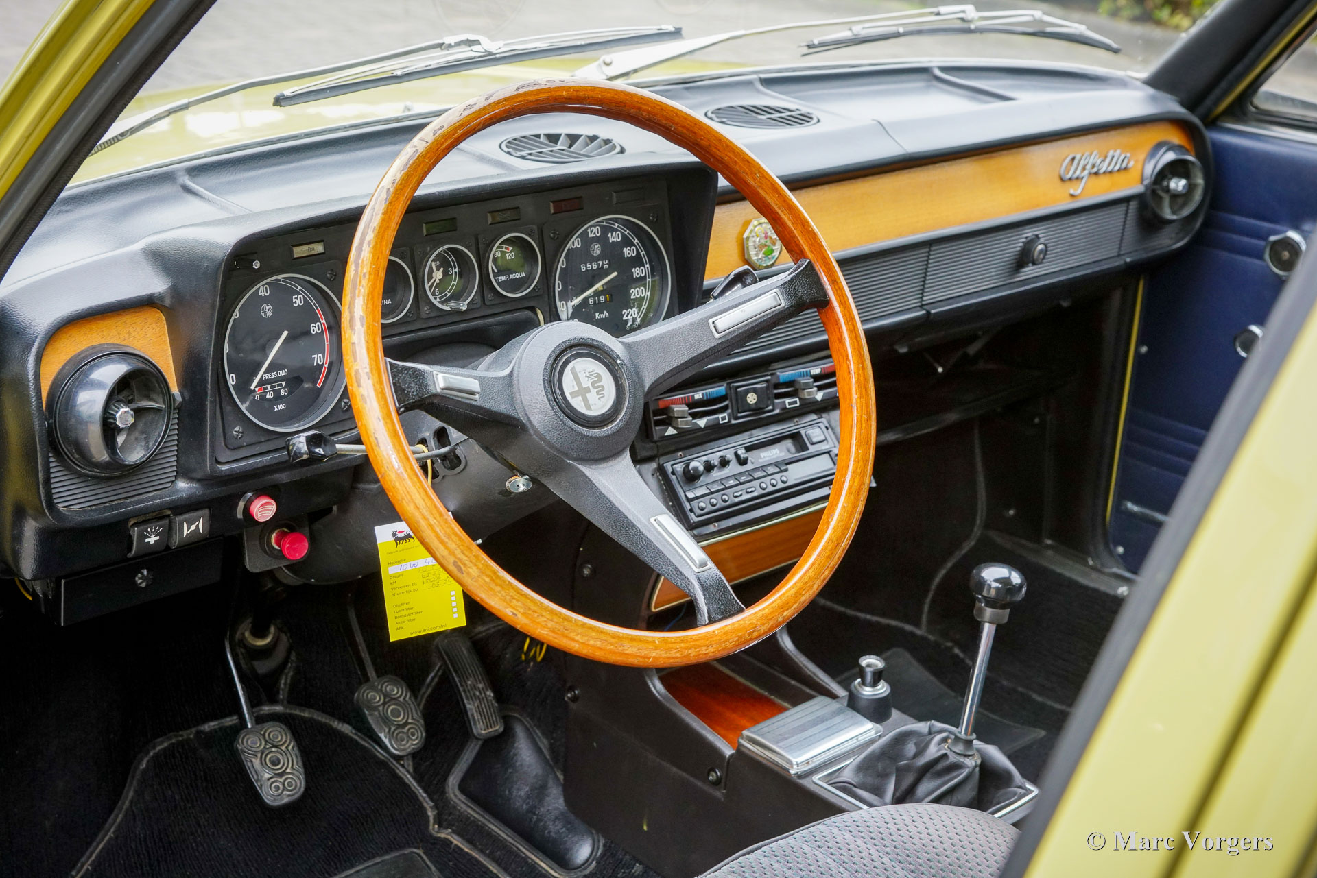 Alfa Romeo Alfetta 1800, année 1972. Couleur jaune pâle (Giallo Piper, code couleur AR AR116) associée à un intérieur en tissu bleu. Cette magnifique Alfetta 1800 fut vendue neuve en Italie, l'automobile fut importée aux Pays-Bas en décembre 2001. Le compteur indique actuellement 65,679 kilomètres. Les Alfetta du début des années 1970 sont un spectacle rare à notre époque. Ce bel exemplaire est dans un très bon état. La carrosserie saine a reçu par le passé une nouvelle peinture dans la couleur d'origine. La voiture fut bien entretenue au fil des années ; les factures d'entretien et de réparation sont présentes. L'Alfa Romeo Alfetta fut introduit en 1972. Il s'agissait de la première berline Alfa Romeo de taille moyenne en dix ans. Alfa Romeo a introduit la nouvelle boîte de vitesses/transmission finale « Transaxle » montée à l'arrière sur l'Alfetta, qui a permis une répartition du poids presque parfaite de 50/50. Ajouté à la suspension entièrement indépendante, au moteur sportif et puissant à double arbre à cames en aluminium, aux freins à disque sur les quatre roues et à la boîte de vitesses à cinq rapports, l'Alfetta était une véritable berline sport ! Ce bel exemplaire offre l'expérience de conduite telle que voulue par les designers, un merveilleux mélange de confort et de sportivité. Le bruit du moteur est une musique pour les oreilles des passionnés. La voiture est bien documentée et complète avec deux jeux de clés d'origine.