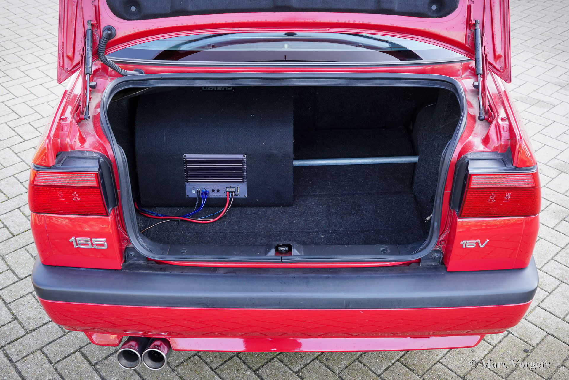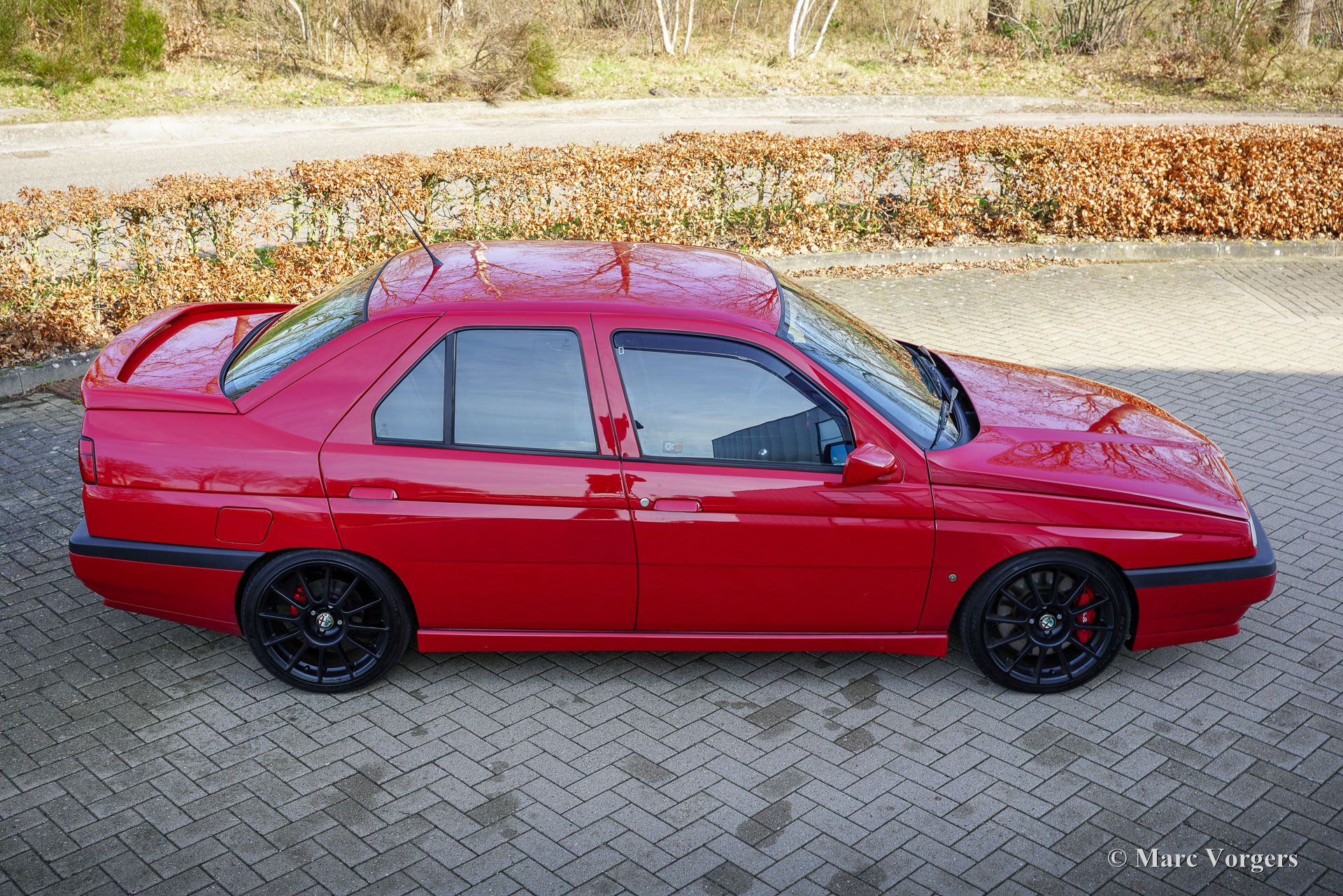 Alfa Romeo 155 Twin Spark 2.0 16V, année 1995 (première immatriculation le 23 juin 1995). Numéro de châssis : ZAR16700000128500. Extérieur Rosso Alfa AR 501, rehaussé de superbes jantes Abarth 500 Esseesse noires de 17 pouces. Intérieur Q4 noir/gris avec sièges mi-cuir et moquette anthracite. Cette Alfa Romeo 155 Twin Spark 2.0 16V fut vendue neuve aux Pays-Bas. Provenant de son troisième propriétaire, elle affiche 173 754 kilomètres au compteur. L’Alfa Romeo 155 a connu un grand succès dans les championnats allemand DTM et britannique BTCC. Ses précédents propriétaires lui ont conféré un superbe look « DTM » avec une assiette élargie, des jantes en alliage chaussées de pneus taille basse qui remplissent parfaitement les passages de roue. Parmi ses autres atouts sportifs, on retrouve l'aileron arrière d'origine de la 155, les étriers de freins Brembo à 4 pistons sur les quatre roues, un système d'échappement EPS à gros diamètre, un kit de suspension spécifique, un pont antirapprochement Fusion, un volant sport Momo et une puce Squadra intégrée au système de gestion moteur. Cette Alfa Romeo sportive fut méticuleusement entretenue au fil des ans et se trouve en excellent état ! La courroie de distribution et son tendeur furent récemment remplacés, de même que les coussinets de bielle. Ont également été remplacés : l'embrayage (complet), les disques et plaquettes de freins, les flexibles de freins, les pneus, le filtre à air BMC, les bougies d'allumage, les bras de suspension, les roulements de roues et enfin les emblèmes Alfa Romeo. Nous avons photographié la voiture avant son polissage et son detailing, car elle sera prochainement prise en charge par notre atelier de peinture spécialisé pour une finition parfaite. Après cela, elle sera encore plus belle qu'en photo ! Il s'agit d'une magnifique Alfa Romeo 155 Twin Spark 2.0 16V en version DTM à carrosserie large, offrant des performances exceptionnelles !