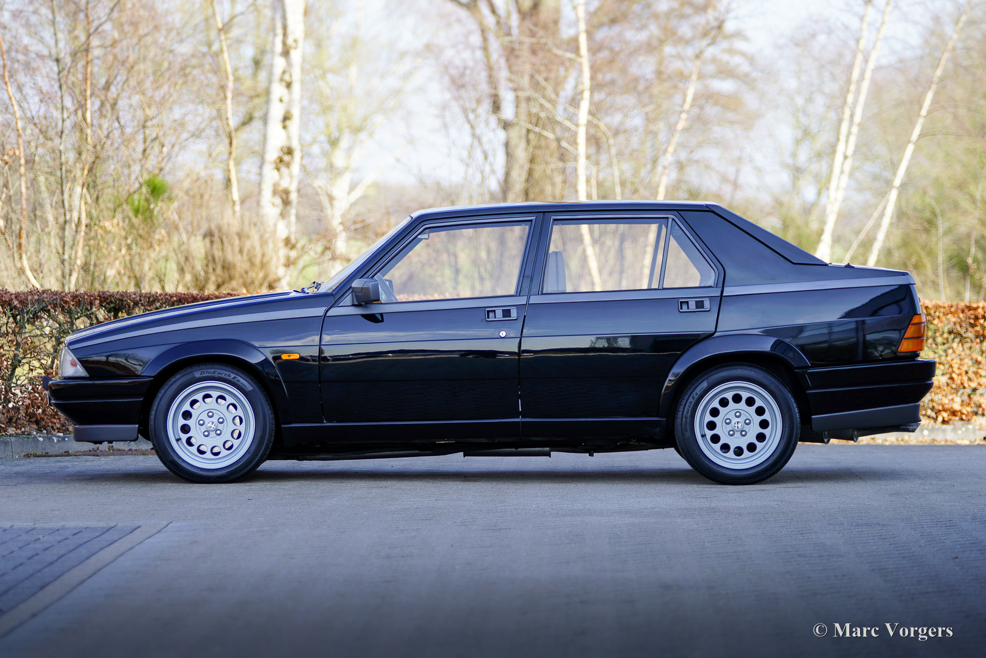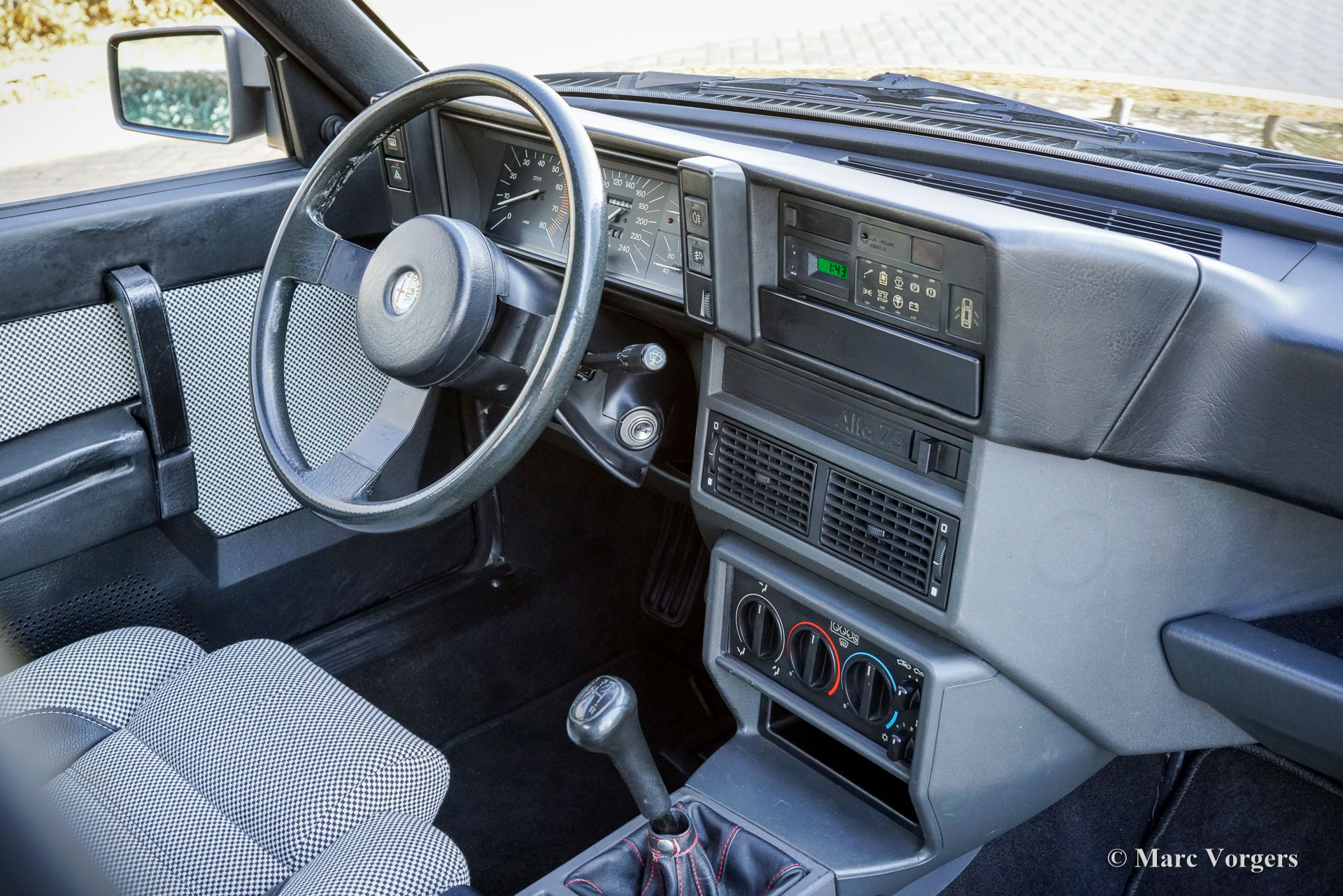 Alfa Romeo 75 1.8 Turbo, année 1986 (première immatriculation le 1er janvier 1986). Numéro de châssis ZAR162B1000050918. Extérieur noir (Nero AR 913) et intérieur noir, gris foncé et gris clair. Les sièges, comme neufs, sont revêtus de tissu à carreaux (gris très clair et gris foncé) avec des empiècements en cuir gris foncé sur les assises des sièges avant. Cette magnifique Alfa Romeo 75 Turbo fut vendue neuve en Italie. Elle est équipée d'une climatisation d'origine, une option très rare ! Il y a quelques années, cette superbe voiture fut restaurée par le célèbre atelier Museo Fratelli Cozzi de Legnano, en banlieue milanaise. Le moteur et la boîte de vitesses furent révisés et un magnifique intérieur flambant neuf a été installé. En 2024, la voiture fut importée aux Pays-Bas. Récemment, la peinture fut perfectionnée et traitée avec un glaçage Labocosmetica, et de nouvelles jantes en alliage Ronal d'origine furent montées. Les factures d'entretien sont disponibles. Afin de parfaire cette rare Alfa Romeo 75 Turbo, nous avons acquis des feux arrière neufs d'origine et une barre de réflecteurs arrière qui seront installés prochainement. Cette superbe Alfa Romeo 75 1.8 Turbo affiche seulement 101 511 kilomètres au compteur. La voiture est dans un état exceptionnel, proche du neuf, et se conduit comme une voiture neuve ! Vous aurez bien du mal à trouver un autre exemplaire dans un état aussi impeccable ! Les chiffres de production exacts de l'Alfa Romeo 75 1.8 Turbo sont inconnus, mais Alfa Romeo devait en produire au moins 5 000 pour obtenir l'homologation FIA pour les voitures de tourisme du Groupe A. Sous le capot, vous trouverez le moteur quatre cylindres en ligne de 1 800 cm³, équipé d'un turbocompresseur Garrett T3 et d'un intercooler, développant 155 ch et 226 Nm de couple. Le turbo offrait à la 75 des performances remarquables pour son époque, avec une vitesse de pointe de 210 km/h et une accélération de 0 à 100 km/h en 7,6 secondes. (Et c'est toujours très rapide avec le léger sifflement du turbo dans vos oreilles !) Ces chiffres plaçaient la 75 Turbo parmi les meilleures berlines compactes de direction de son temps. Saisissez l'opportunité d'acquérir une Alfa Romeo 75 1.8 Turbo dans un état de collection quasi parfait, provenant du prestigieux Museo Fratelli Cozzi !