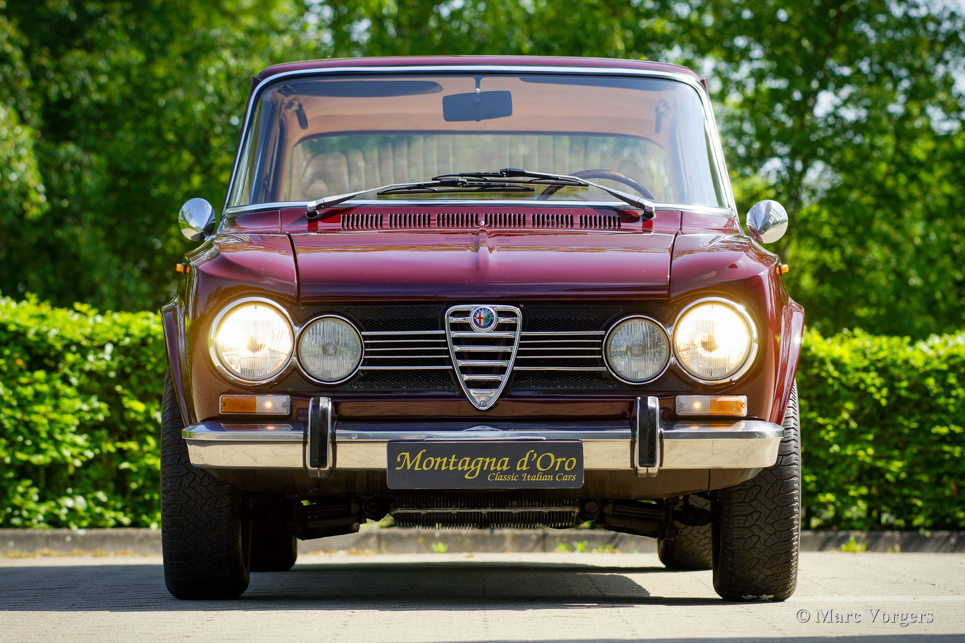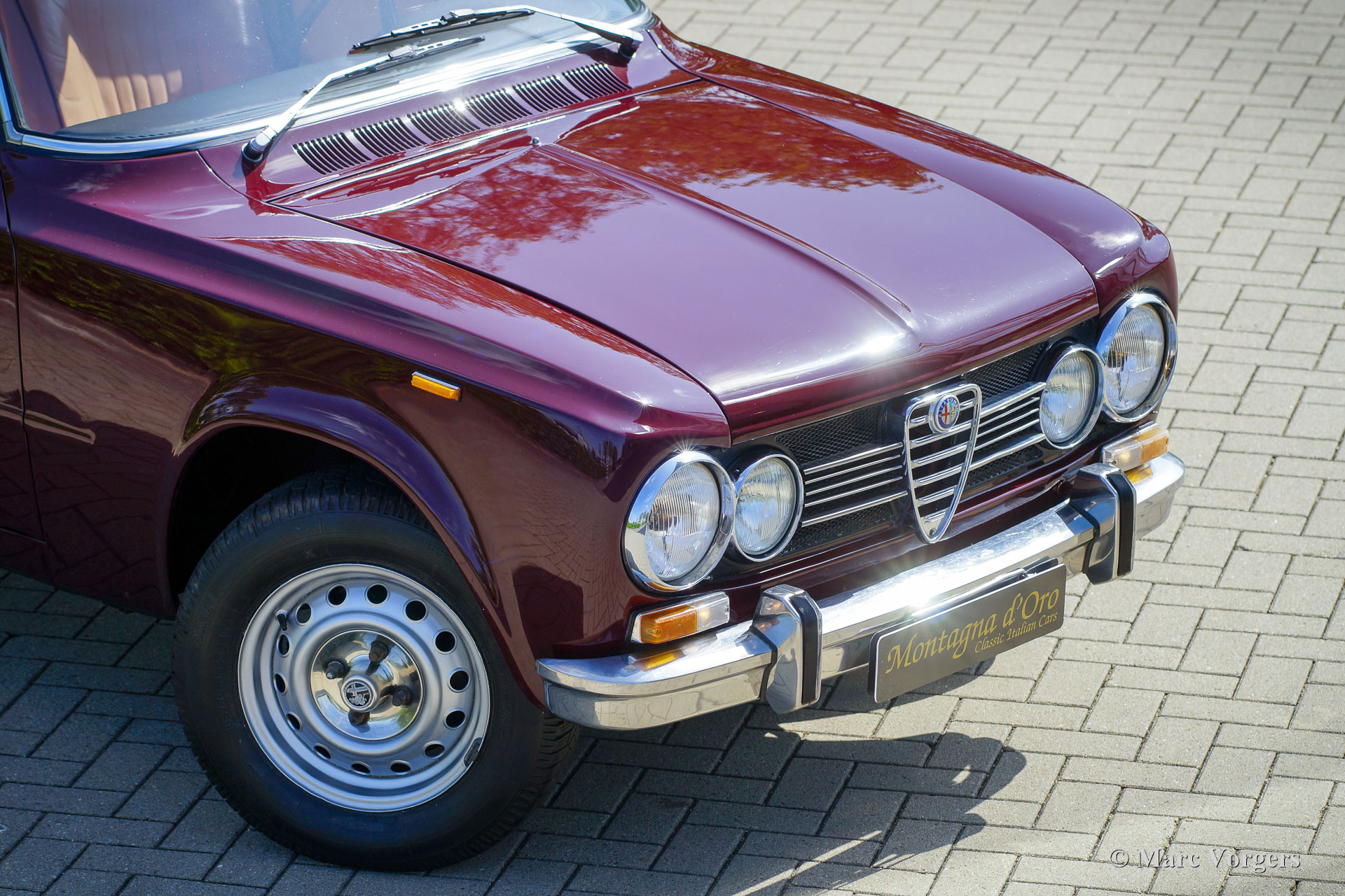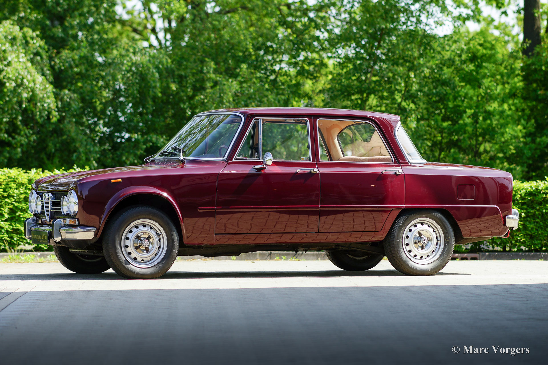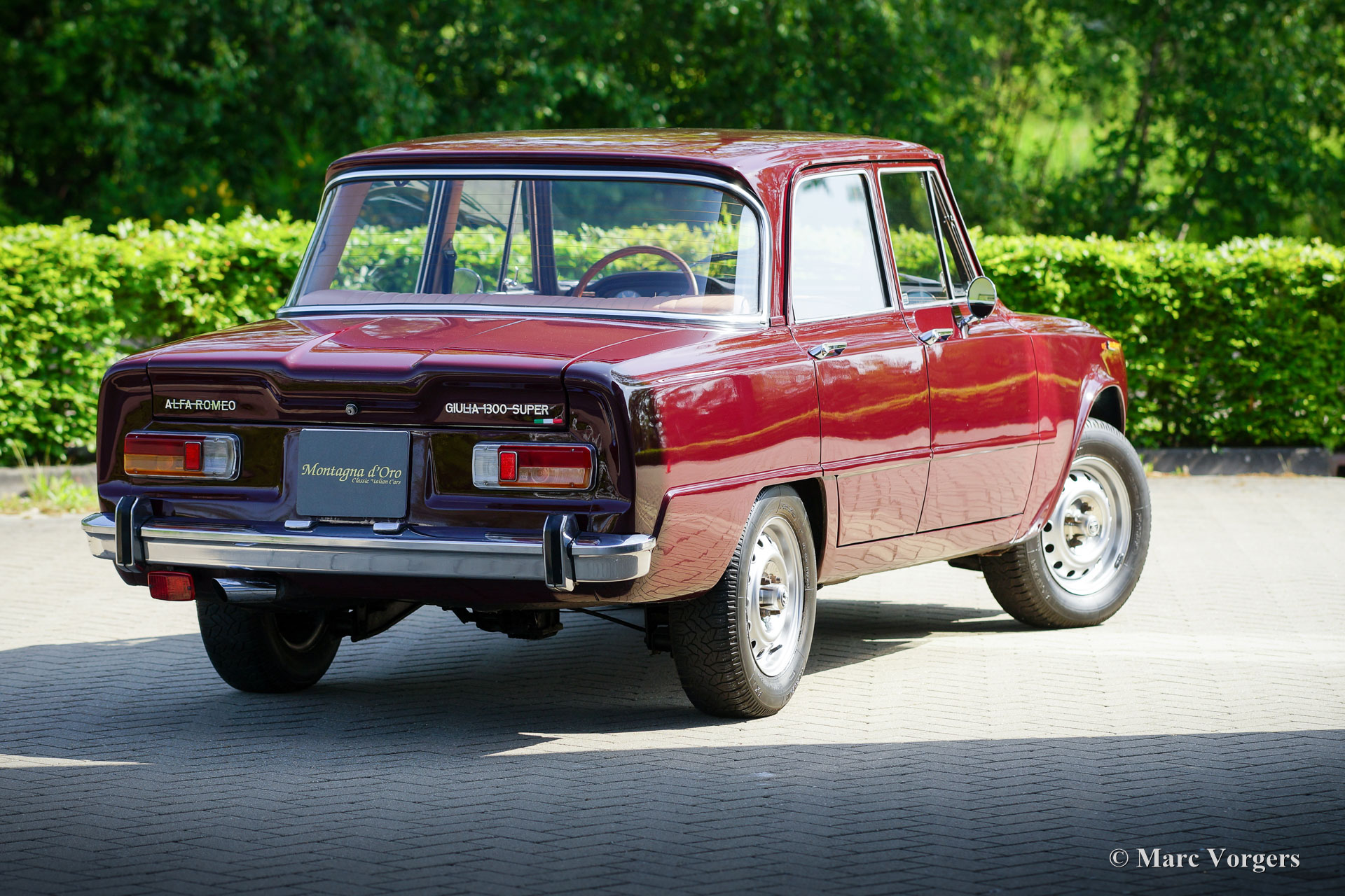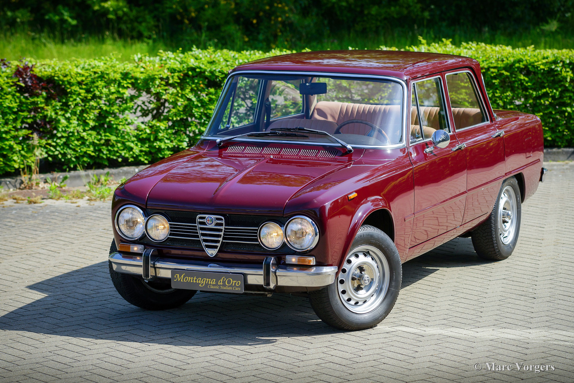 Alfa Romeo Giulia 1300 Super, année 1972. Couleur rouge foncé (Rosso Amaranto) combinée à un intérieur en cuir beige garni de passepoil rouge foncé et de moquette noire. Cette magnifique Alfa Romeo Giulia Super fut importé aux Pays-Bas en 1990. La voiture est chez le dernier propriétaire depuis 2005. Le compteur affiche actuellement 39,139 kilomètres. Au cours des dernières années, la voiture prenait la poussière dans le garage, alors le propriétaire a décidé de vendre cette beauté. La voiture est dans un très bon et bel état avec quelques légères traces d'utilisation. La voiture a reçu un traitement antirouille Waxoyl dans le passé, seule une tache de corrosion est présente dans la partie inférieure de l'aile avant droite. La carrosserie est très saine et l'ajustement des panneaux est parfait. Les sièges et les panneaux intérieur de porte sont recouverts de cuir fauve; Une mise à niveau coûteuse, qui donne à l'intérieur une touche et une sensation très luxueuses ! Le tableau de bord et le tapis en caoutchouc sont en excellent état. Conduire et regarder le tableau de bord en placage de bois et les merveilleuses jauges donne toujours une sensation très spéciale. La voiture est équipée d'un moteur quatre cylindres de 1300 cm3 avec deux arbres à cames en tête, une boîte de vitesses à cinq rapports et des freins à disque autour ; très avancé pour une voiture familiale de 1972 ! La voiture recevra un service complet et un réglage avant d'être remise à un nouveau propriétaire fier. Cette Giulia Super est équipée des jantes en acier de 14 pouces d'origine, des pneus Michelin 185/70, de deux rétroviseurs montés sur les portes, d'un volant avec jante en bois et du cric d'origine. Cette Alfa Romeo Giulia 1300 Super réalisera le rêve de voiture du passionné d'Alfa Romeo classique !