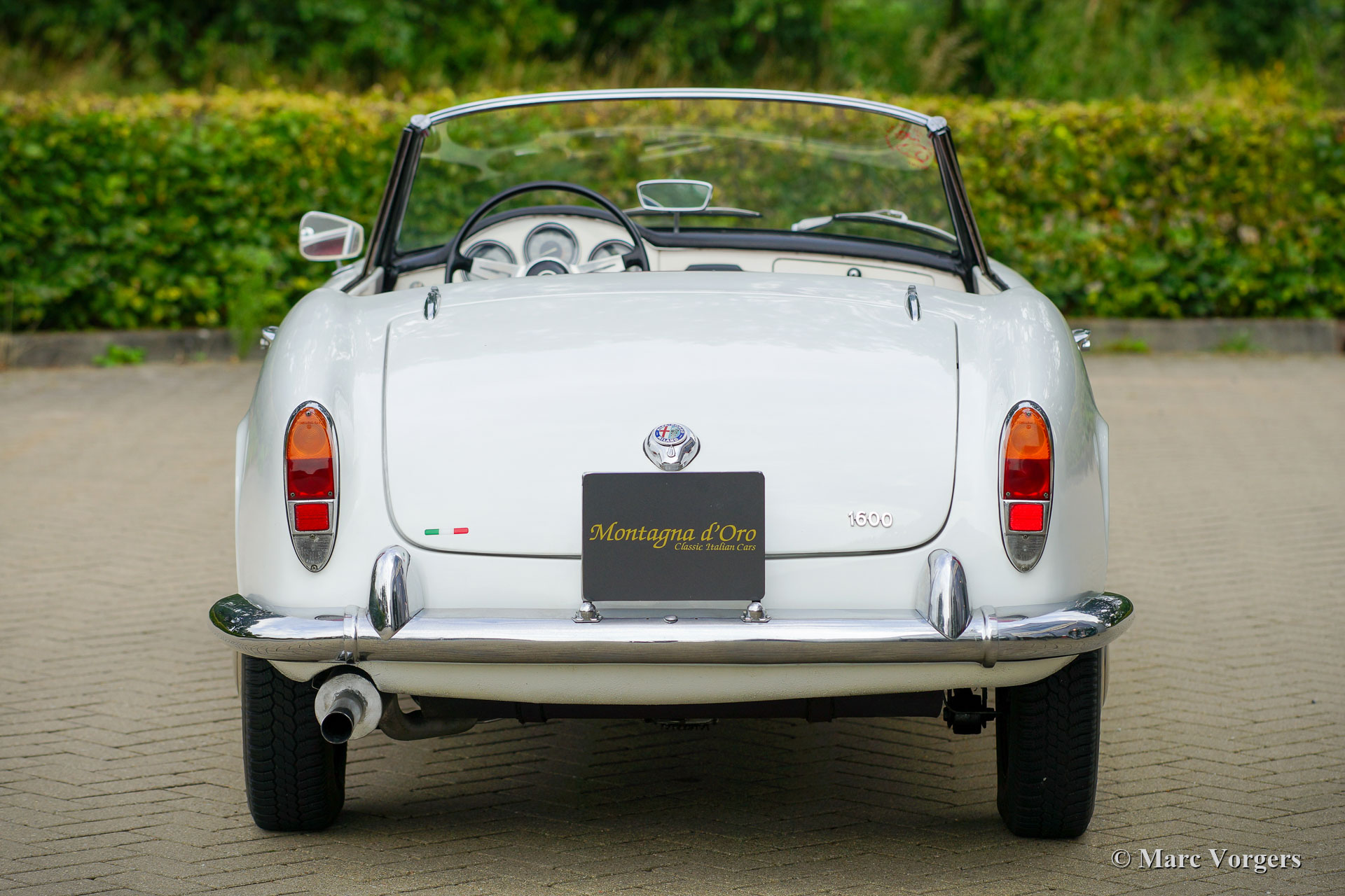 Alfa Romeo Giulia 1600 Spider, 1964. Cette très belle Alfa Romeo Giulia 1600 Spider a été importée aux Pays-Bas en 1999. Le compteur kilométrique affiche actuellement 124.306 kilomètres. Avec le moteur de 1600 cm3 à double arbre à cames, cette Giulia dispose du moteur le plus puissant disponible de neuf. Le moteur fut révisé et il fonctionne parfaitement. L'automobile a passé des années dans la collection d'un passionné de voitures italiennes. Récemment, la voiture a été révisée, y compris la révision des freins. Un nouvel échappement est prêt à être monté. Cette belle Giulia 1600 Spider est en bon état de conduite. La carrosserie n'a jamais été restaurée, la peinture présente quelques traces d'utilisation et d'âge. L'intérieur présente tous les détails d'origine et les housses de siège semblent avoir été renouvelées à un moment donné. Le compartiment moteur est magnifique ! Cette Giulia 1600 Spider offre à son fier propriétaire et à son passager chanceux l'ultime expérience de conduite à toit ouvert classique italien !