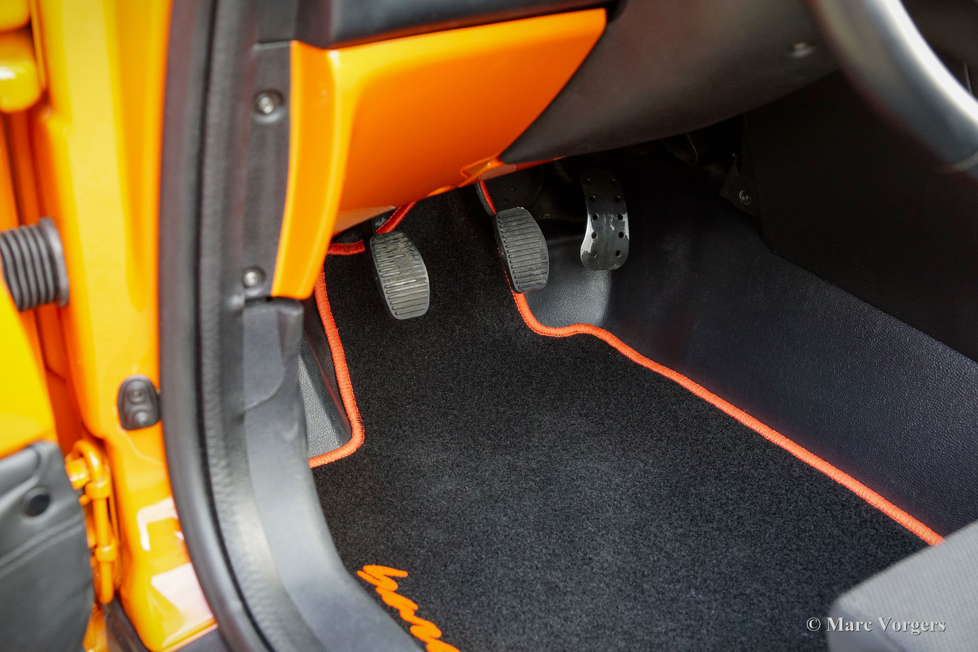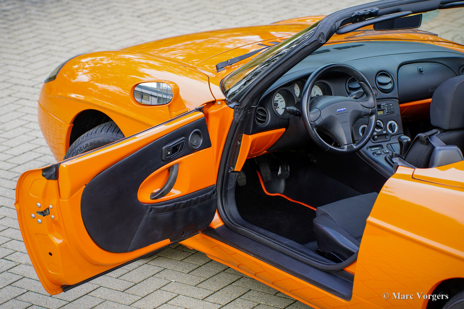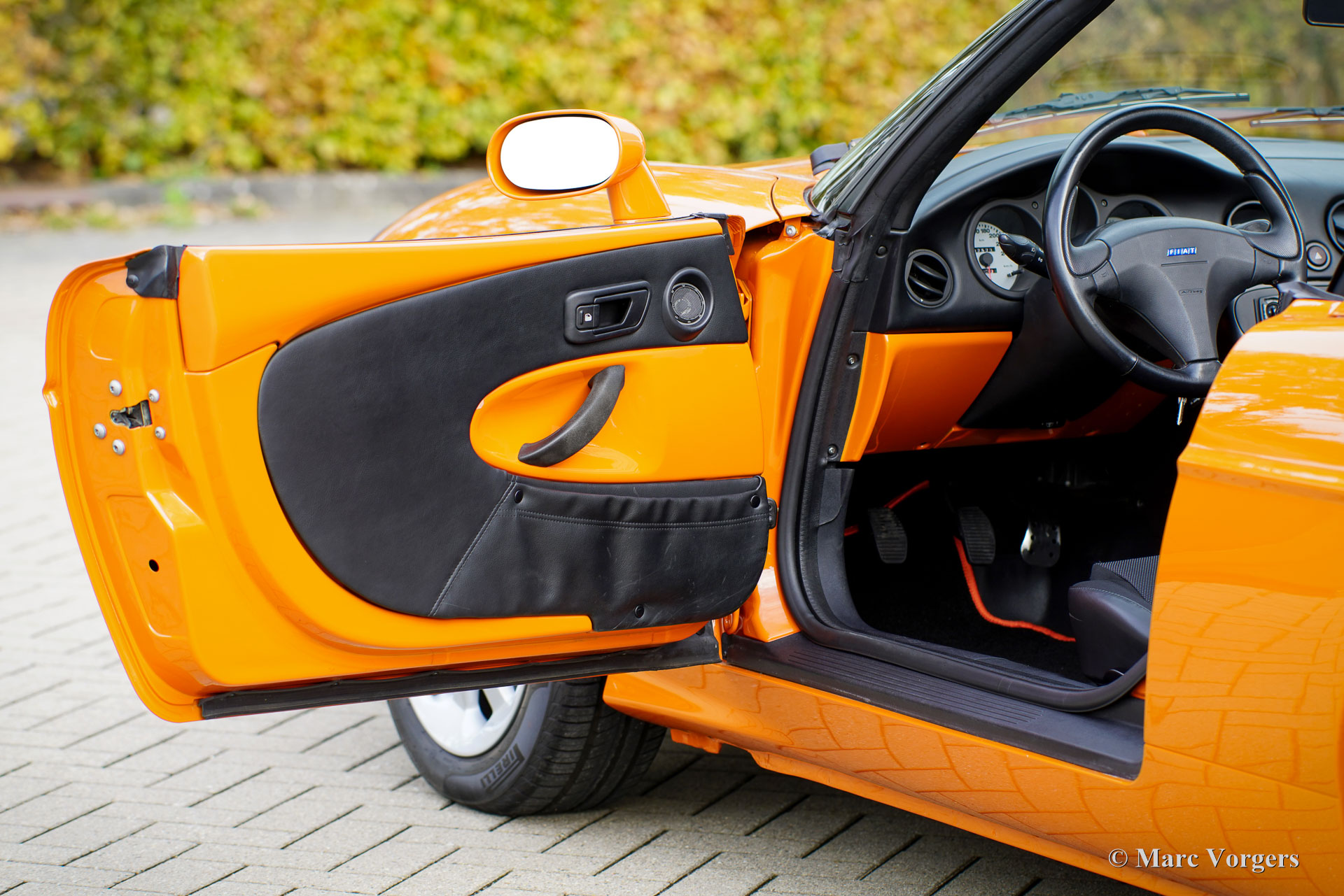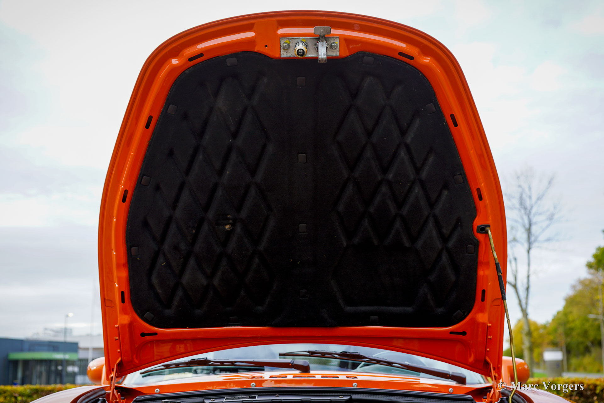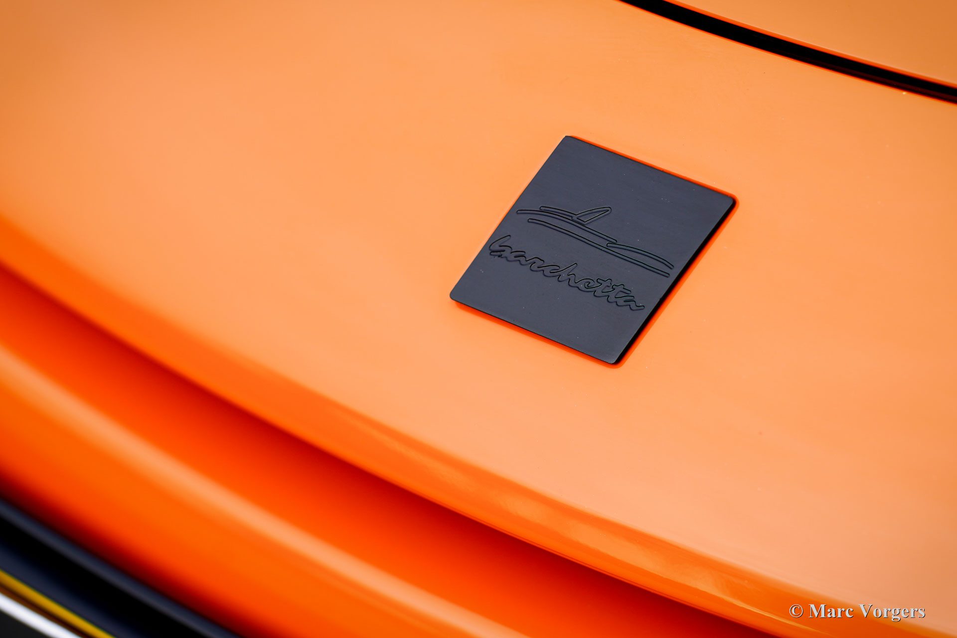 Fiat Barchetta « Black Edition », année 2000 (première immatriculation le 20 mai 2000). Numéro de châssis ZFA183000*00047225*, numéro de moteur 60586932. Carrosserie orange (Arancio Victoria 570) associée à un intérieur en tissu/cuir anthracite et moquette noire. Capote souple en vinyle noir et toit rigide couleur carrosserie. Cette magnifique Fiat Barchetta « Black Edition » fut vendue neuve aux Pays-Bas par Autohuis Ede van Wirdum. Choyée par trois propriétaires successifs depuis sa mise en circulation, elle affiche 87 574 kilomètres au compteur. Dessinée par Andreas Zapatinas au Centro Stile de Fiat et lancée en 1995, la Fiat Barchetta est un roadster italien compact et sportif, dans l'esprit des voitures de sport italiennes légères. Son nom, Barchetta, signifie « petit bateau ». Cette voiture, basée sur la plateforme de la Fiat Punto, est équipée d'un moteur quatre cylindres de 1 800 cm³ développant 131 ch, associé à une boîte de vitesses manuelle à cinq rapports et à une traction avant. Cette « Black Edition » bénéficie d'un pack d'options exclusif comprenant des garnitures intérieures contrastantes noires (portes et tapis de sol en velours), des arceaux de sécurité noirs, un logo avant noir, des jantes en alliage et un système audio Fiat haut de gamme avec RDS et lecteur CD. Ce magnifique exemplaire fut repeint par un professionnel ; il est comme neuf ! Son historique d'entretien est complet et documenté. Le carnet d'entretien fut rempli et tamponné avec précision jusqu'à la dernière révision à 87 062 kilomètres. Ce superbe véhicule est vendu avec son hard-top et sa housse de protection Fiat d'origine. Un « classique moderne » très recherché !