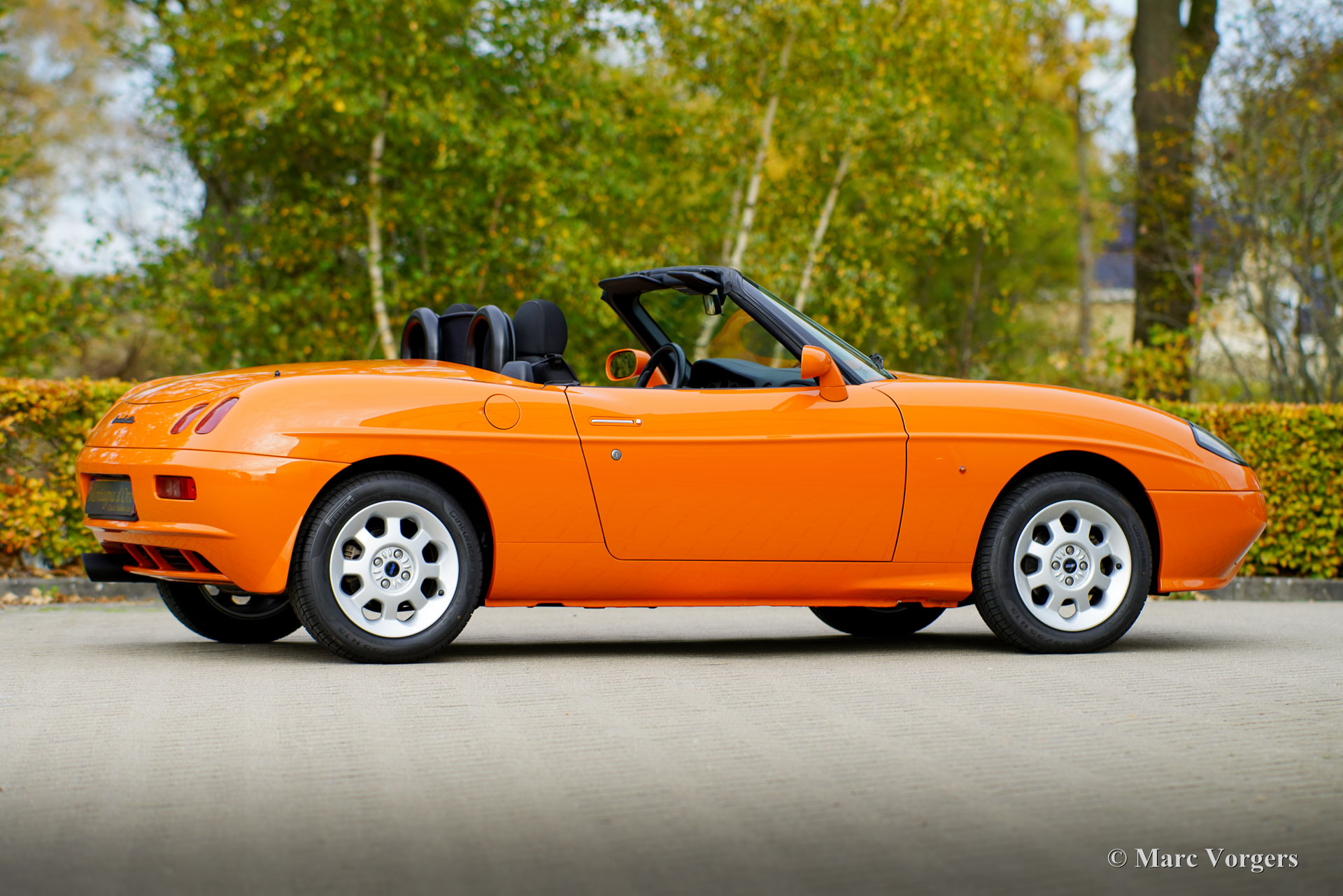 The Fiat Barchetta was presented in 1995 as a compact two-seat roadster designed to revive the spirit of Italian open-top motoring. Its name, meaning “little boat” in Italian, deliberately echoed the tradition of lightweight sports cars from the post-war era. Development had begun in 1990 under the project name *Tipo B Spider 176*, with styling overseen by Andreas Zapatinas and Alessandro Cavazza at Fiat’s Centro Stile. The prototype work was carried out by Stola, while Peter Davis contributed to the interior design. Built upon the Fiat Punto platform, the Barchetta featured a shortened wheelbase to enhance agility and driving pleasure. Power came from a 1.8-litre DOHC four-cylinder engine with variable valve timing, producing 131 PS. This allowed the car to accelerate from 0 to 100 km/h in 8.9 seconds and reach a top speed of around 200 km/h. Assembly was initially entrusted to the coachbuilder Maggiora at Chivasso, a company with a long tradition in Italian car production. When Maggiora closed in 2002, Fiat transferred production to its Mirafiori plant in Turin. The Barchetta was offered in several trim levels and special editions, often distinguished by unique colours and interior details. One of its most distinctive design features was the flush-fitting door handles, inspired by the Cisitalia 202 GT of the late 1940s. In 2003 the model received a facelift, with revised bumpers and minor mechanical updates. Production continued until 2005, marking a decade-long presence in Fiat’s line-up. Although never officially sold in right-hand drive markets such as the United Kingdom, it found popularity across continental Europe. Today the Barchetta is remembered as Fiat’s stylish attempt to rekindle the classic spider tradition in the modern era.