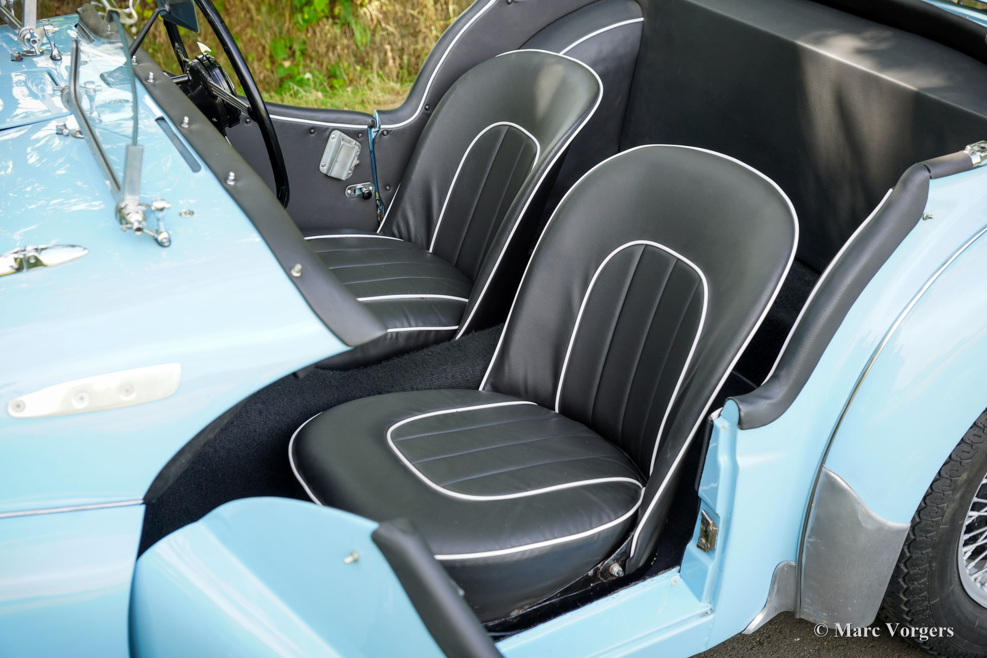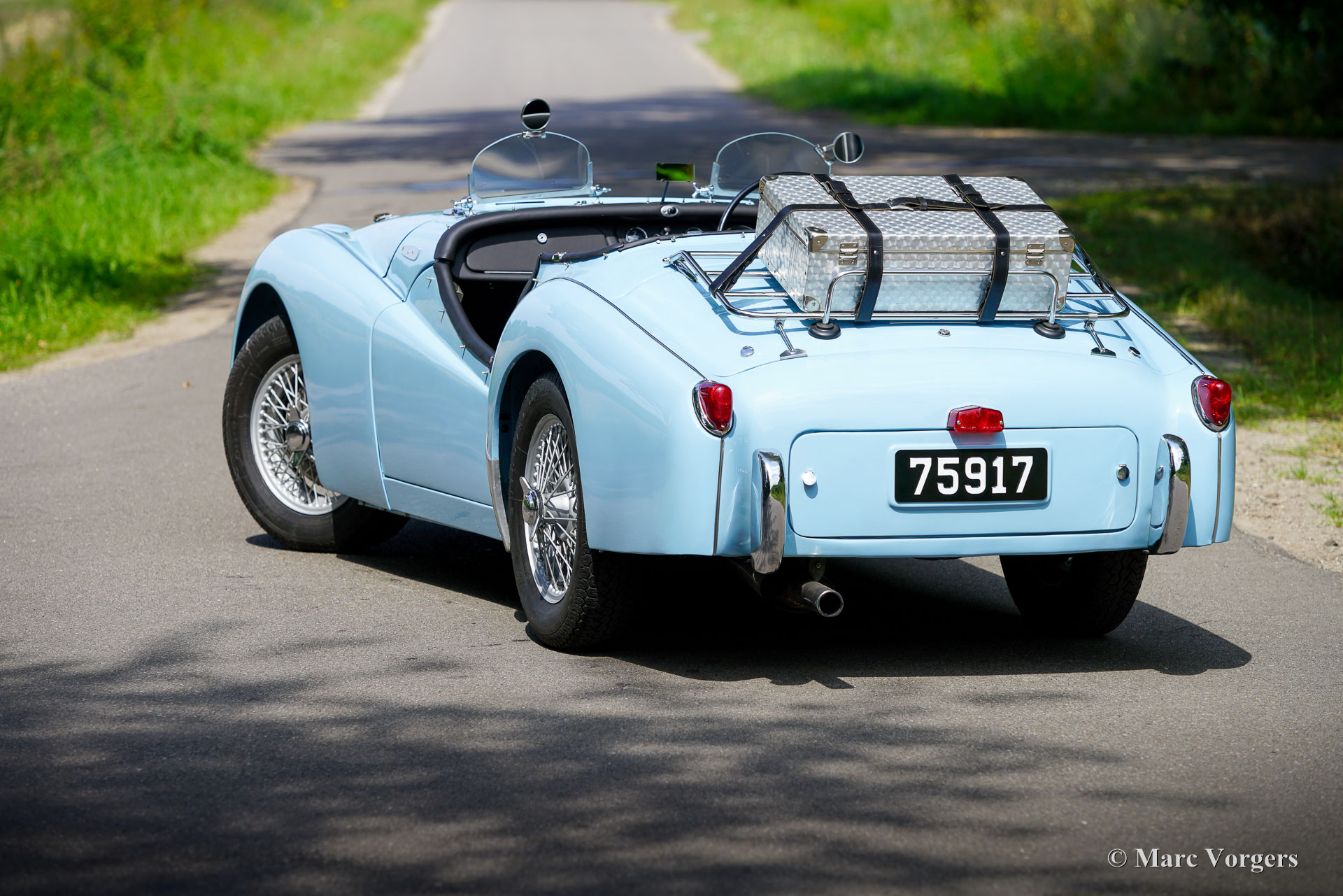 Triumph TR3 (‘small mouth’), année 1957. Numéro de châssis TS11721, numéro de moteur : S24168E, numéro de carrosserie EB10840. Cette fabuleuse Triumph TR 3 « petite gueule » (premier modèle avec la petite calandre) a été immatriculée pour la première fois le 30 janvier 1957. Le 11 juillet 2003, elle a trouvé un nouveau propriétaire au Luxembourg et, en 2025, elle a rejoint la collection de vente de S2 Classic Cars. Cette magnifique Triumph TR3 a été très bien entretenue au fil des ans. Le compteur affiche 92 155 miles. La voiture affiche une allure sportive et une couleur fantastique, et elle est équipée d'un overdrive. En juillet 2017, la carrosserie fut restaurée et repeinte (photos disponibles). Une fois la carrosserie terminée, l'intérieur a reçu une nouvelle sellerie en 2018. Le moteur et la boîte de vitesses ont également été révisés à cette époque (photos disponibles). Récemment (août 2025), la voiture fut entièrement remise au goût du jour dans l'atelier S2 Classic Cars. Les travaux suivants furent effectués : contrôle technique complet, révision des freins, y compris deux tambours Alfin neufs, nettoyage des carburateurs, microbillage des composants, révision et réglage, remplacement des durites d'essence, graissage et réglage des roulements de roue, réglage des soupapes, réparation d'une fuite sur l'essieu arrière, nettoyage du collecteur d'admission, pose d'un nouveau joint et remplacement des goujons. Un ventilateur de refroidissement plus grand fut installé, réparation du contacteur d'overdrive et de son câblage, remplacement de la courroie trapézoïdale, remplacement des points de contact et réglage de l'allumage, nettoyage des filtres à air, vidange et remplissage du système de refroidissement, et bien sûr, renouvellement et appoint de tous les liquides. La Triumph TR3 possède un glorieux passé de compétition automobile et de rallye des années 1950. Un roadster britannique robuste et sportif qui vous transporte dans le temps et offre un plaisir de conduite exceptionnel. Cette fantastique Triumph TR 3 est éligible aux 1 000 Miglia, ce qui signifie qu'un nouveau propriétaire peut s'inscrire pour participer à cette épreuve de régularité légendaire ! Une fantastique TR3 « petite gueule » en excellent état !