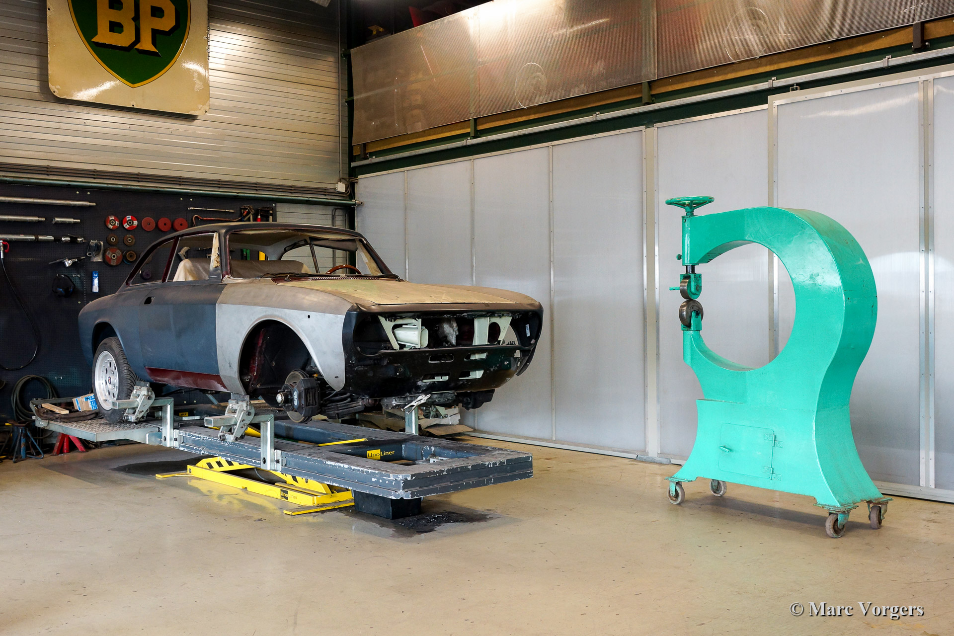 Réparation de carrosserie / reconstruction devant une Alfa Romeo GT 1300 Junior.
