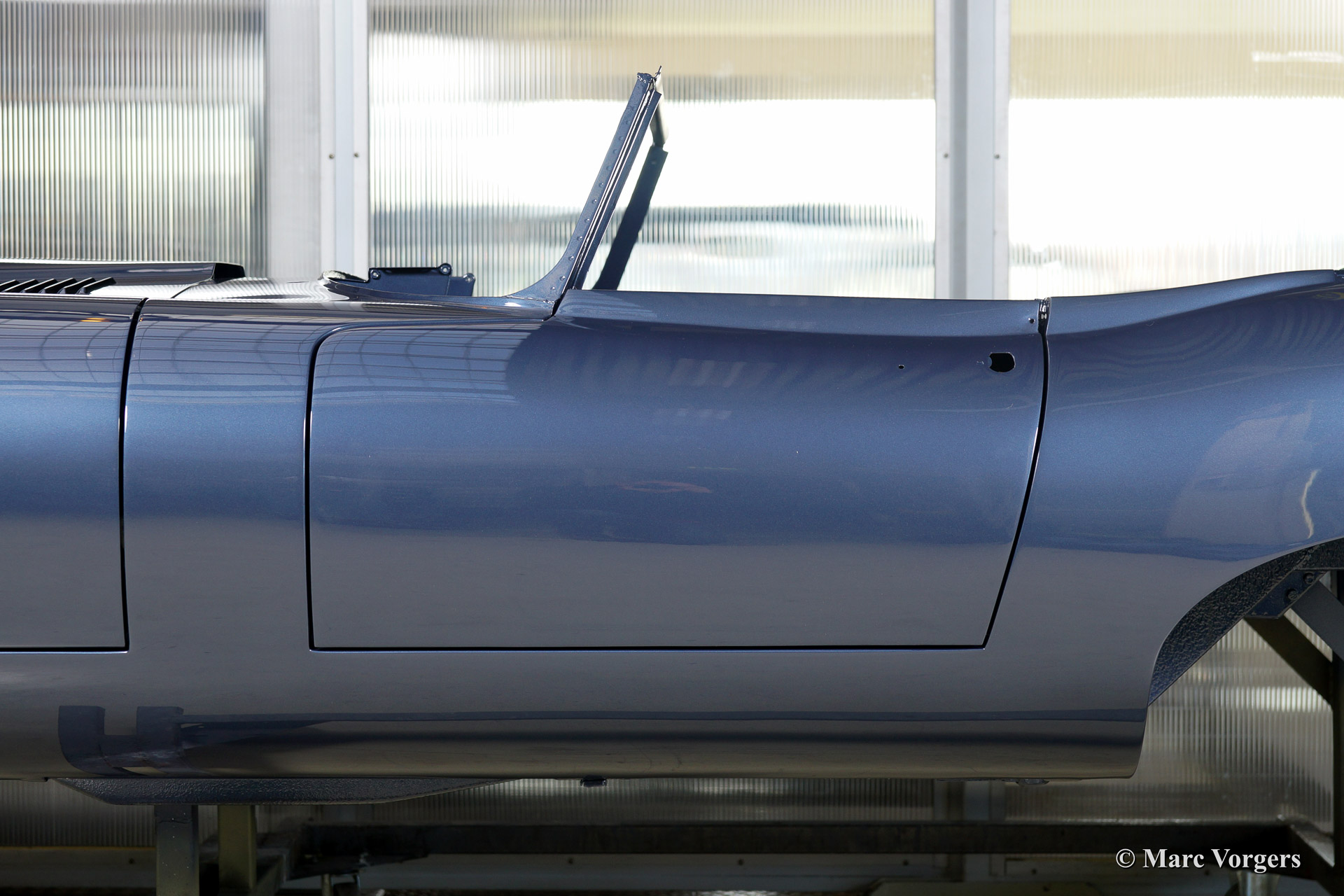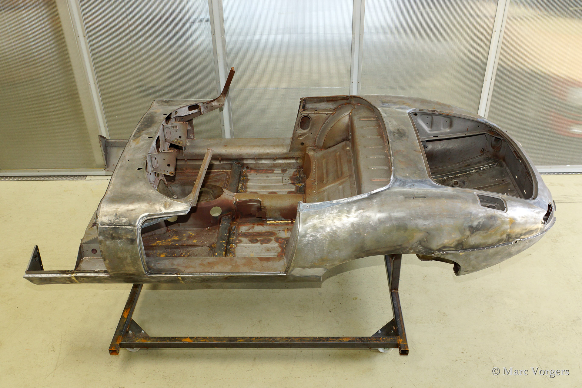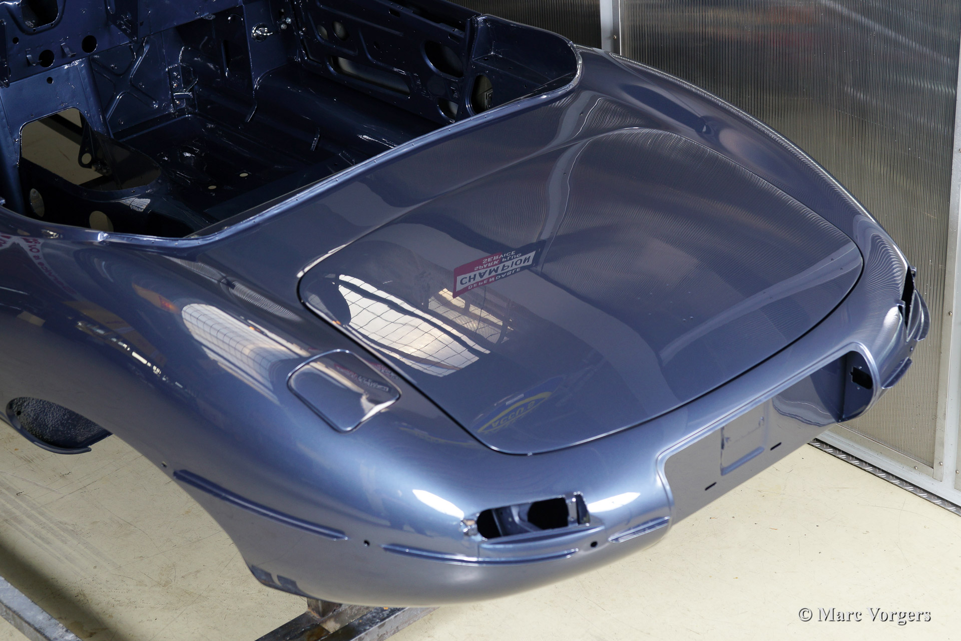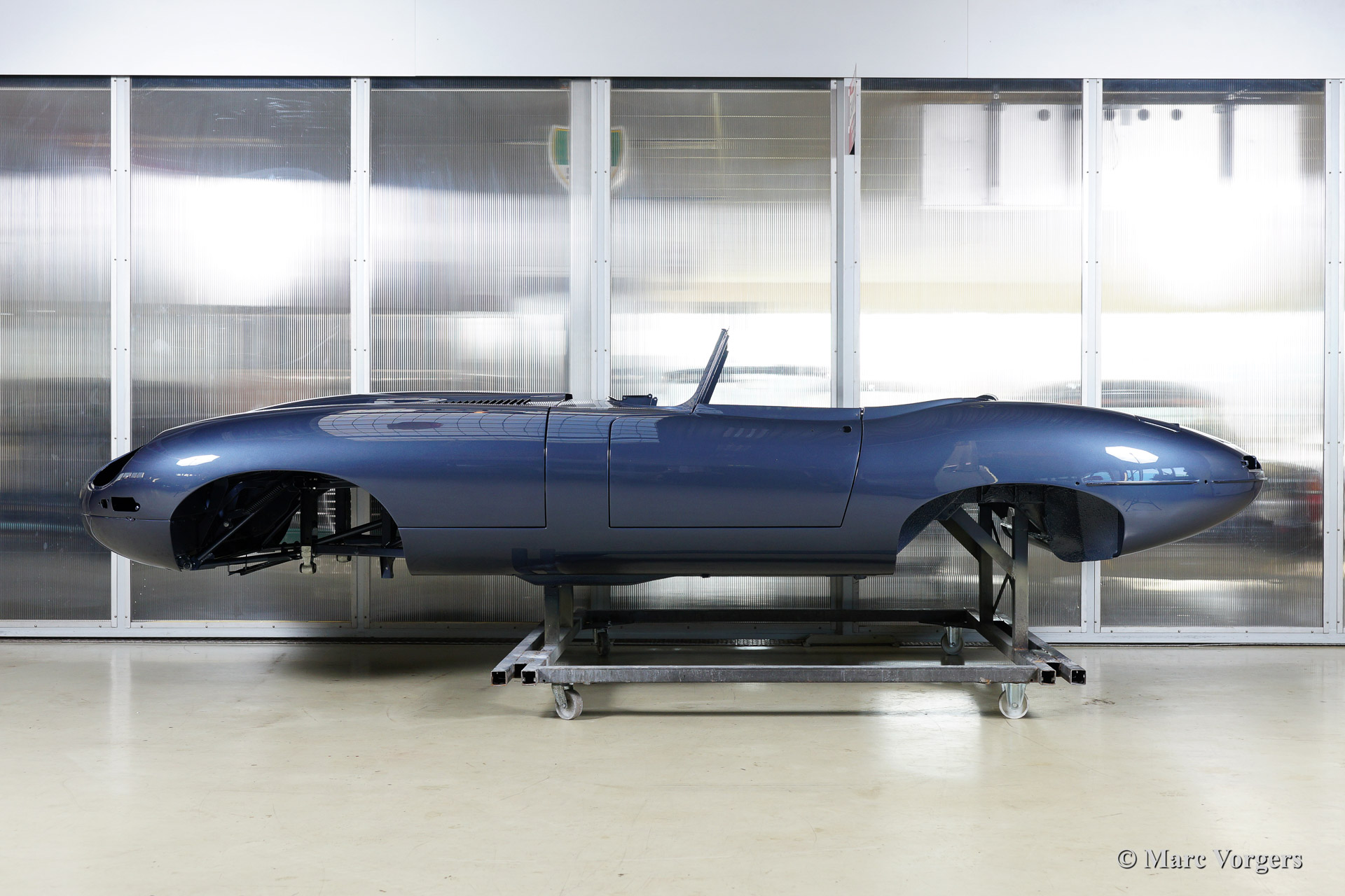 Ce fantastique Jaguar E-Type 3.8 Litre une série OTS (roadster) de l'annee 1964 est entièrement restauré pour un client. Ci-dessous vous voyez la restauration du carrosserie en détail. La carrosserie a été redressé, réparé et restauré très largement à cause de graves dommages ancienne. Le corps a été inspecté, peinture dépouillée, travail du métal effectué et époxy amorcée. Après que le carrosserie a été donné nouveau peinture parfaite dans la couleur Jaguar 'opalescent bleu' foncé.