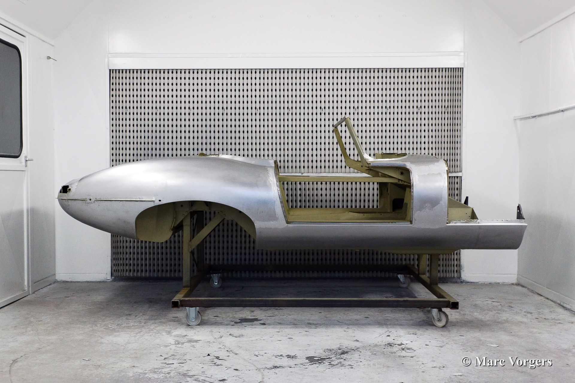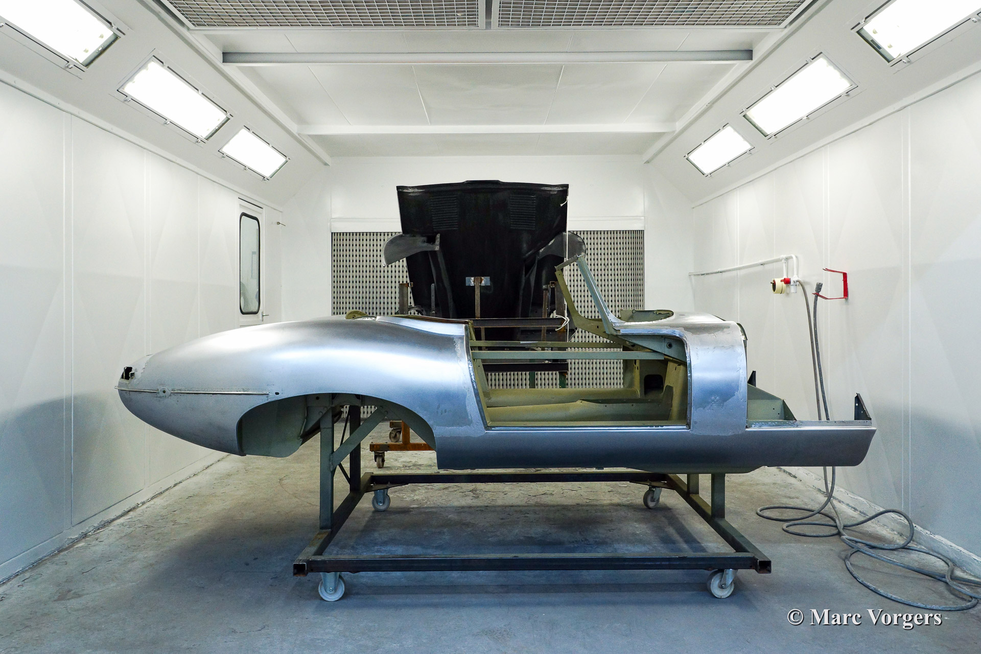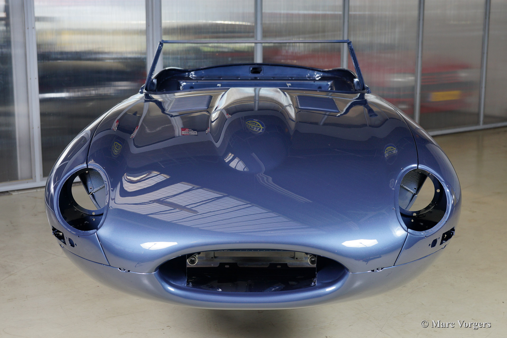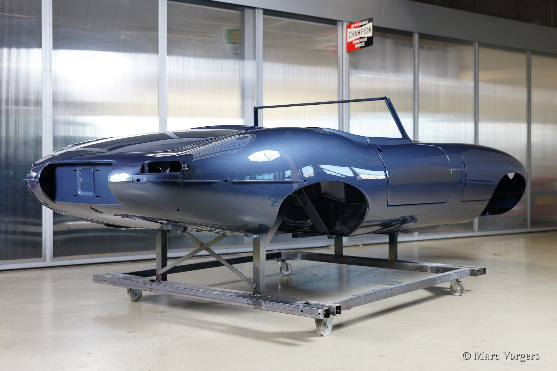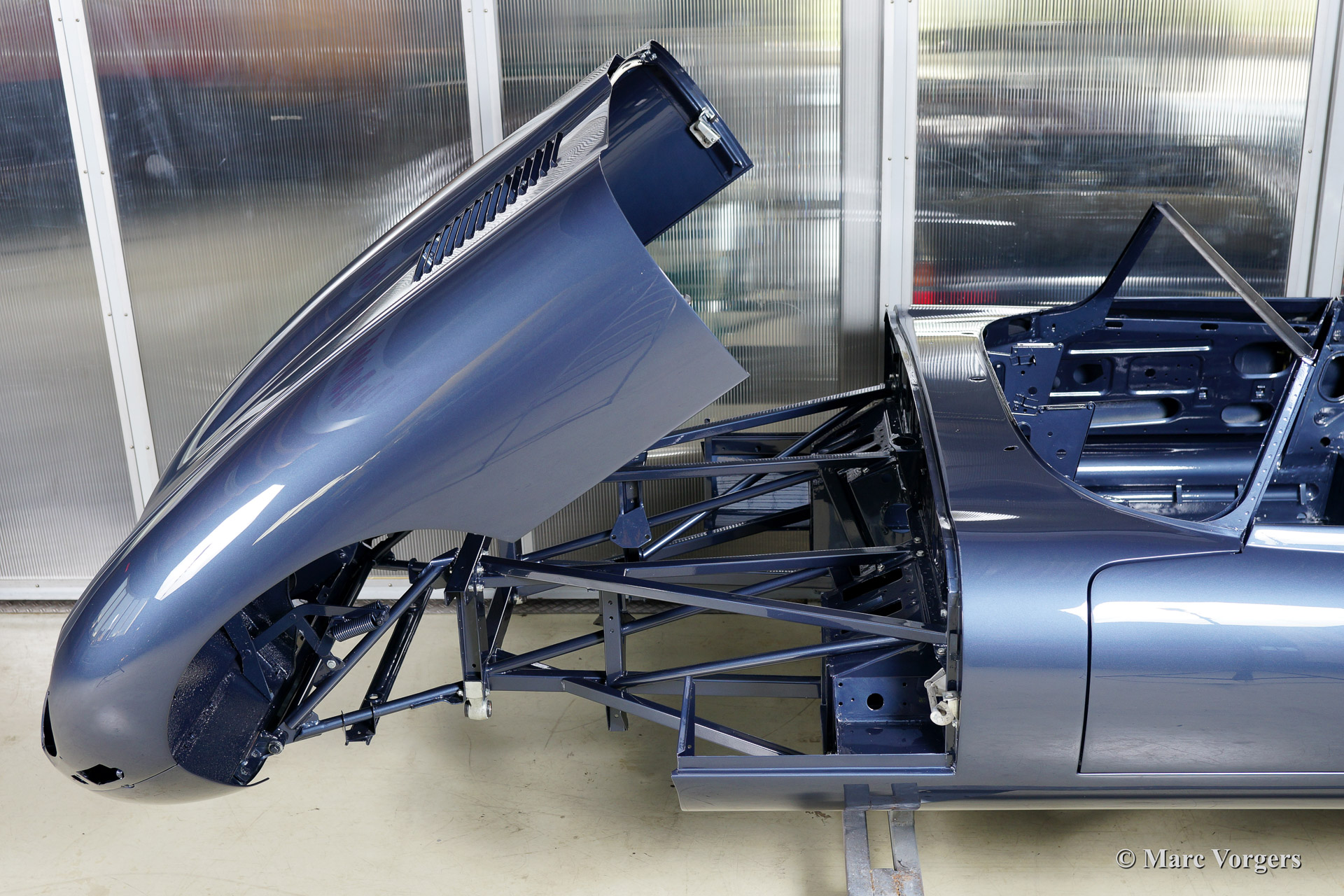 Ce fantastique Jaguar E-Type 3.8 Litre une série OTS (roadster) de l'annee 1964 est entièrement restauré pour un client. Ci-dessous vous voyez la restauration du carrosserie en détail. La carrosserie a été redressé, réparé et restauré très largement à cause de graves dommages ancienne. Le corps a été inspecté, peinture dépouillée, travail du métal effectué et époxy amorcée. Après que le carrosserie a été donné nouveau peinture parfaite dans la couleur Jaguar 'opalescent bleu' foncé.