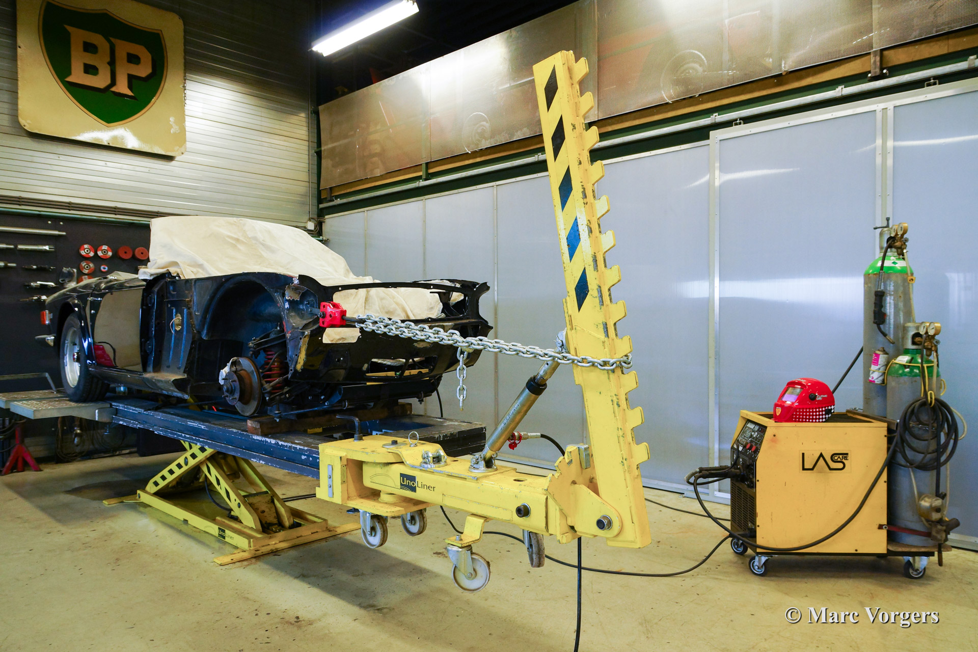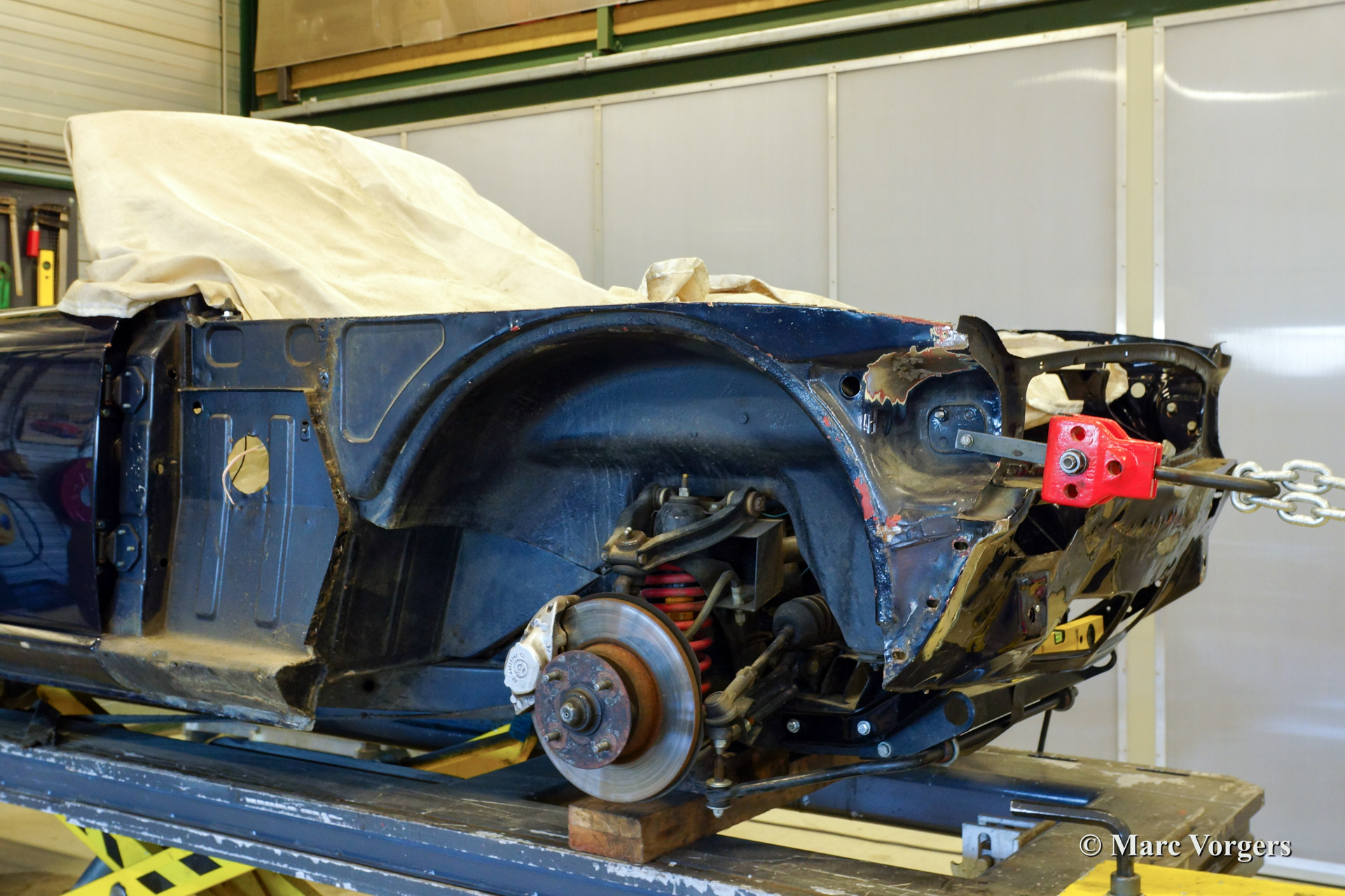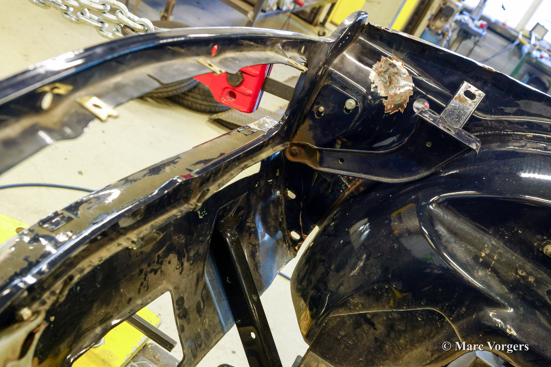 Hereby an example of the skills available at our garages. Here you see a Triumph TR 6 which was involved in an accident. The entire front has been straightened an then fully repaired. No trace of the damage can be found anymore.