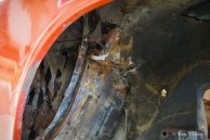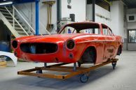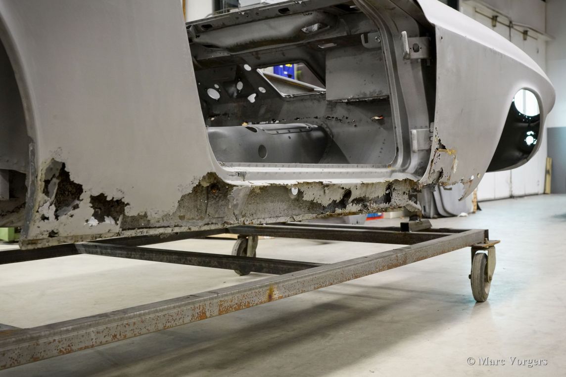 Cette Volvo P1800 S a été démontée par le propriétaire. La carrosserie est dans le pire état que nous ayons jamais vu pour une Volvo P1800 S. Les bas de caisse, la jupe arrière et le plancher de coffre ont presque entièrement disparu. Presque toutes les parties de la tôle situées en dessous de la taille nécessitent une réparation de la tôle. La carrosserie a été débarrassée des résidus de peinture et de colle dans un bain spécial. L'important travail de restauration de la tôle est terminé et la carrosserie va maintenant recevoir un revêtement KTL. Le revêtement KTL (cataphorèse) est un procédé de peinture électrostatique écologique qui consiste à immerger les pièces métalliques dans un bain liquide contenant une peinture cataphorèse à base d'eau. Ce procédé assure une couche de peinture uniforme et protectrice, même dans les endroits difficiles d'accès.